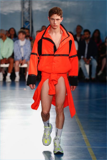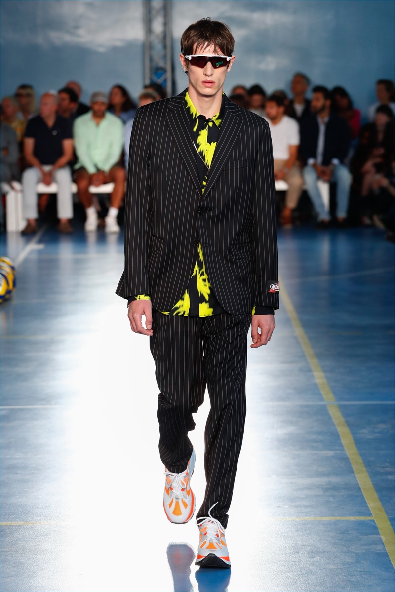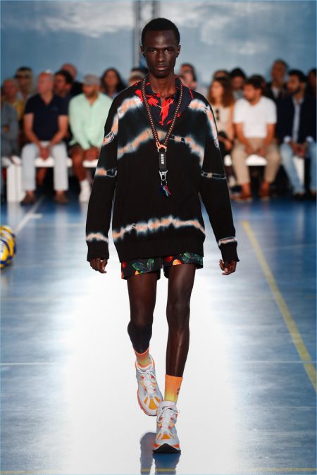 The collection features a bold splash of color with acid hues. Silk shirts join printed t-shirts, hoodies, tie-dye knits, and sports tops. There’s also plenty of denim for the season that includes striped prints.