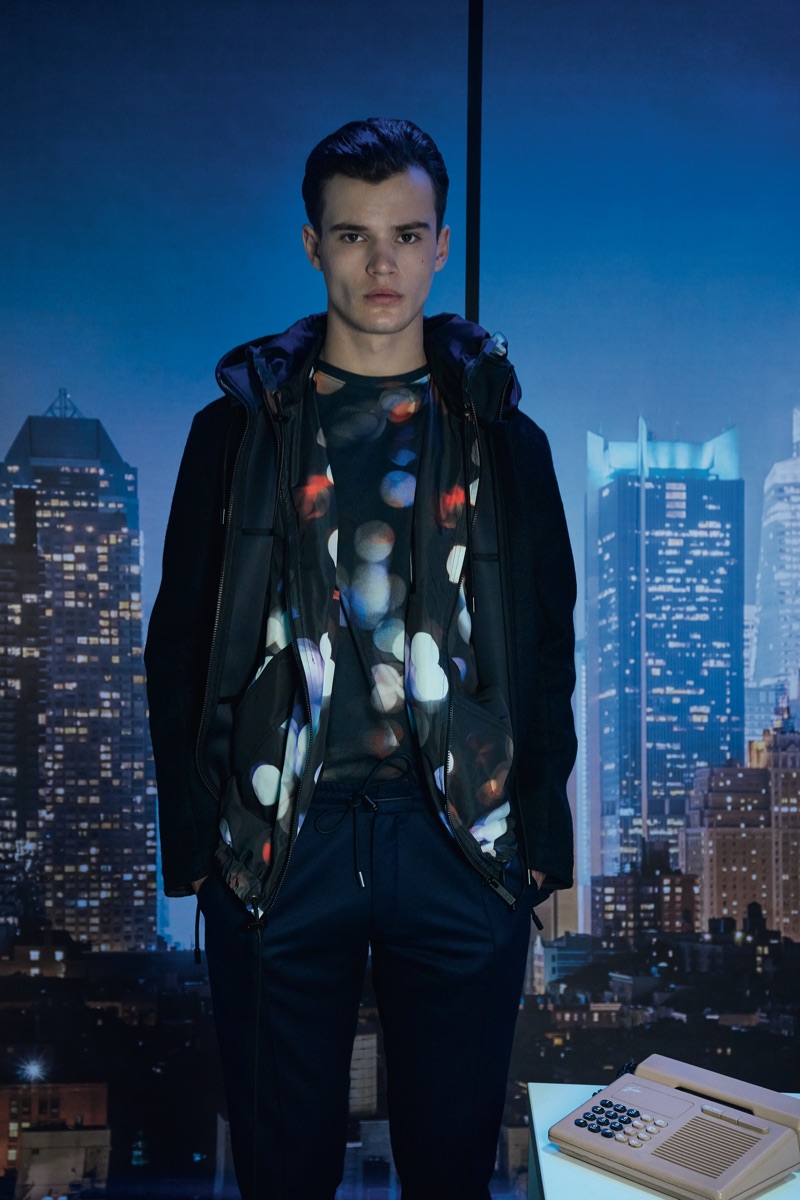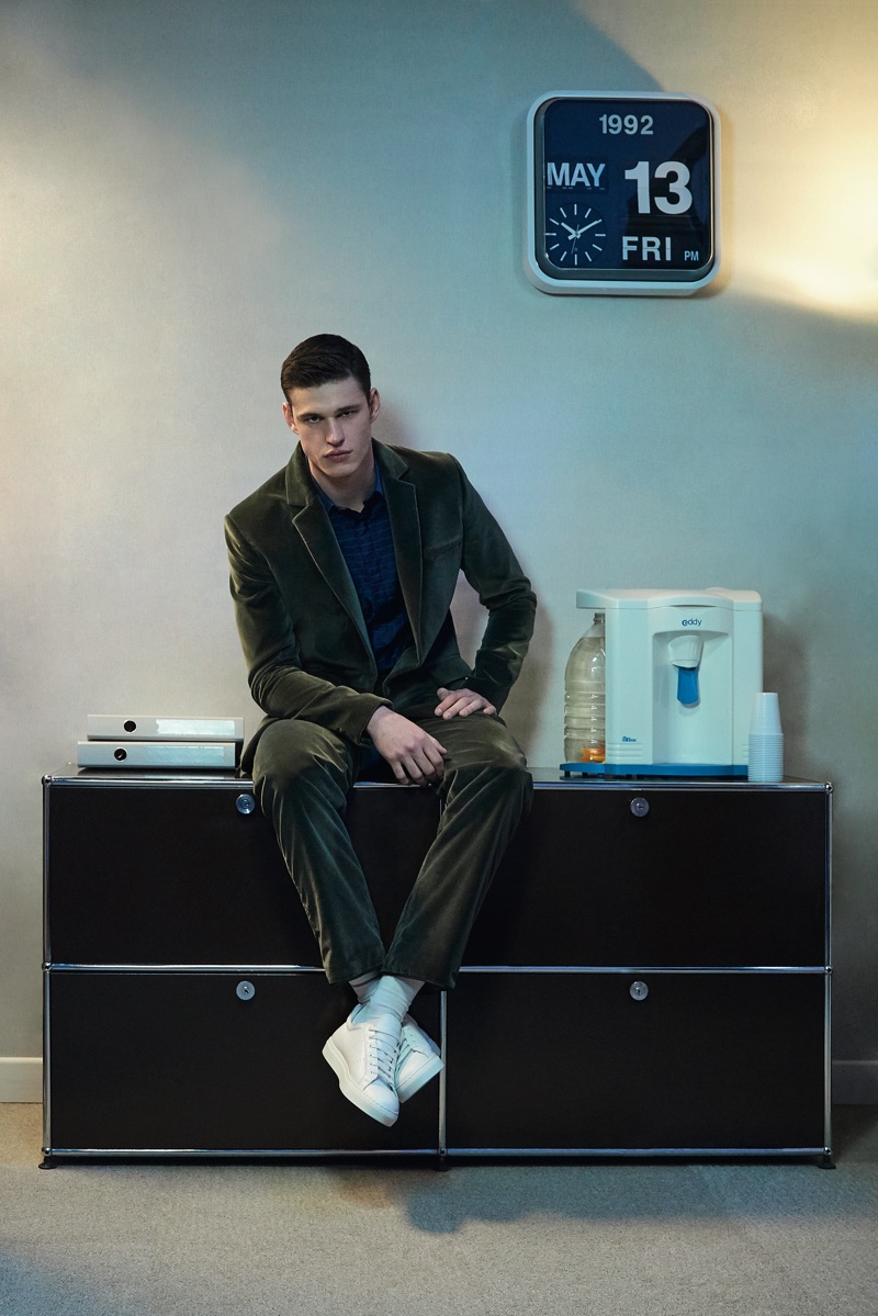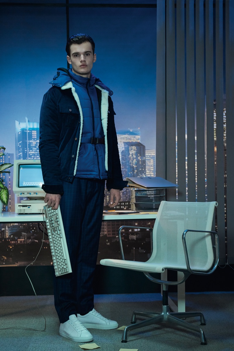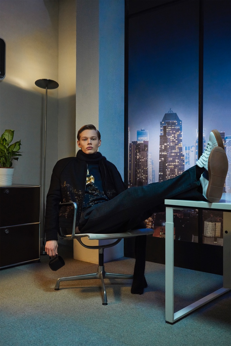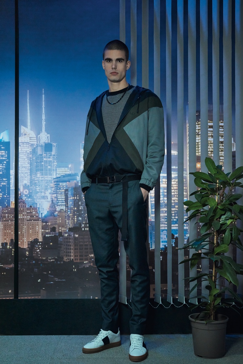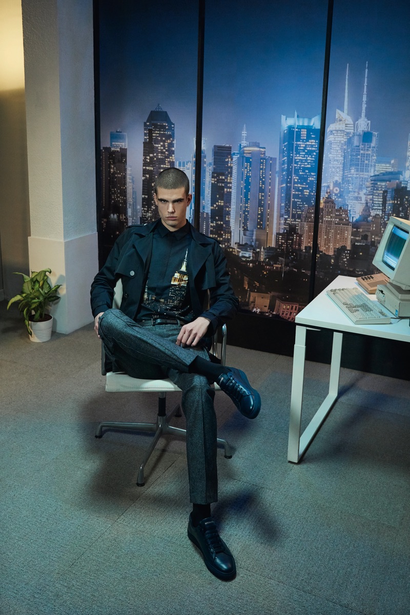 Deep midnight blue acts as the grounding force for the lineup with plenty of nineties references in the form of oversized knitwear and key outerwear. This casualness is juxtaposed with tweed and velvet tailoring. The collection also tackles hero menswear pieces such as the trench coat, which brings to mind the Big Apple.