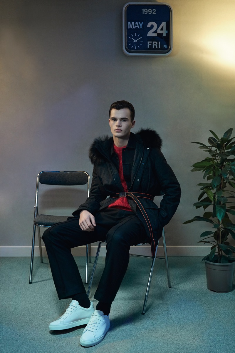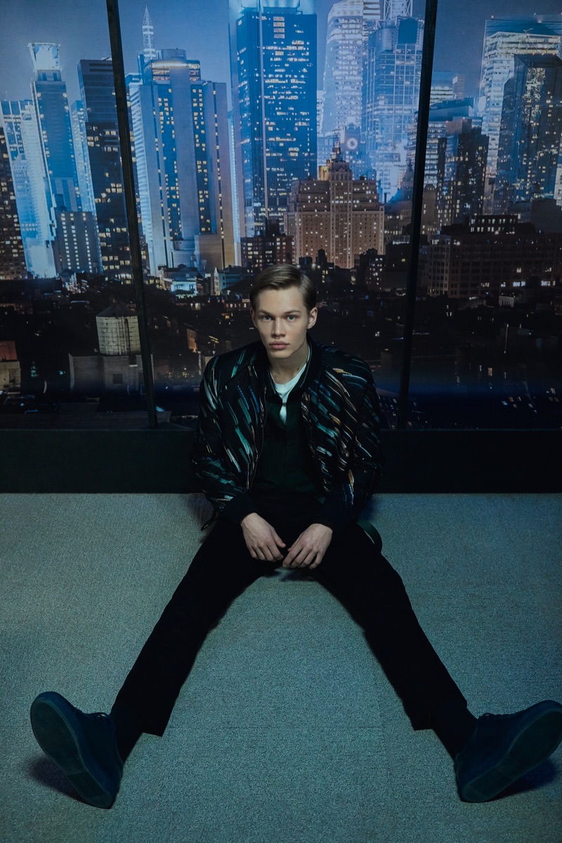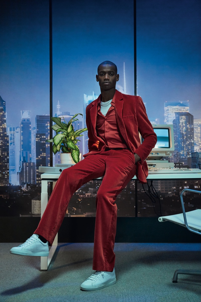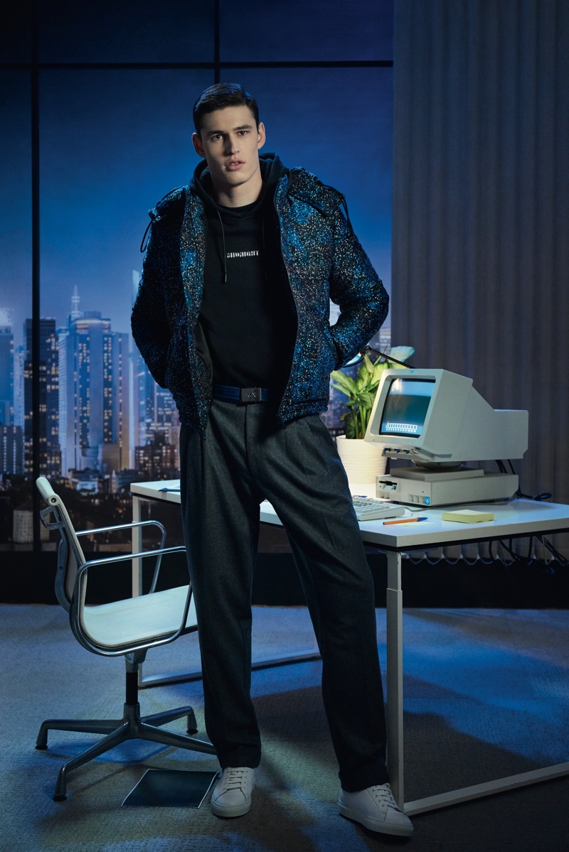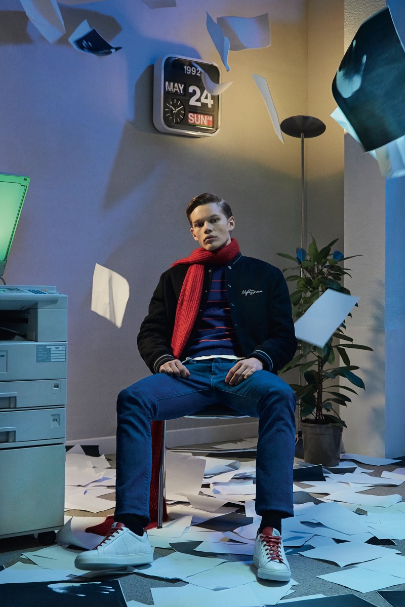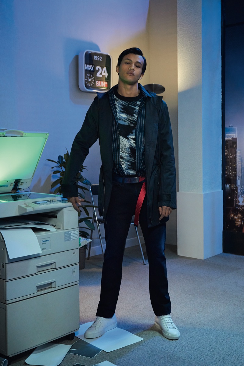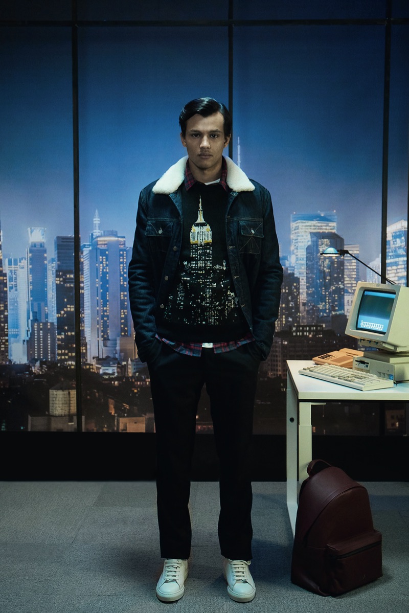 Deep midnight blue acts as the grounding force for the lineup with plenty of nineties references in the form of oversized knitwear and key outerwear. This casualness is juxtaposed with tweed and velvet tailoring. The collection also tackles hero menswear pieces such as the trench coat, which brings to mind the Big Apple.
