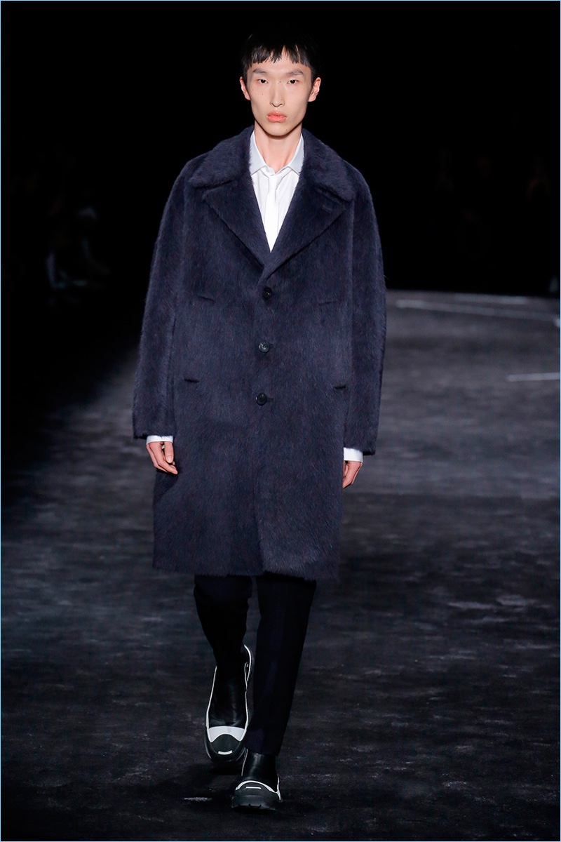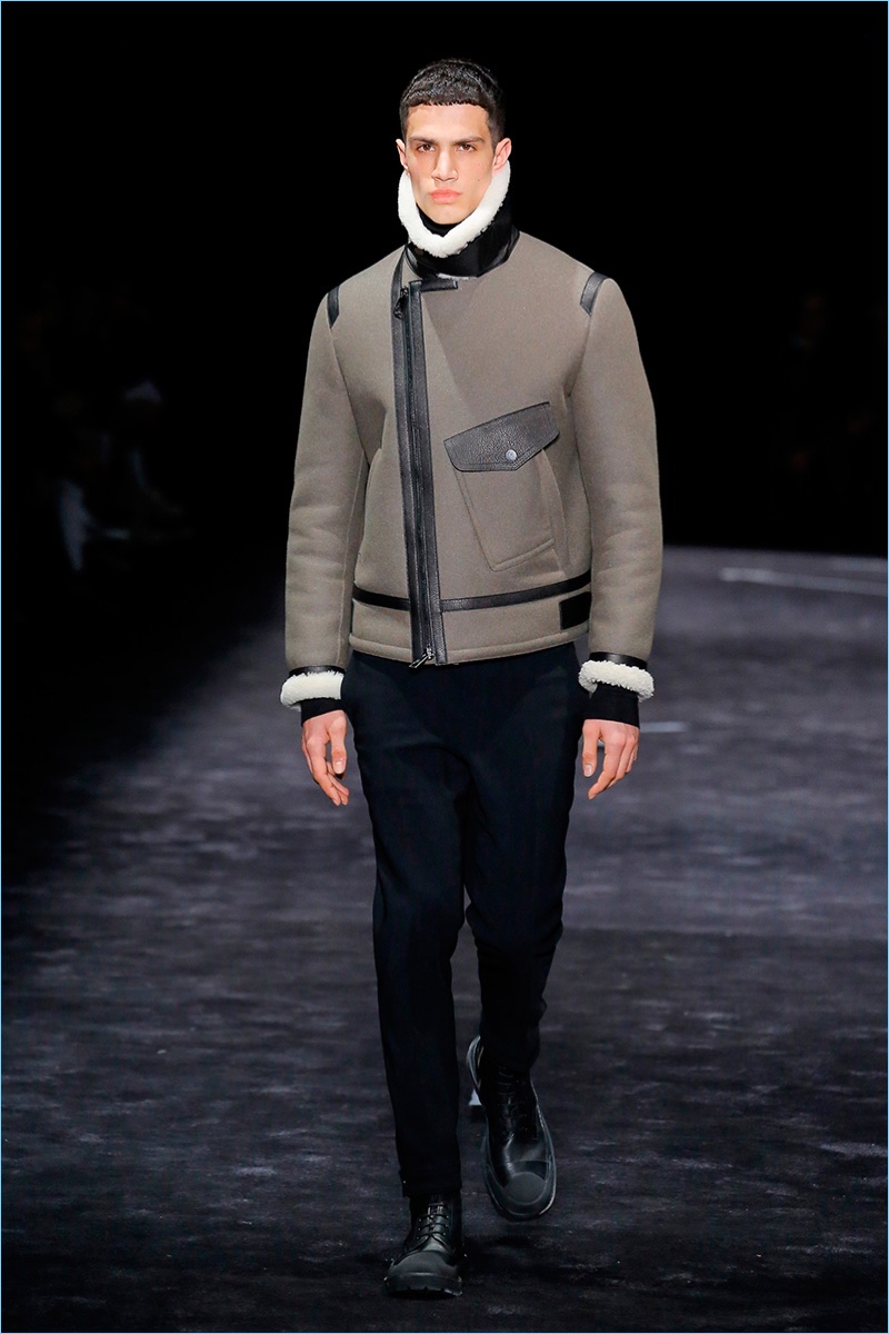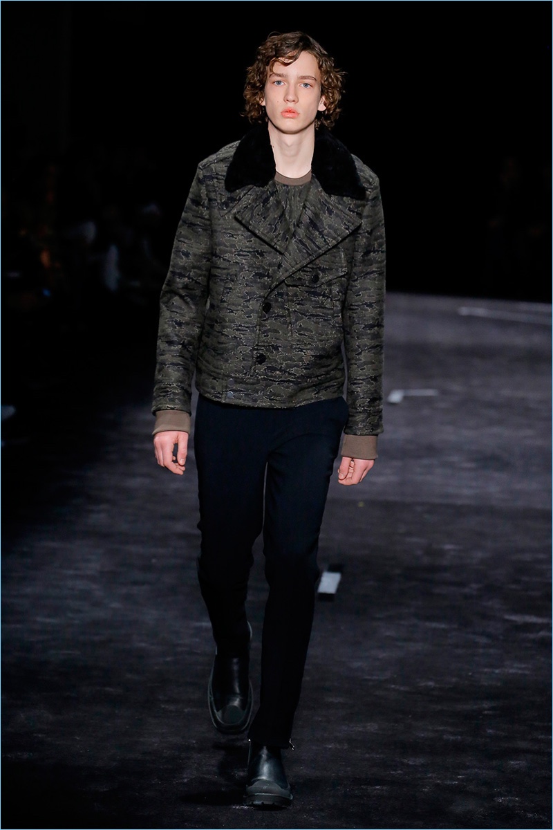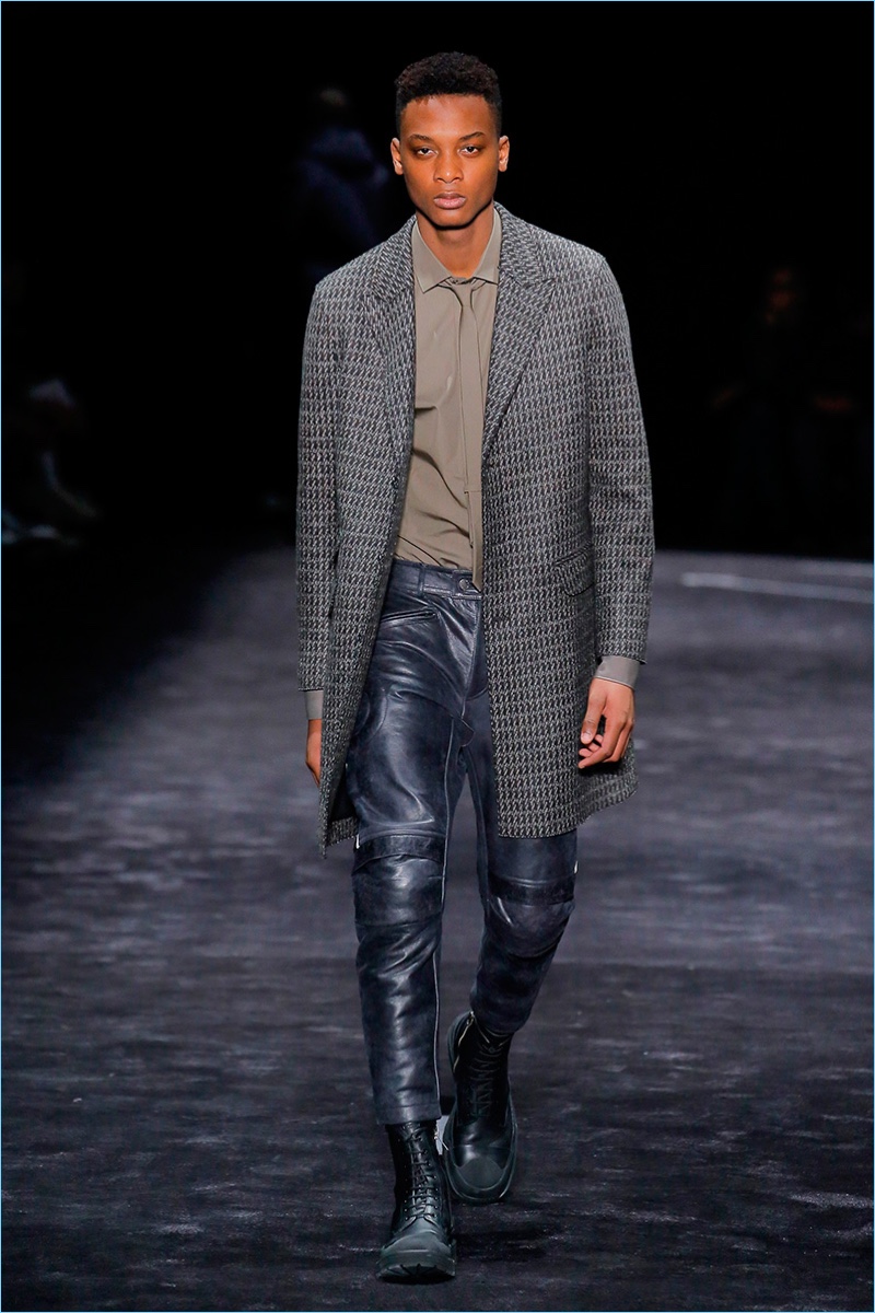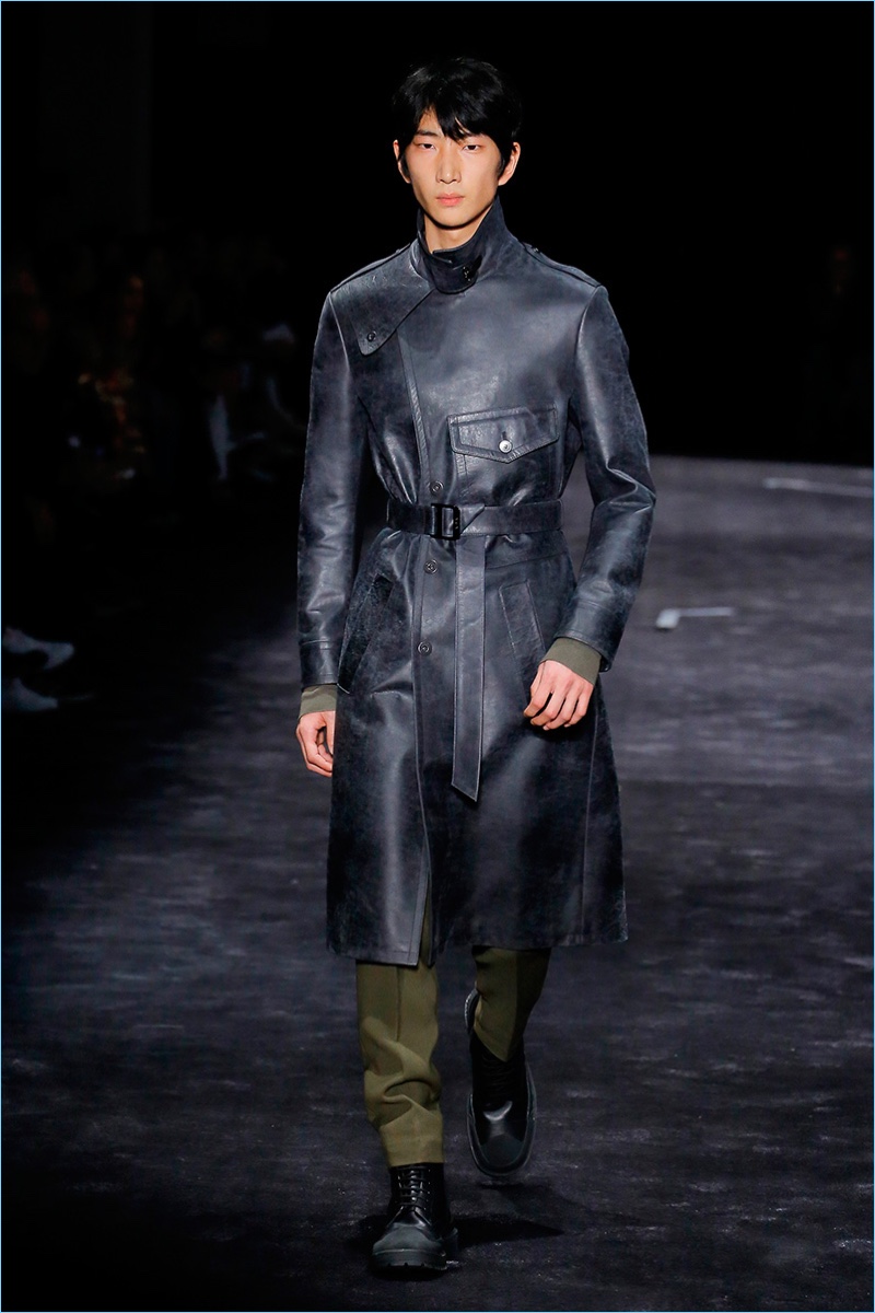 Neil Barrett plays it somber for fall-winter 2018. The British designer embraces a uniform approach to the season. A tailored proposal begins with military references and a dark color palette. Whereas Barrett usually emphasizes a streetwear approach to style, this season presents a more polished take on menswear. Clean lines encourage sleek pieces that range from straight-cut coats and bomber jackets to impeccably tailored suits. While leather pants add an edge to the collection, Barrett also drives a military-style aesthetic home with plenty of covetable outerwear options.