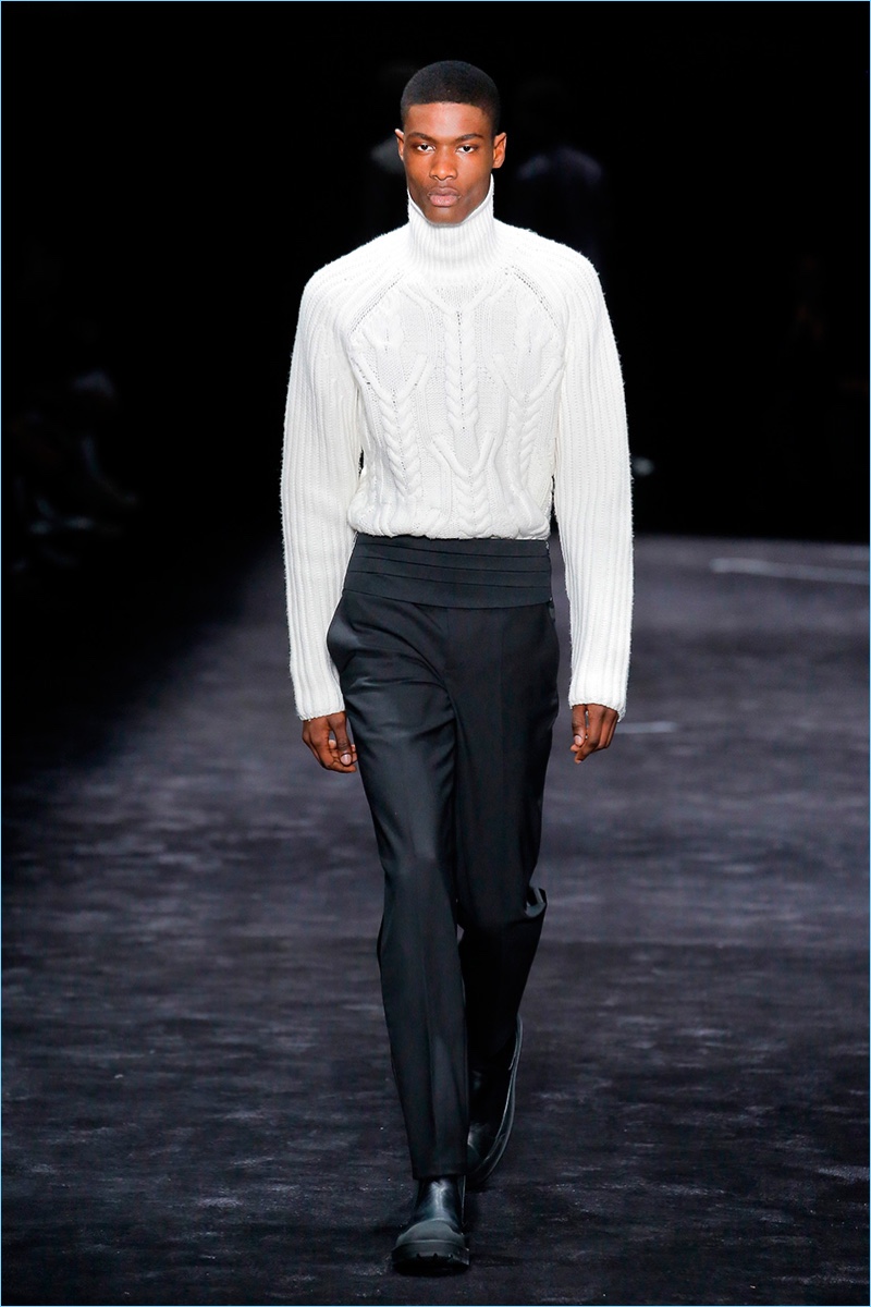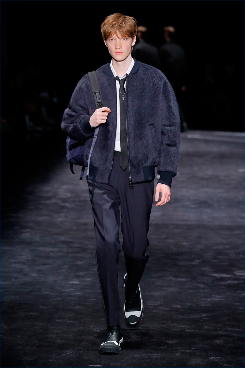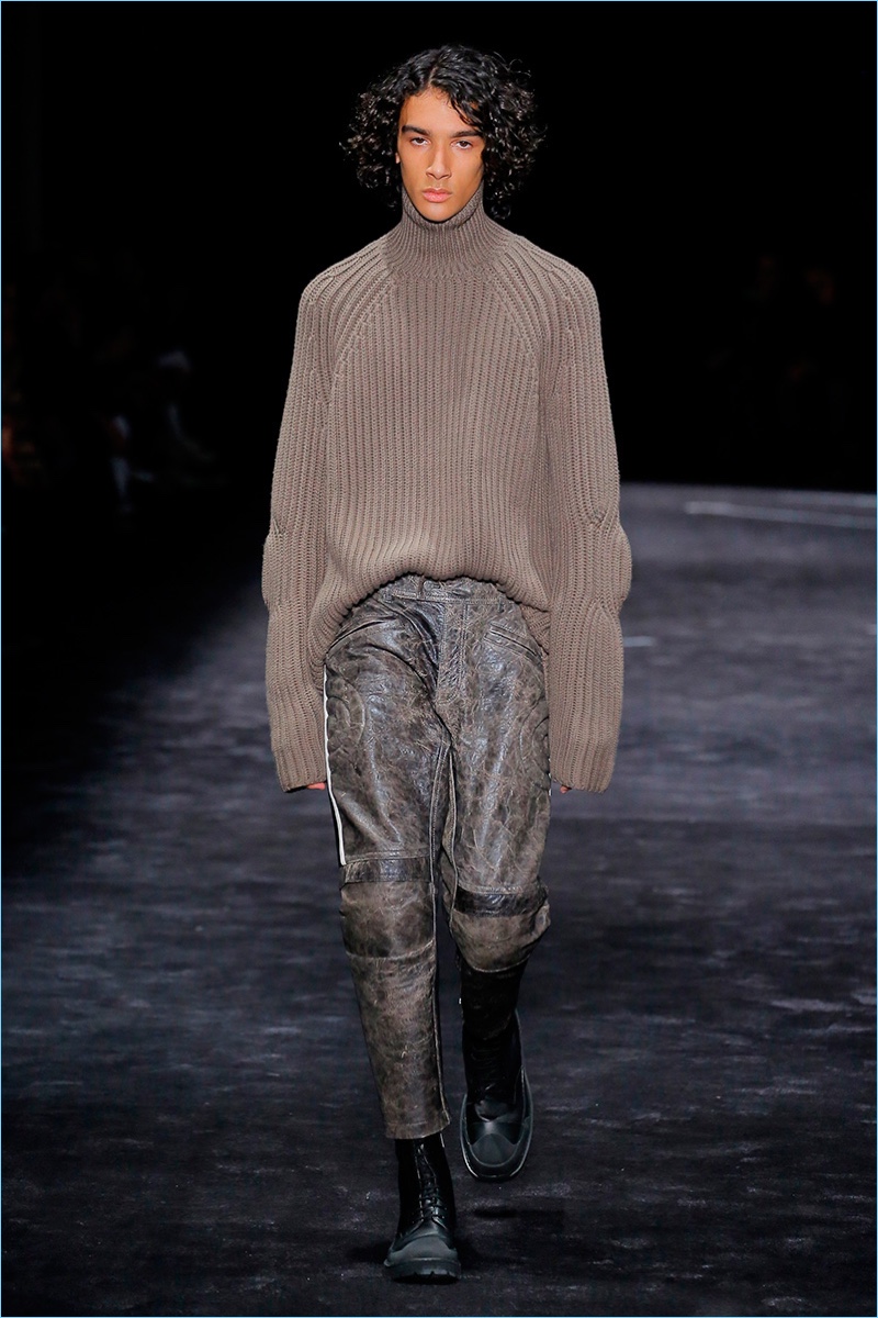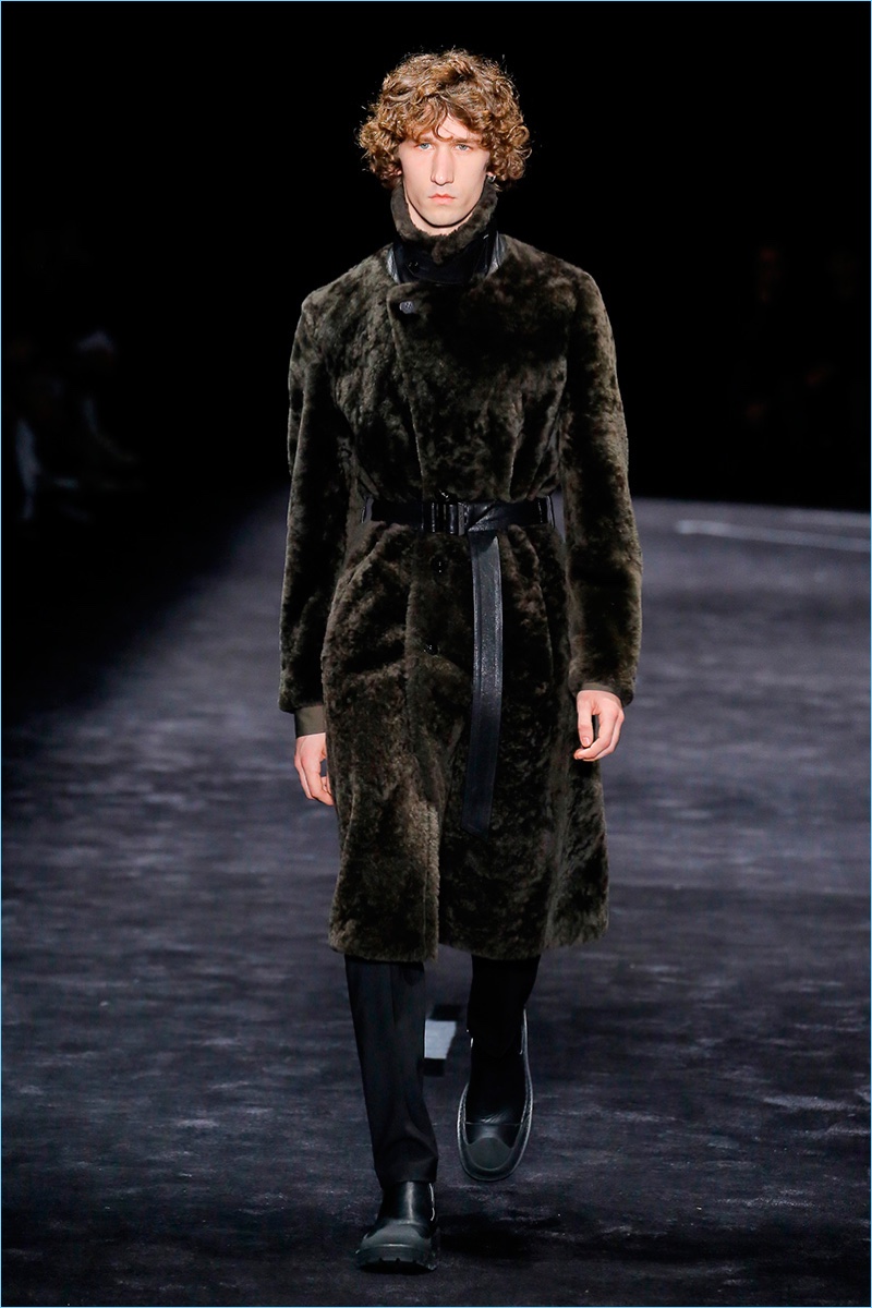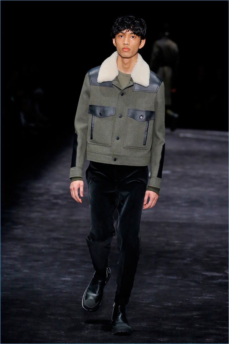Neil Barrett plays it somber for fall-winter 2018. The British designer embraces a uniform approach to the season. A tailored proposal begins with military references and a dark color palette. Whereas Barrett usually emphasizes a streetwear approach to style, this season presents a more polished take on menswear. Clean lines encourage sleek pieces that range from straight-cut coats and bomber jackets to impeccably tailored suits. While leather pants add an edge to the collection, Barrett also drives a military-style aesthetic home with plenty of covetable outerwear options.