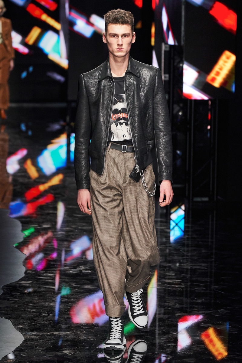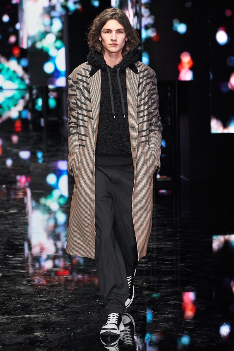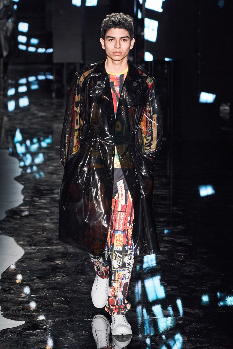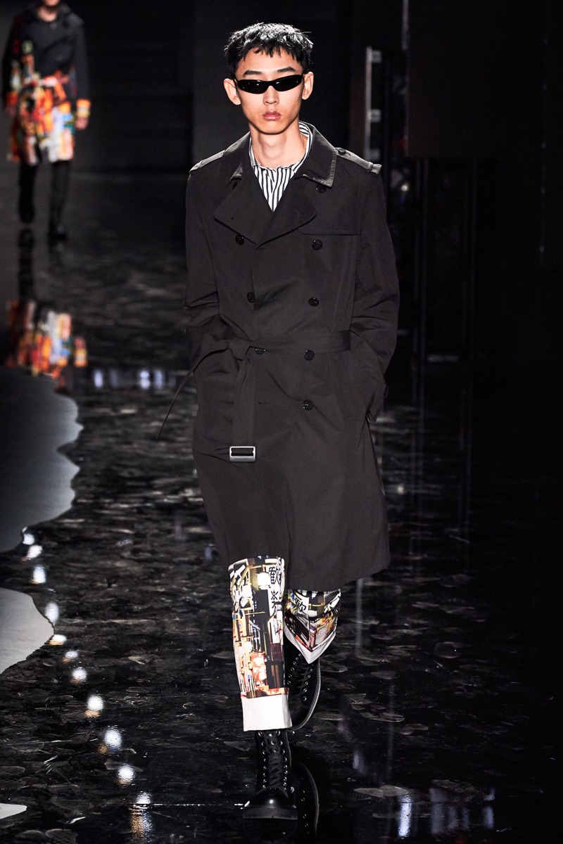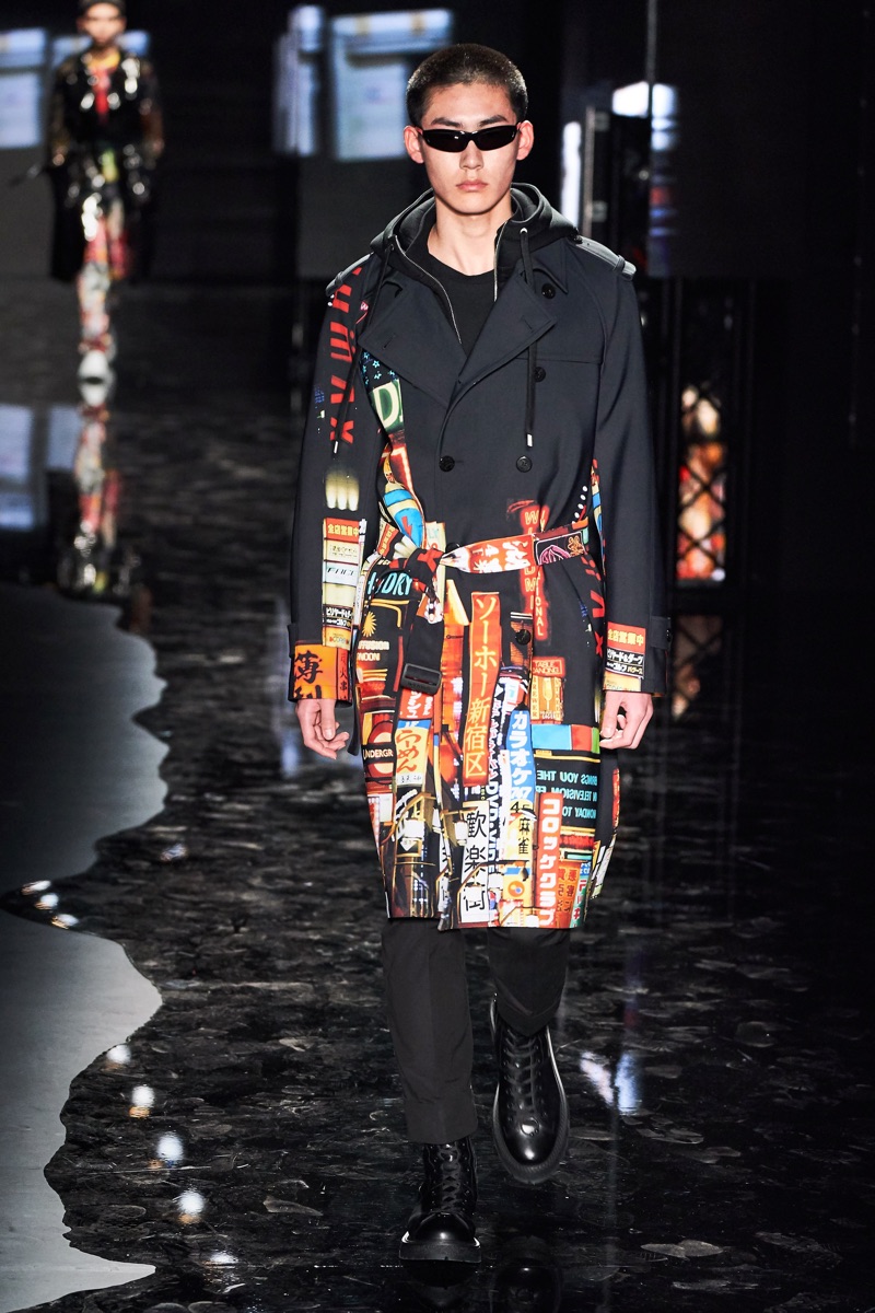 Neil Barrett fittingly rebels against his typical approach to menswear with a Tokyo punk-inspired theme. The British designer unveils his fall-winter 2019 collection, which marries sharp tailoring with bold graphics. Key visuals bridge references from London to Tokyo. Cityscapes and animal prints collide with a youthful outing that finds the color in darkness. A color palette of red, black, and brown unfold with plenty of covetable pieces. Barrett’s lineup includes slouchy trousers, leather jackets, sheer coats, cheeky patterned sweaters, and elegant suits.