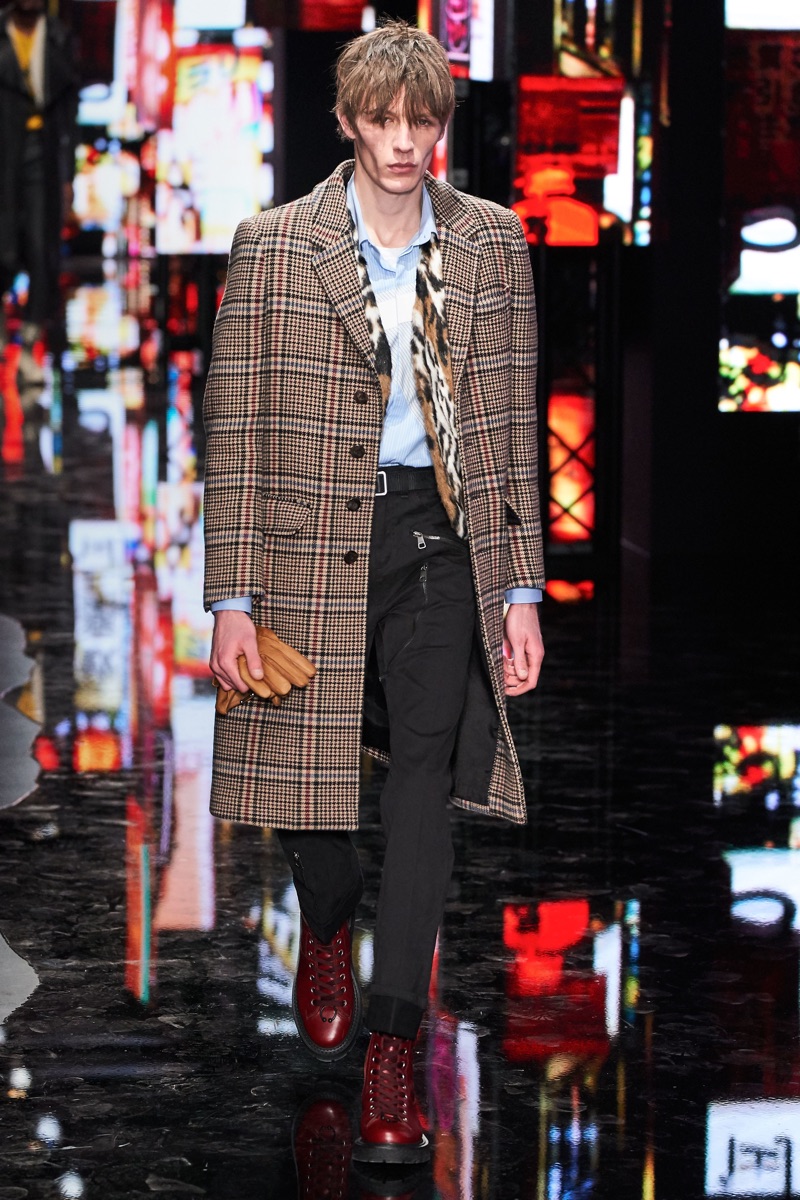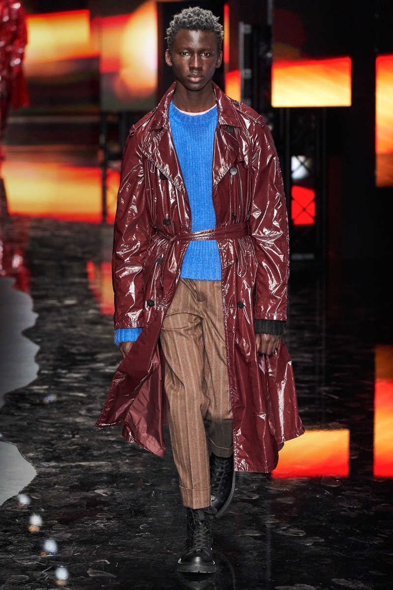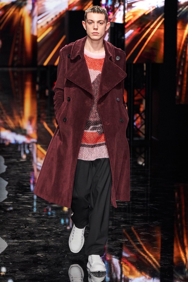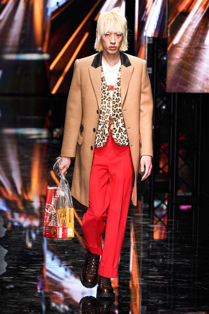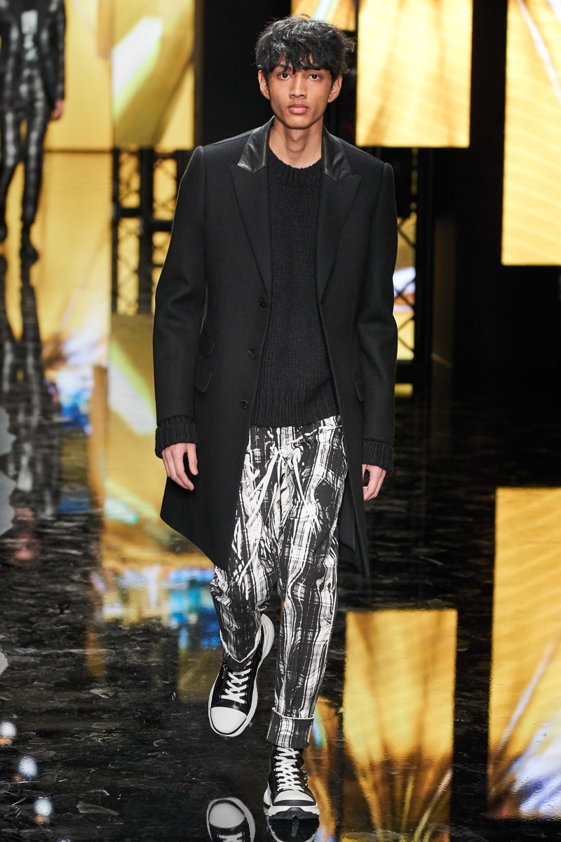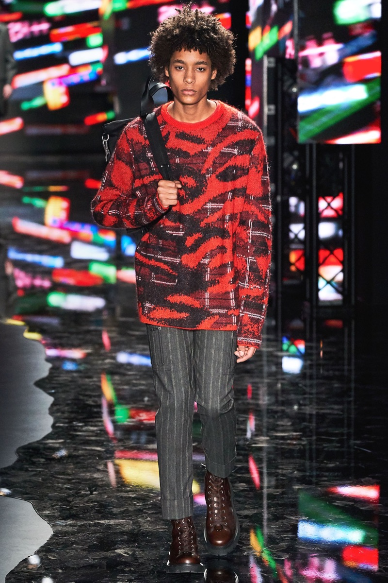 Neil Barrett fittingly rebels against his typical approach to menswear with a Tokyo punk-inspired theme. The British designer unveils his fall-winter 2019 collection, which marries sharp tailoring with bold graphics. Key visuals bridge references from London to Tokyo. Cityscapes and animal prints collide with a youthful outing that finds the color in darkness. A color palette of red, black, and brown unfold with plenty of covetable pieces. Barrett’s lineup includes slouchy trousers, leather jackets, sheer coats, cheeky patterned sweaters, and elegant suits.
