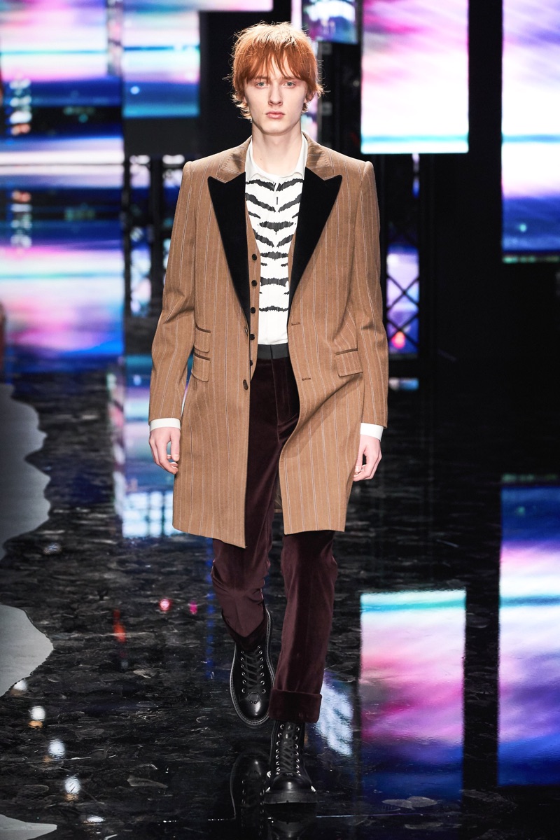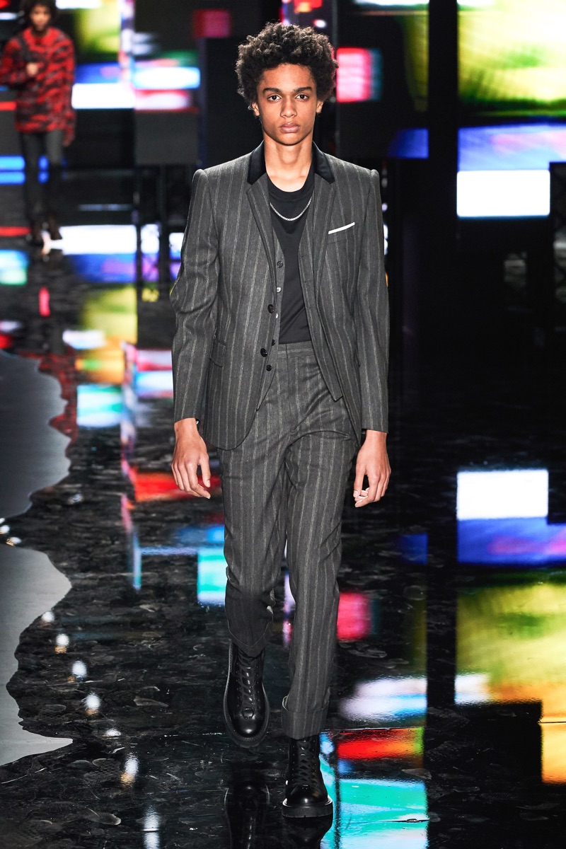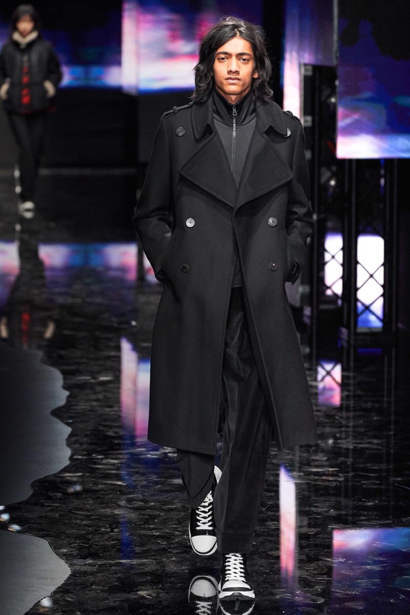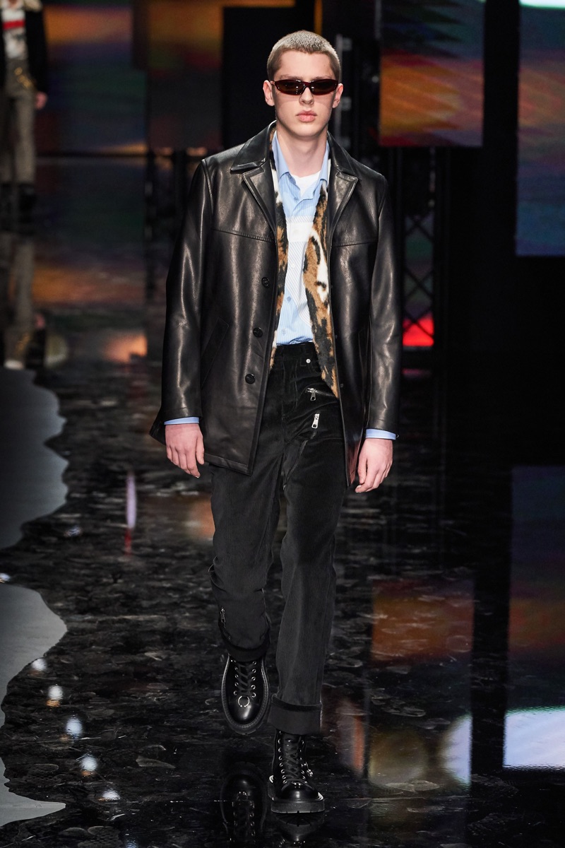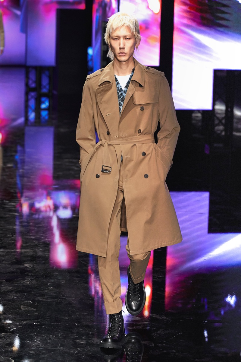 Neil Barrett fittingly rebels against his typical approach to menswear with a Tokyo punk-inspired theme. The British designer unveils his fall-winter 2019 collection, which marries sharp tailoring with bold graphics. Key visuals bridge references from London to Tokyo. Cityscapes and animal prints collide with a youthful outing that finds the color in darkness. A color palette of red, black, and brown unfold with plenty of covetable pieces. Barrett’s lineup includes slouchy trousers, leather jackets, sheer coats, cheeky patterned sweaters, and elegant suits.