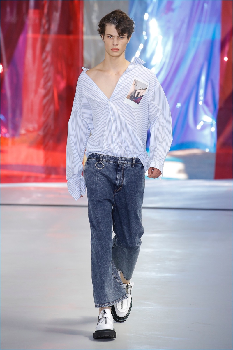 A breath of fresh air, N°21 brings a playful spirit to the season. Alessandro Dell’Acqua offers a relaxed approach to menswear with a focus on updating staples such as the button-down shirt or suiting shorts. Enlarged proportions fuel a laid-back season. The label’s spring-summer 2019 collection offers a balancing act between modest and provocative. While you can’t go wrong with a double-breasted suit or straight-cut jeans, Dell’Acqua pushes the envelope with his use of PVC. The material offers a daring update to jackets and shorts. Meanwhile, leather strapped sandals and monk shoes complete the season’s refreshing step forward.