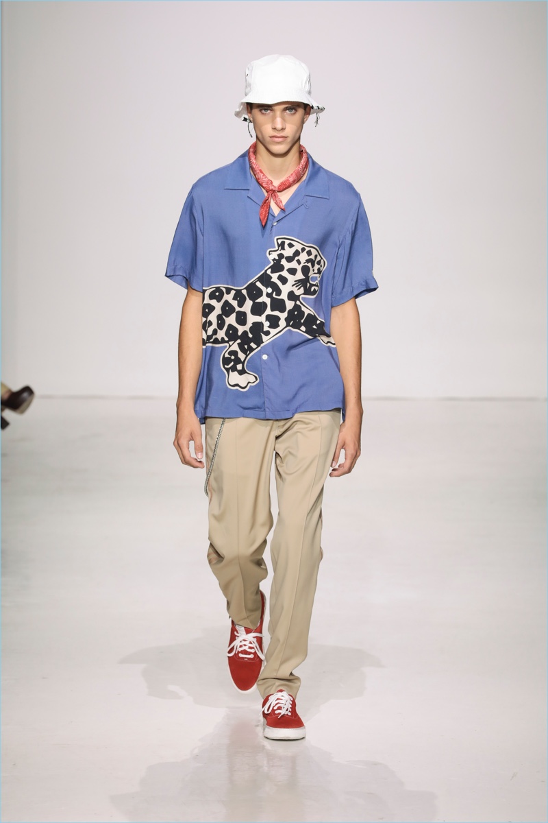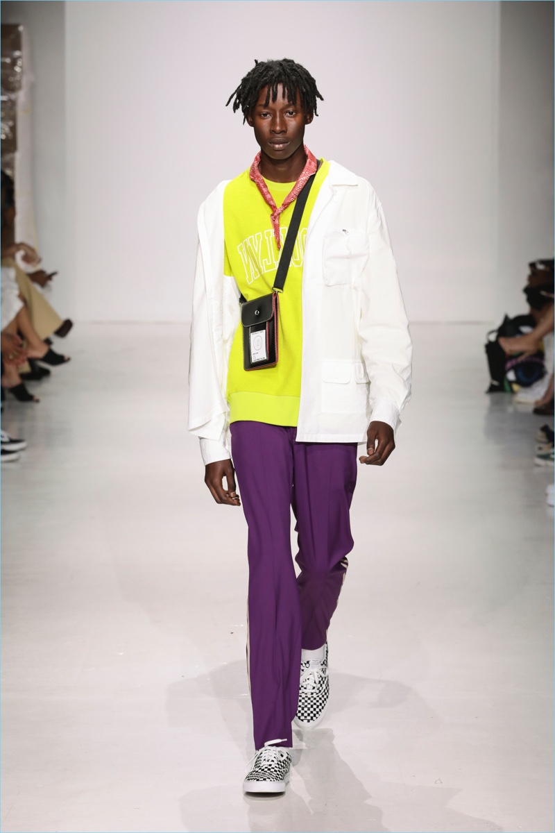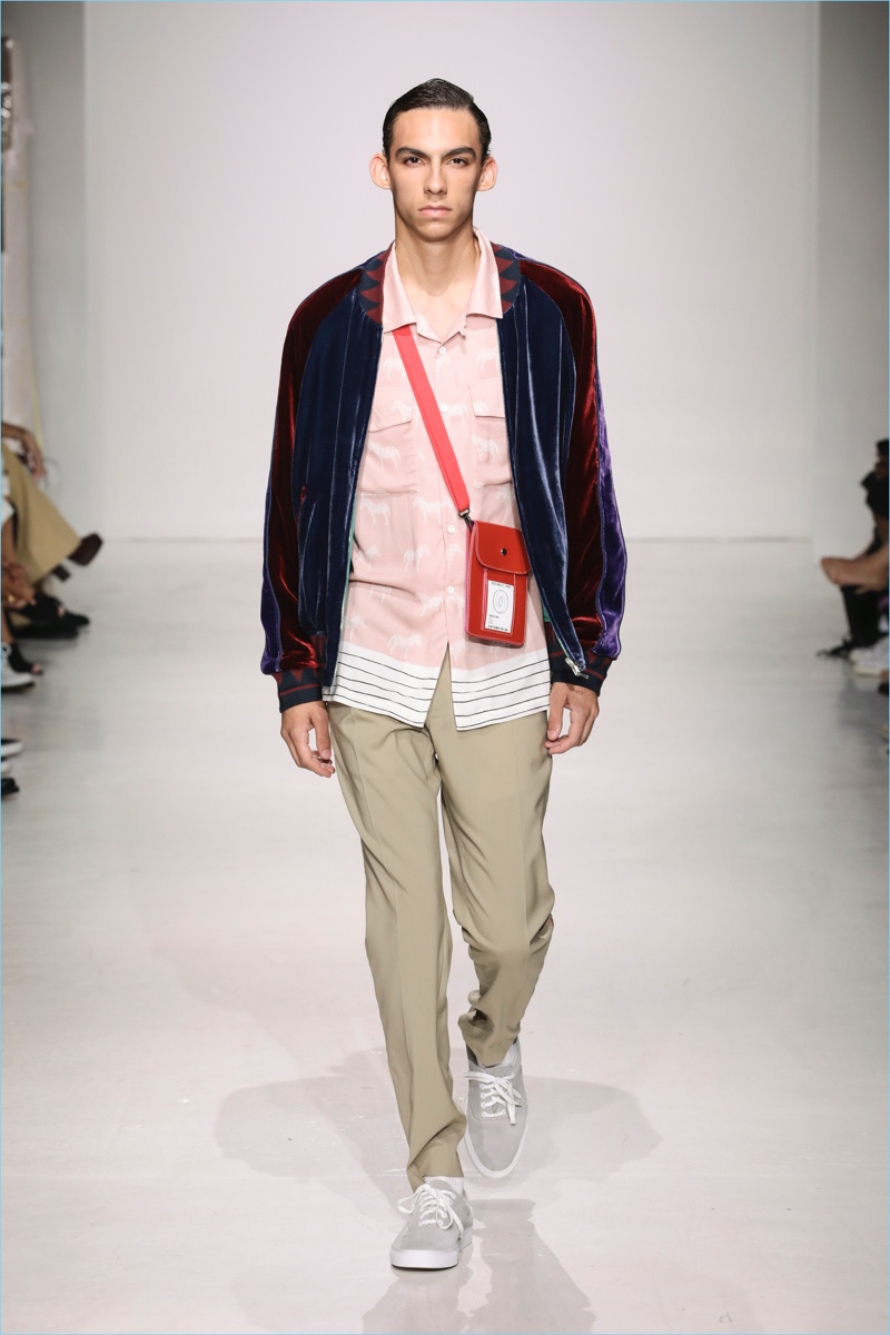 Design duo Ariel and Shimon Ovadia continue to share their family story with Ovadia & Sons’ spring-summer 2018 collection. While the brand’s fall range borrows from their father’s life, this season, the brothers look to their own upbringing. The twin brothers take inspiration from their time working in the warehouse of their father’s children’s clothing business. This results in a collision of boyish ideas and a streetwear attitude. Boxy cuts, slouchy proportions, and vibrant colors lend the collection its character. The lineup also features graphic artwork, born out of a collaboration between the Ovadia brothers and artist duo Interesni Kazki.