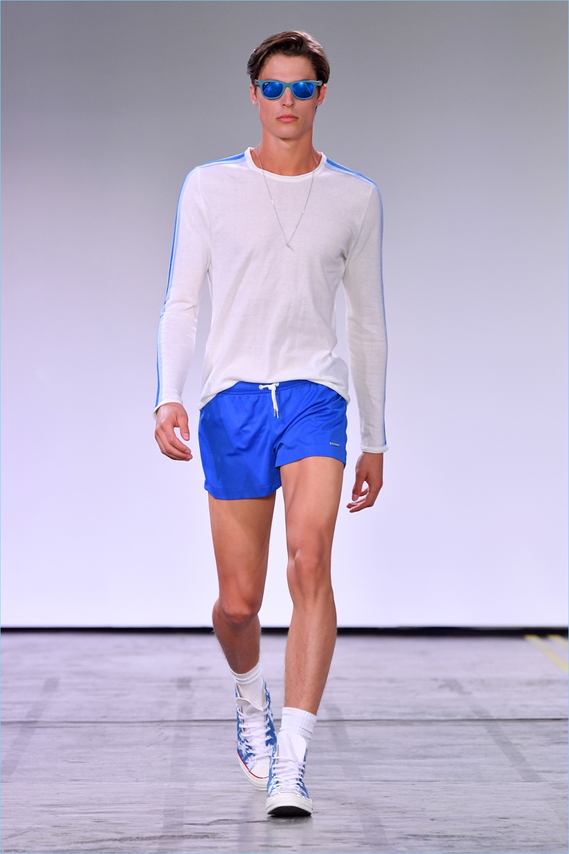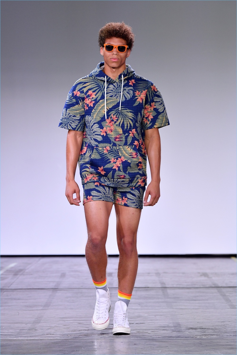 Parke & Ronen cites Malibu as its inspiration for spring-summer 2019. The fashion brand keeps in mind Malibu’s natural landscape. At the same time, Parke & Ronen considers the synthetic beauty of Los Angeles culture during the eighties. The brand’s ideal man takes on the roles of a skater, Muscle Beach regular, and Hollywood hustler for the season. As usual, bright colors dominate the collection, but this time we view them thru the lens of the eighties. Dusty pink, pale yellow, turquoise, and more come together. Taking to the catwalk, Parke & Ronen’s men wear tropical print shirts, swim shorts, lightweight sweaters, striped tees, and sleeveless hoodies. Additional pieces include cropped pants, smart button-down shirts, and coordinated outfits.