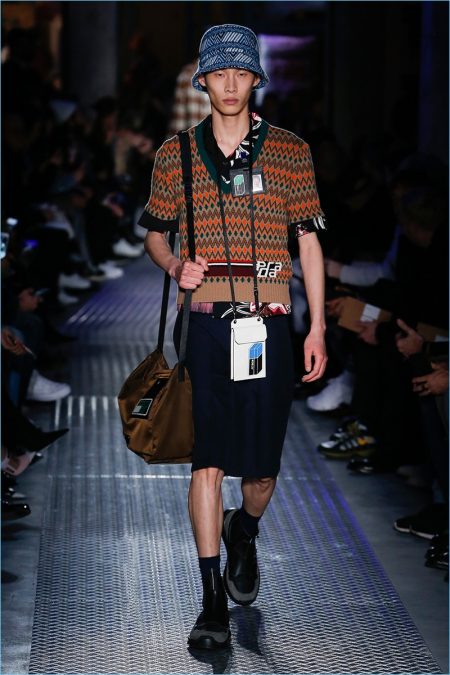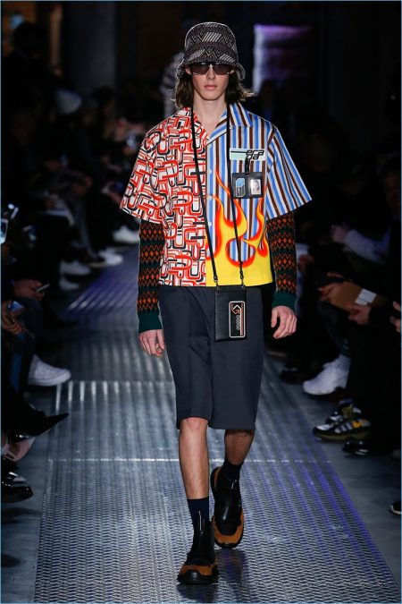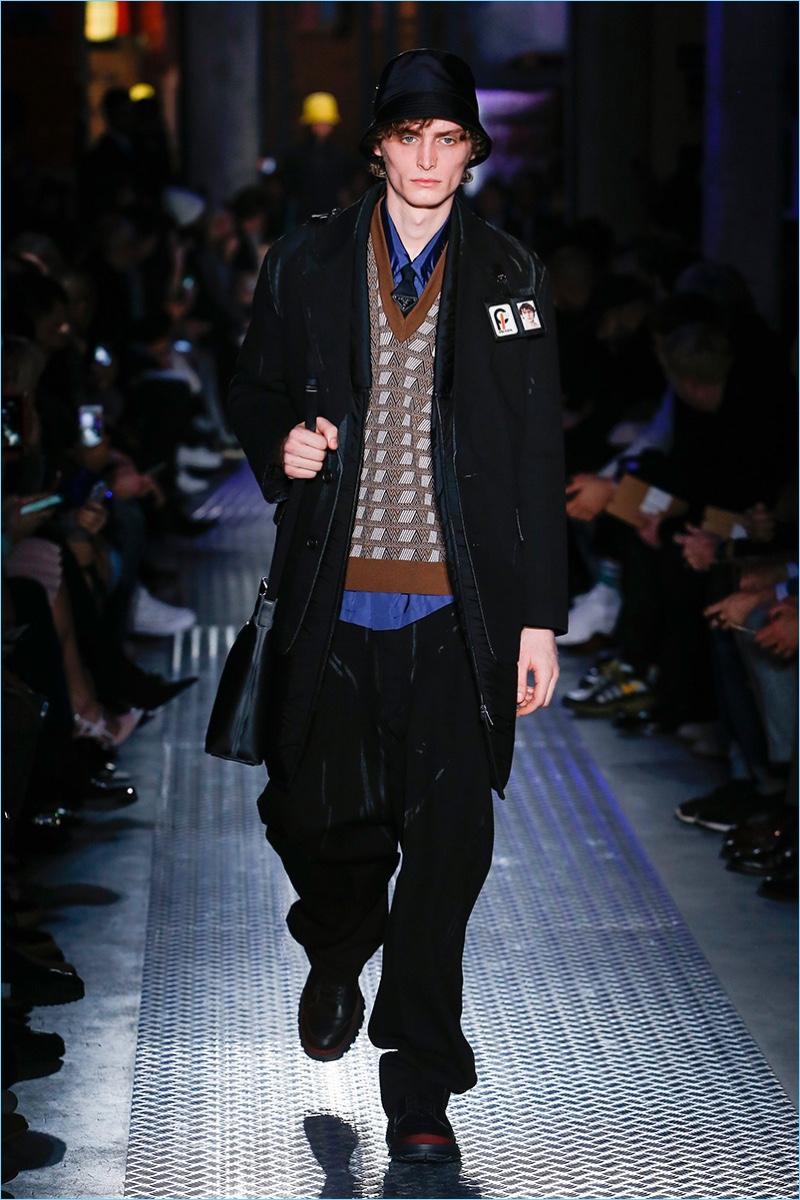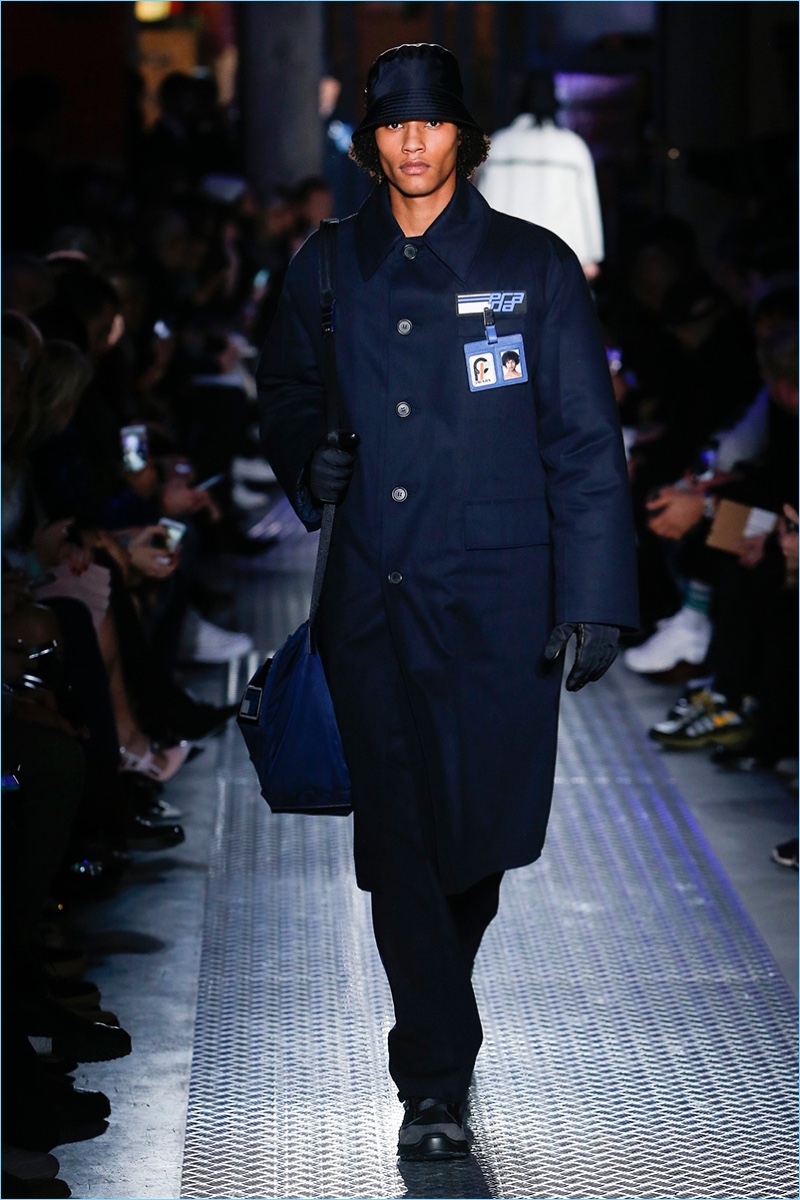 Prada channels industrial style with a futuristic fall-winter 2018 collection. Miuccia Prada rekindles her love for Pocone nylon. The material offers a special finish for everything from coats and pants to jackets. Meanwhile, Prada reinterprets its logo with a modern appeal. Black and grey dress a predominant portion of the collection, reflecting the somber spirit of world affairs. However, that mood does not consume the entire season. Prada’s range also includes a sampling of colors and prints, which reference previous collections.