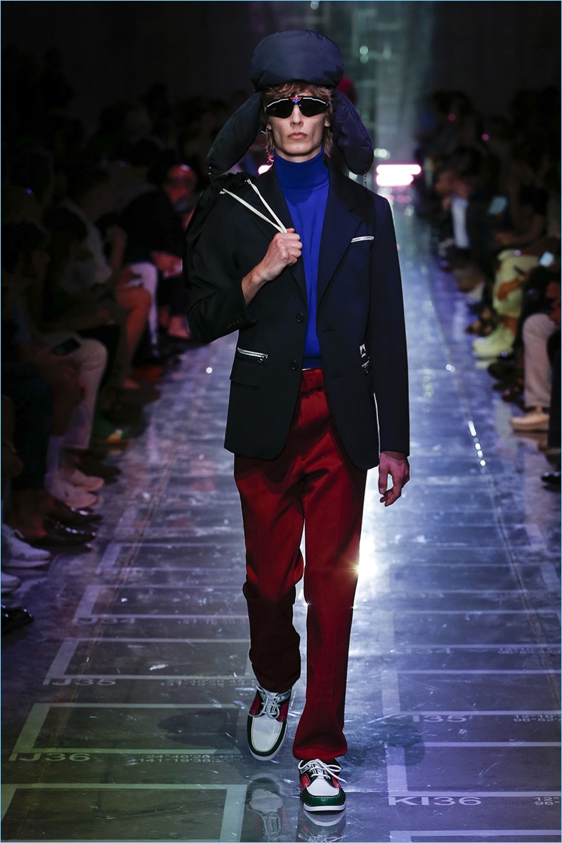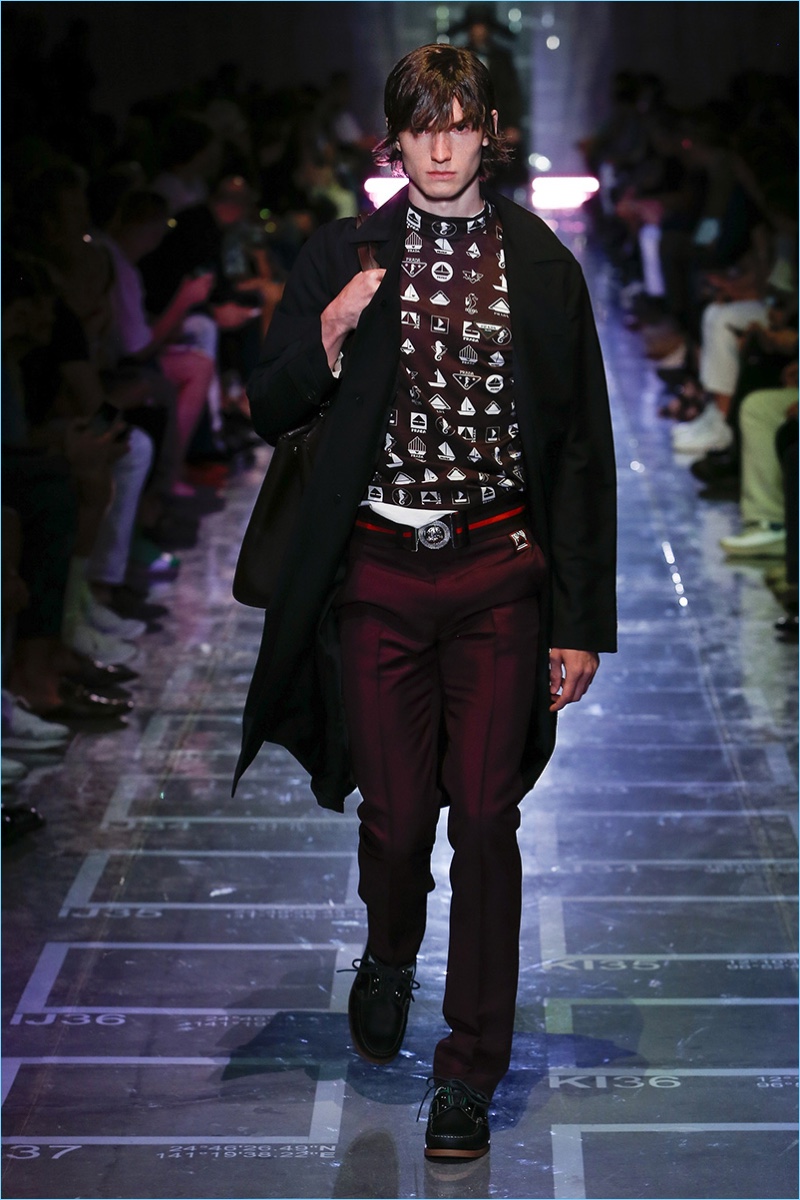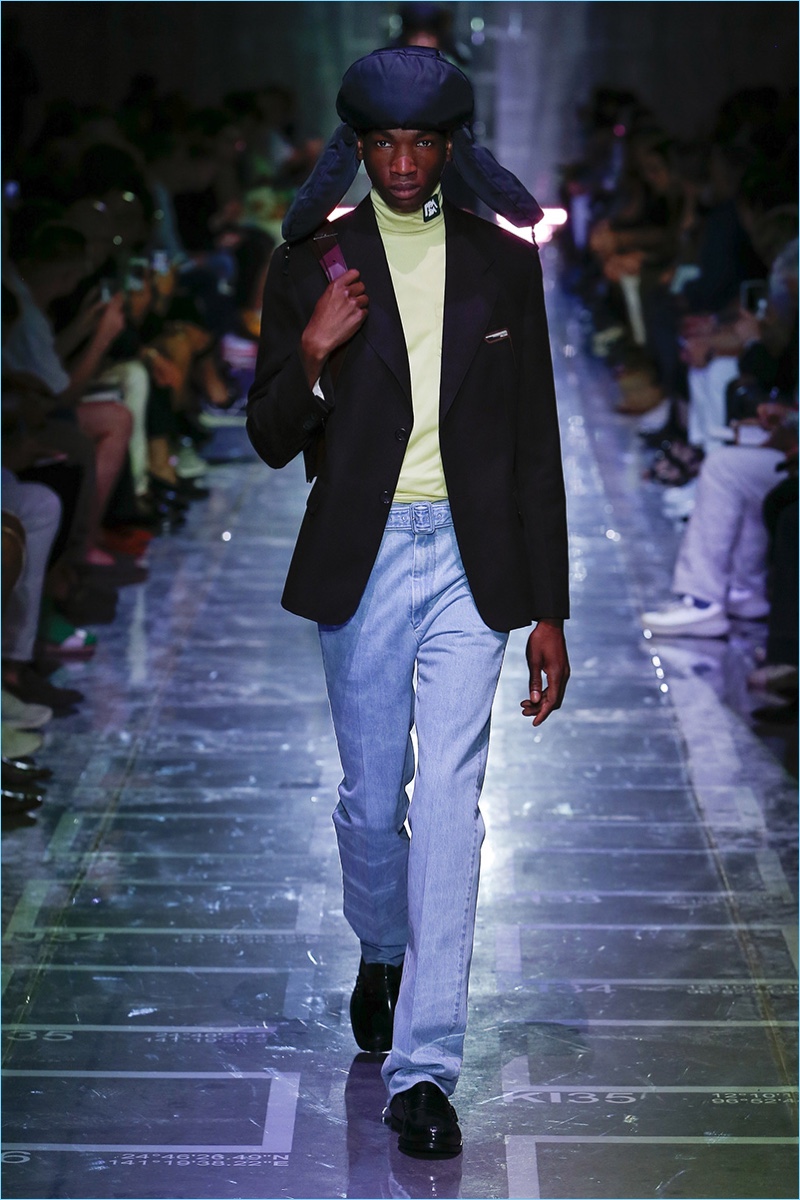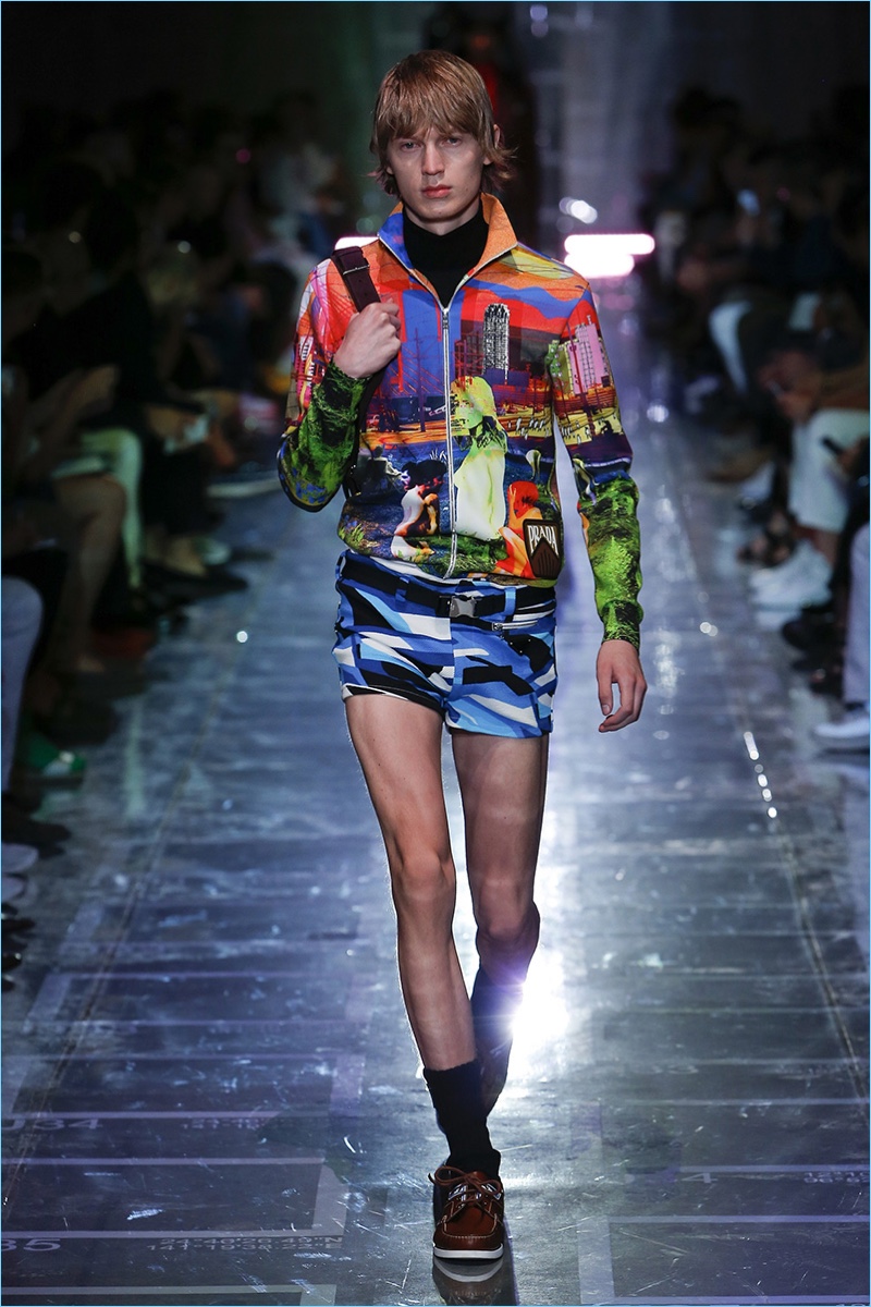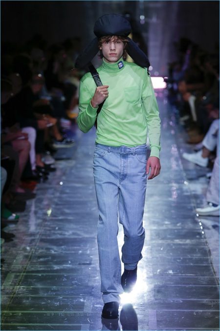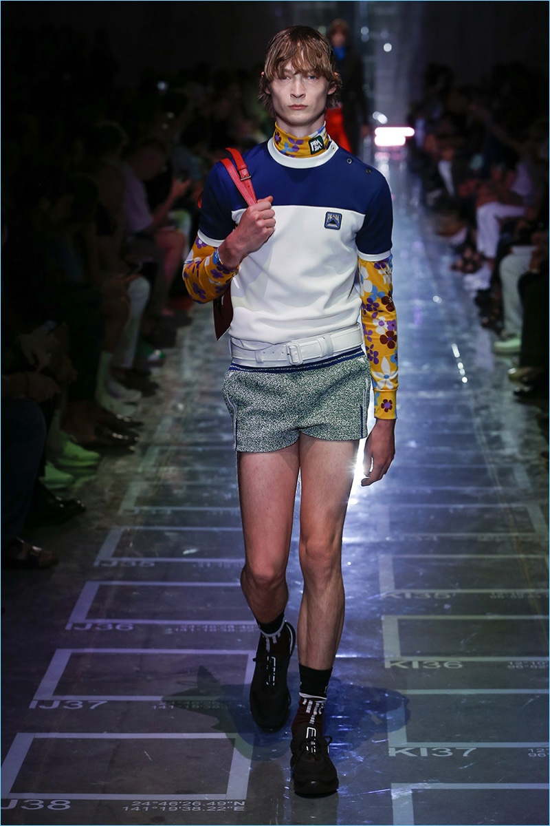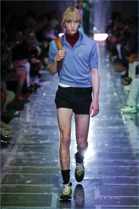 Prada references sixties style with its spring-summer 2019 collection. The season signature comes in the form of turtlenecks in sherbet hues of green, yellow, blue, and lavender. Once again, making a case for logo fashions, Prada plants its stamp of approval on the chests of polos and hips of pants. Colorblocking is also key to the season. Gravitating towards separates, lean coats, above the knee shorts, and button-downs contribute to the Prada uniform. Miuccia Prada shows a graphic hand as well. Floral prints and other sixties motifs round out the season.