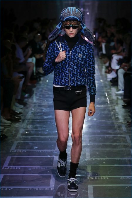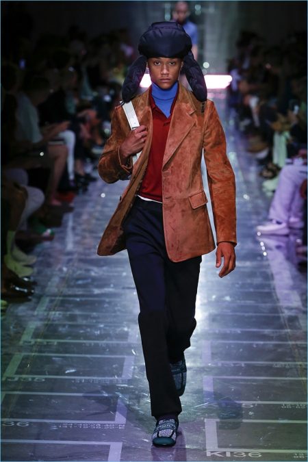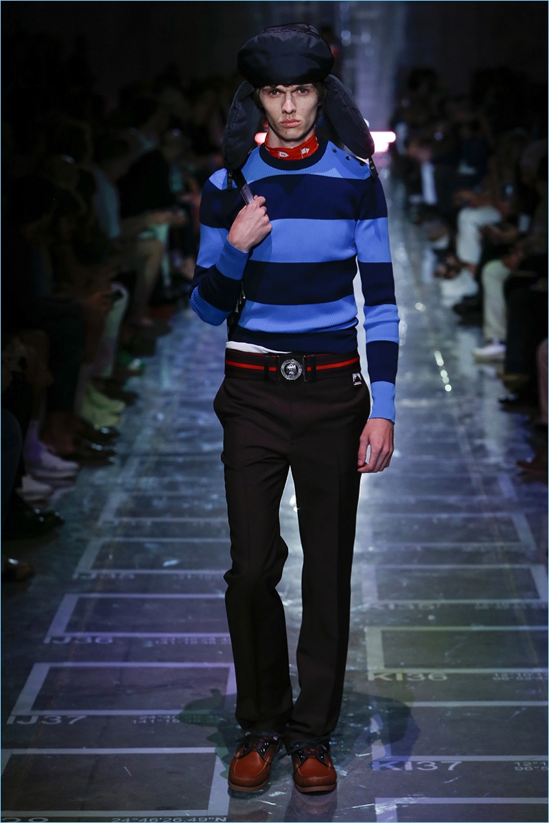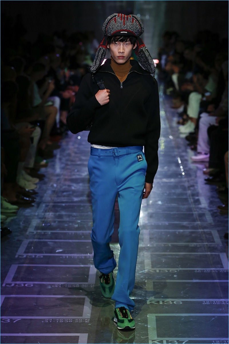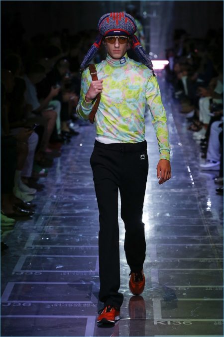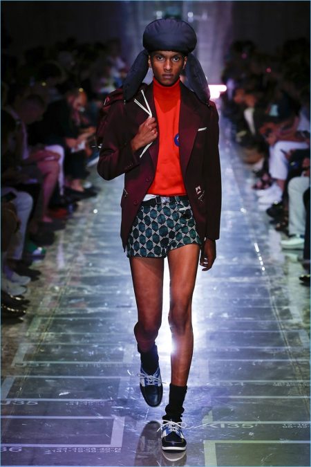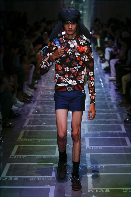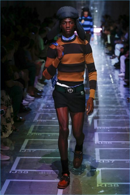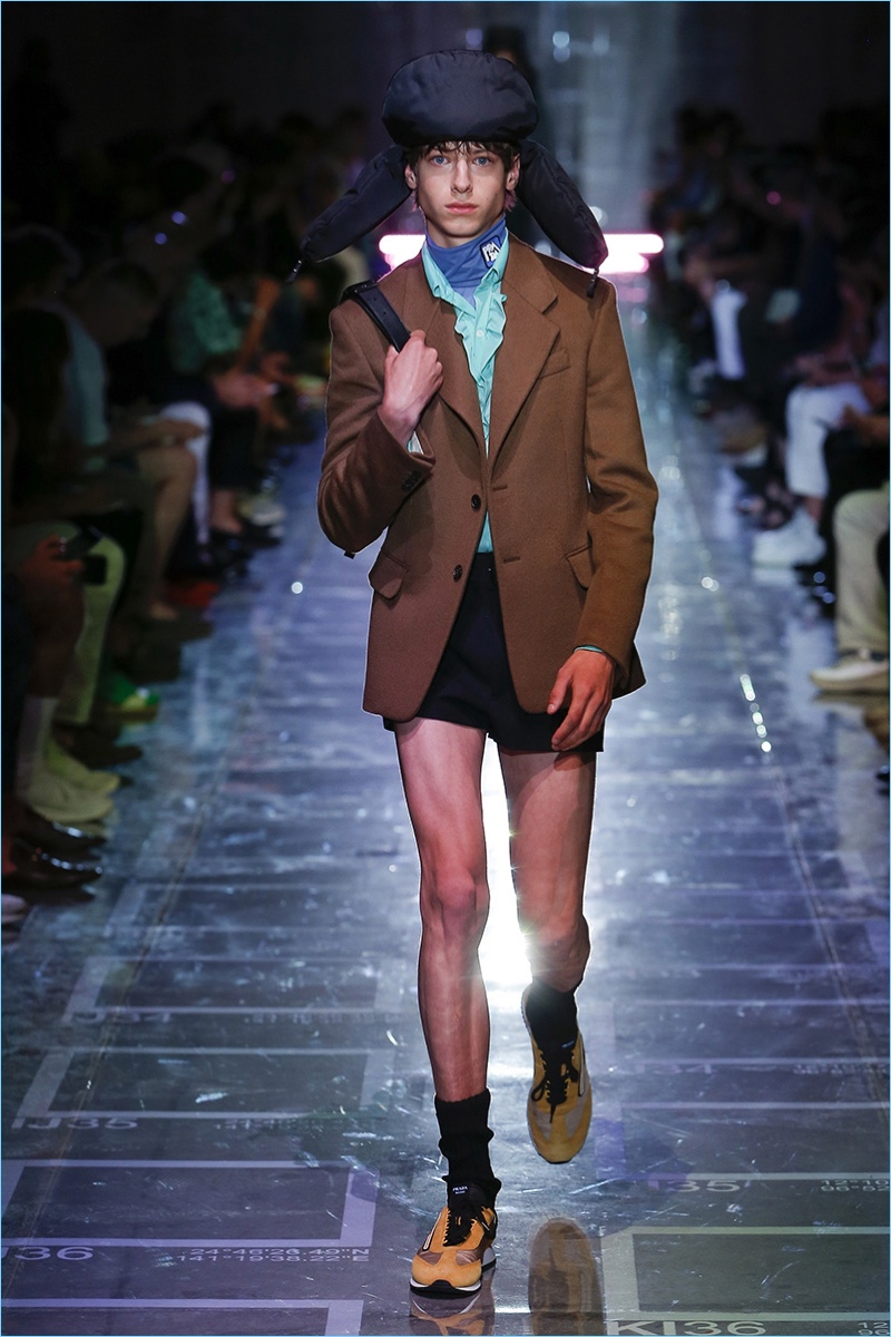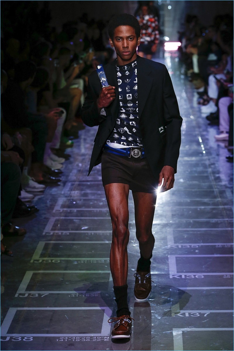 Prada references sixties style with its spring-summer 2019 collection. The season signature comes in the form of turtlenecks in sherbet hues of green, yellow, blue, and lavender. Once again, making a case for logo fashions, Prada plants its stamp of approval on the chests of polos and hips of pants. Colorblocking is also key to the season. Gravitating towards separates, lean coats, above the knee shorts, and button-downs contribute to the Prada uniform. Miuccia Prada shows a graphic hand as well. Floral prints and other sixties motifs round out the season.