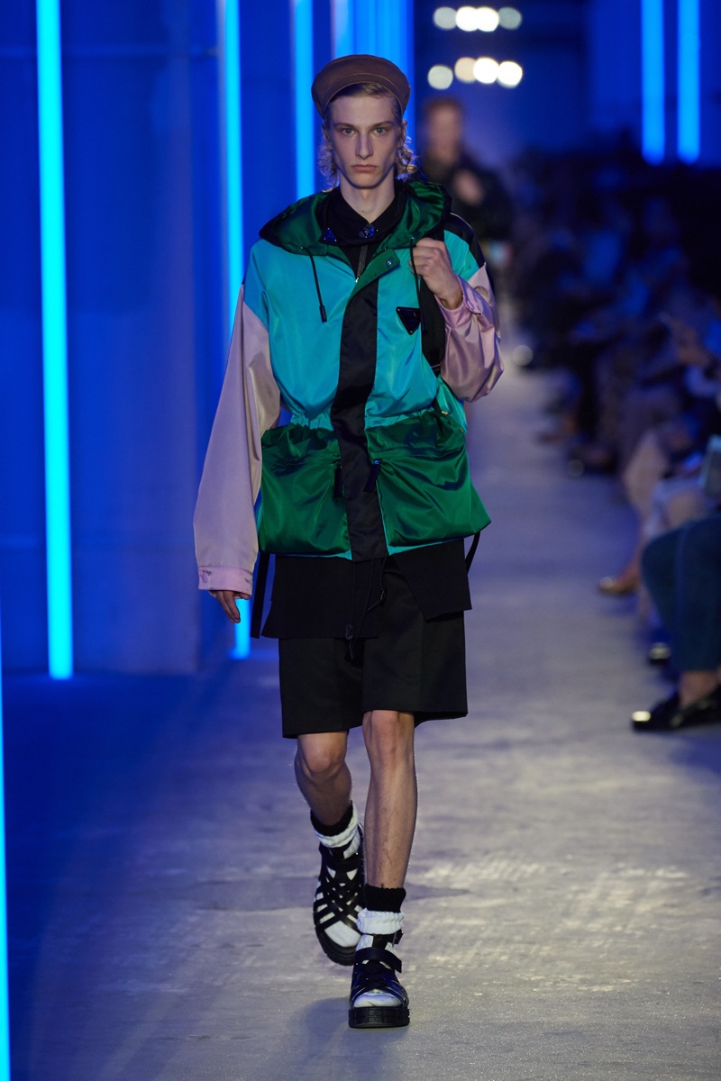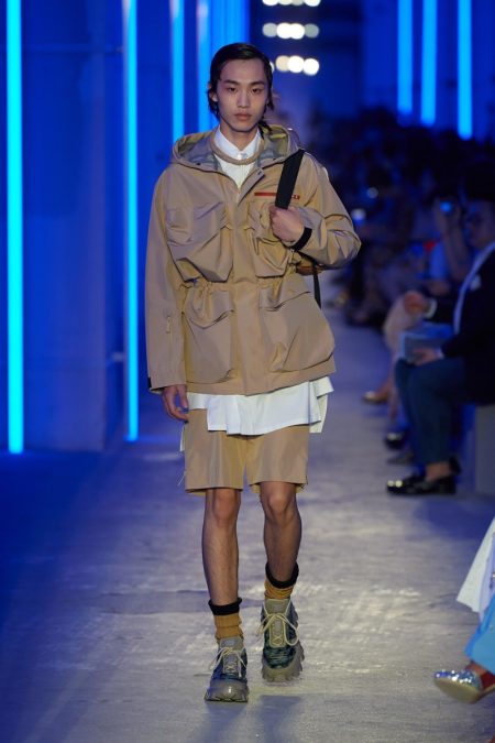 Taking a break from its home turf of Milan, Prada traveled to Shanghai to unveil its spring-summer 2020 men’s collection. The modern city and popular destination for luxury labels served as the stage for Prada’s reset of classic menswear. Miuccia Prada tackled the season with contemporary proportions and a fresh spin on proven essentials. Accented by vibrant colors and graphic prints, Prada showcased sporty hooded jackets, oversized polos, relaxed shorts, cropped trousers, longline tanks, color-blocked tops, and anoraks. Statement accessories ranged from tube socks and strapped sandals to leather bowling bags.