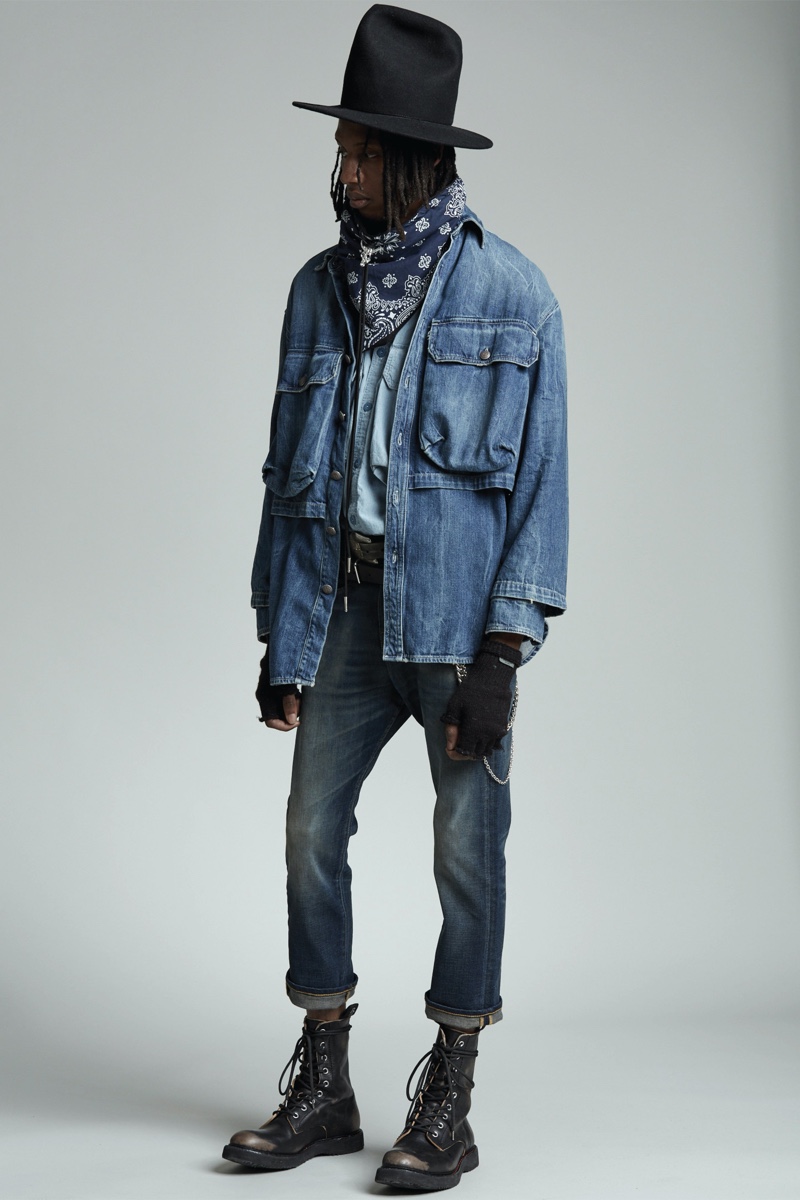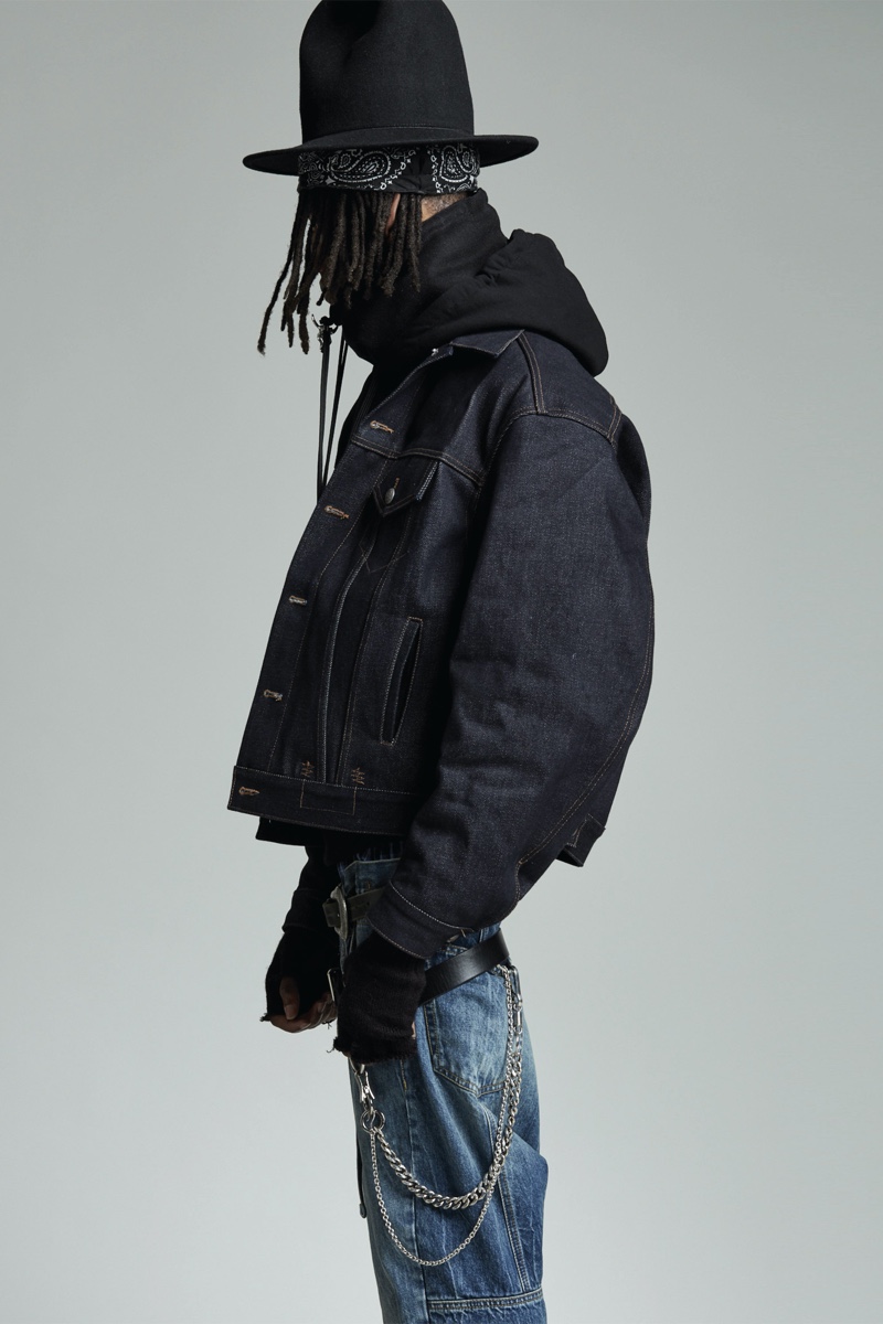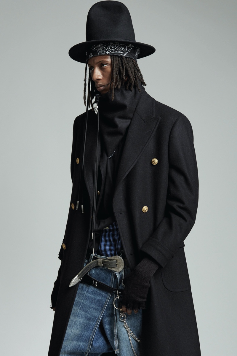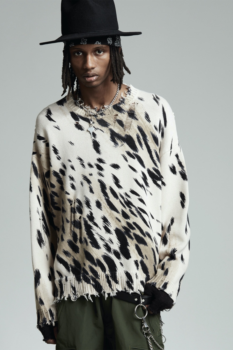 Low-rise fits make a comeback as Chris Leba embraces a slouchy silhouette for R13’s fall-winter 2020 collection. Model PK Holdbrook Smith is nonchalant but cool as he stars in the season’s lookbook. PK takes to the studio in a felt hat and bandana to embody R13’s mysterious man for autumn. It’s easy to picture a modern take on a gun-slinging western with a dark wardrobe. Bolo ties and leather western belts accessorize R13’s must-have outfits. A camouflage leopard print amplifies a juxtaposition of oversized tailoring and essential denim. The motif is front and center for statement fashions that range from an army-style jacket to cuffed pants.
