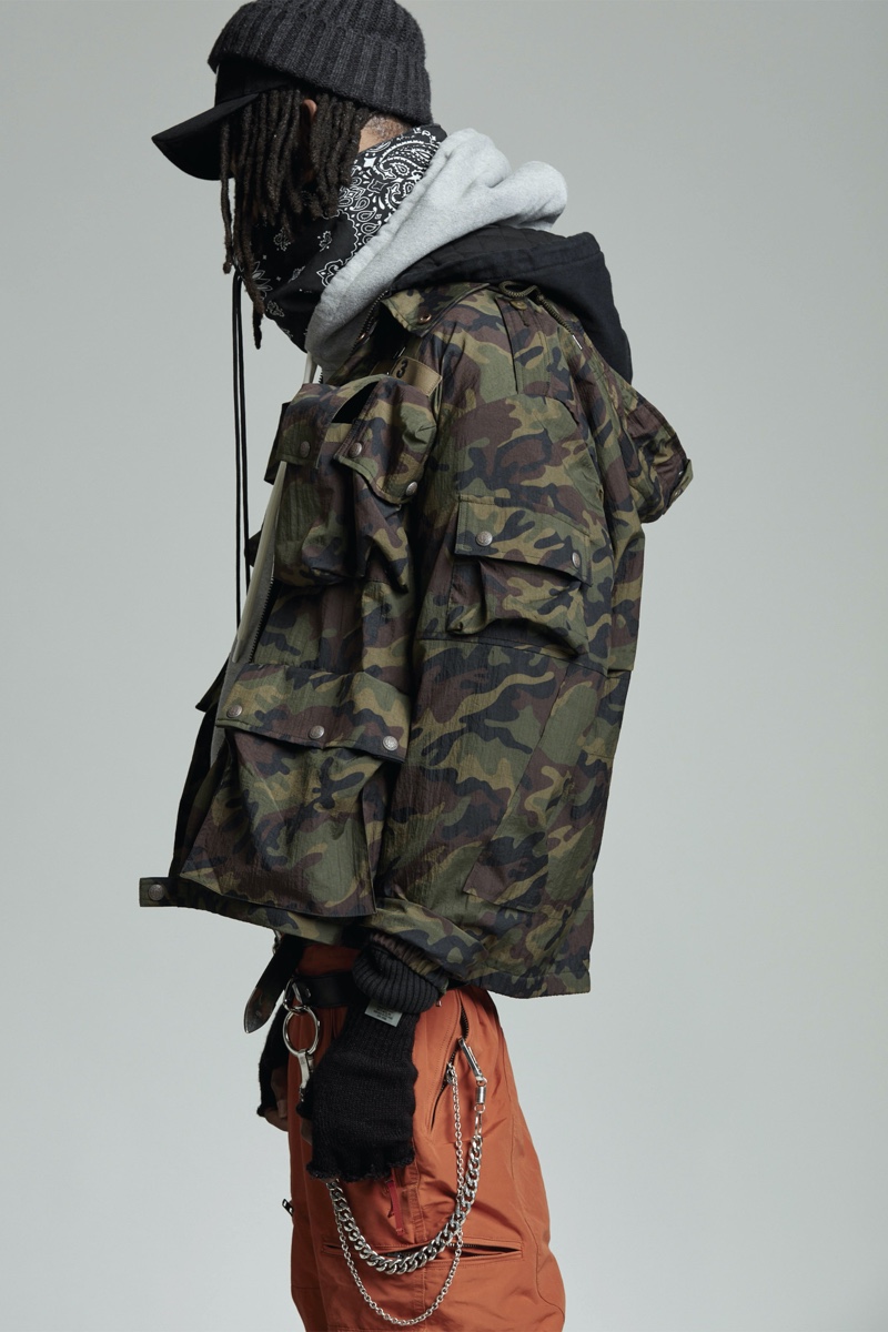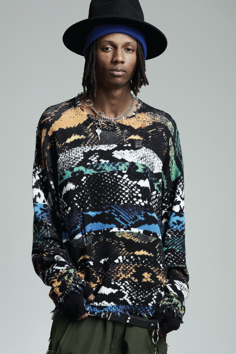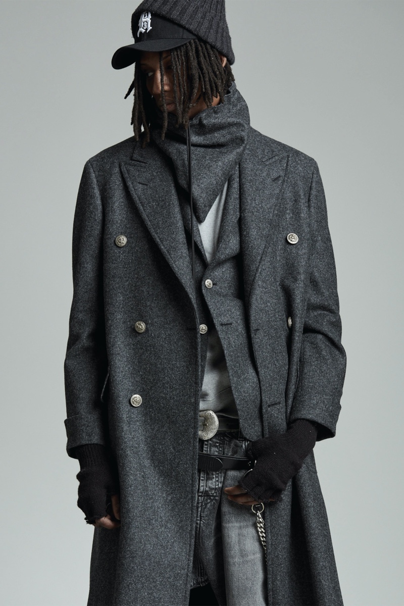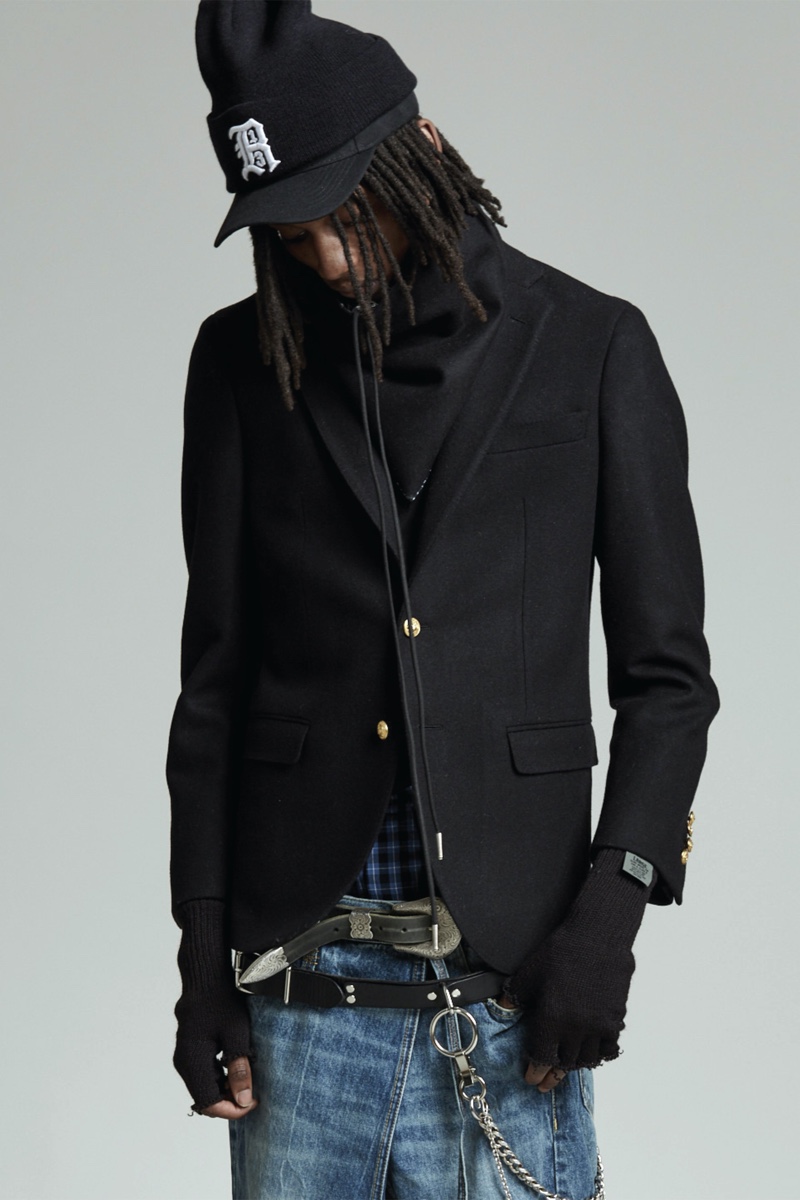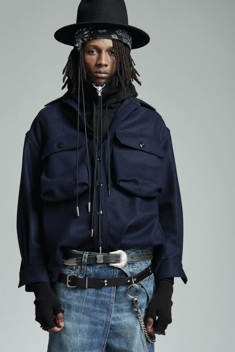 Low-rise fits make a comeback as Chris Leba embraces a slouchy silhouette for R13’s fall-winter 2020 collection. Model PK Holdbrook Smith is nonchalant but cool as he stars in the season’s lookbook. PK takes to the studio in a felt hat and bandana to embody R13’s mysterious man for autumn. It’s easy to picture a modern take on a gun-slinging western with a dark wardrobe. Bolo ties and leather western belts accessorize R13’s must-have outfits. A camouflage leopard print amplifies a juxtaposition of oversized tailoring and essential denim. The motif is front and center for statement fashions that range from an army-style jacket to cuffed pants.