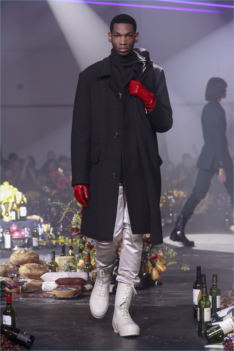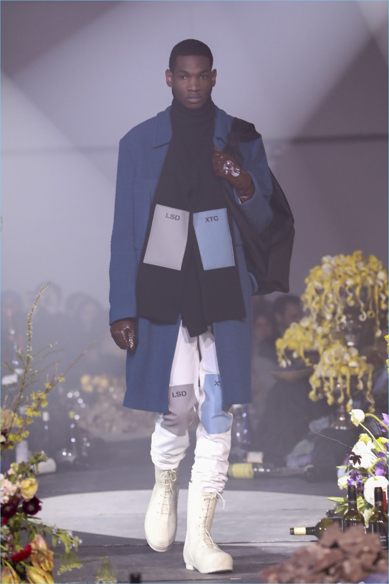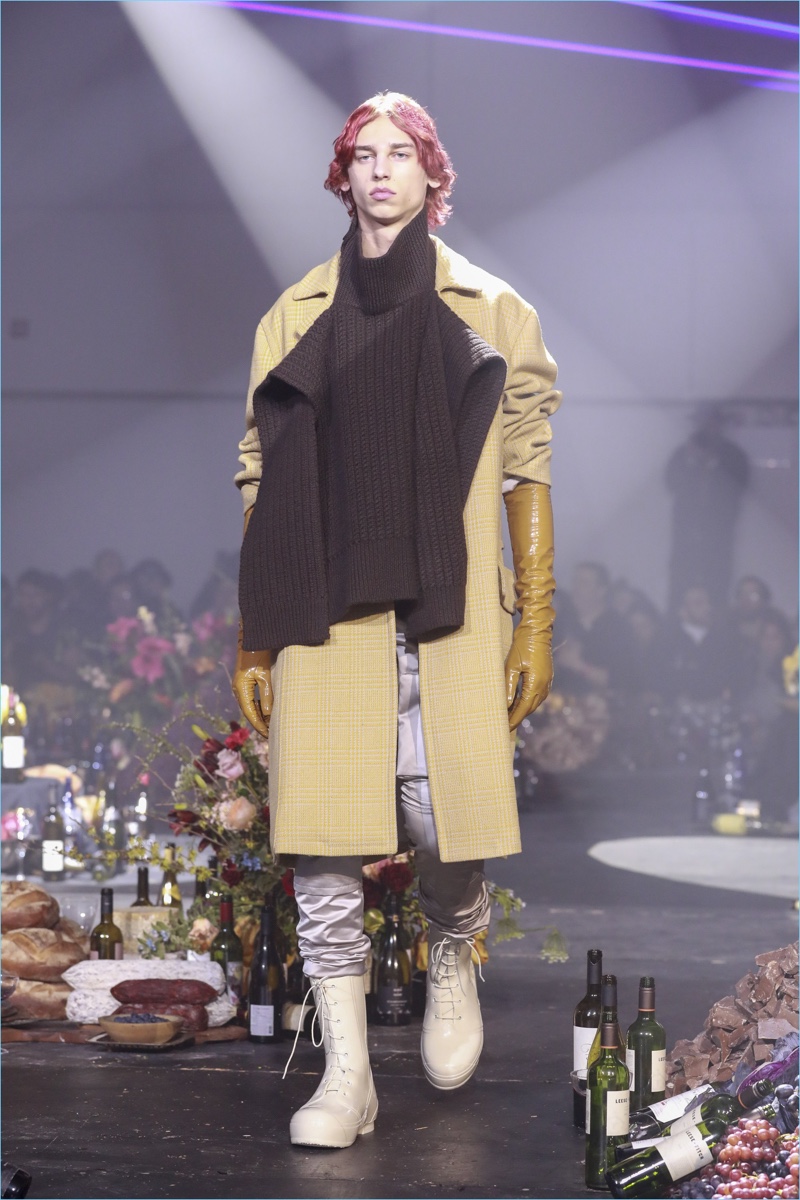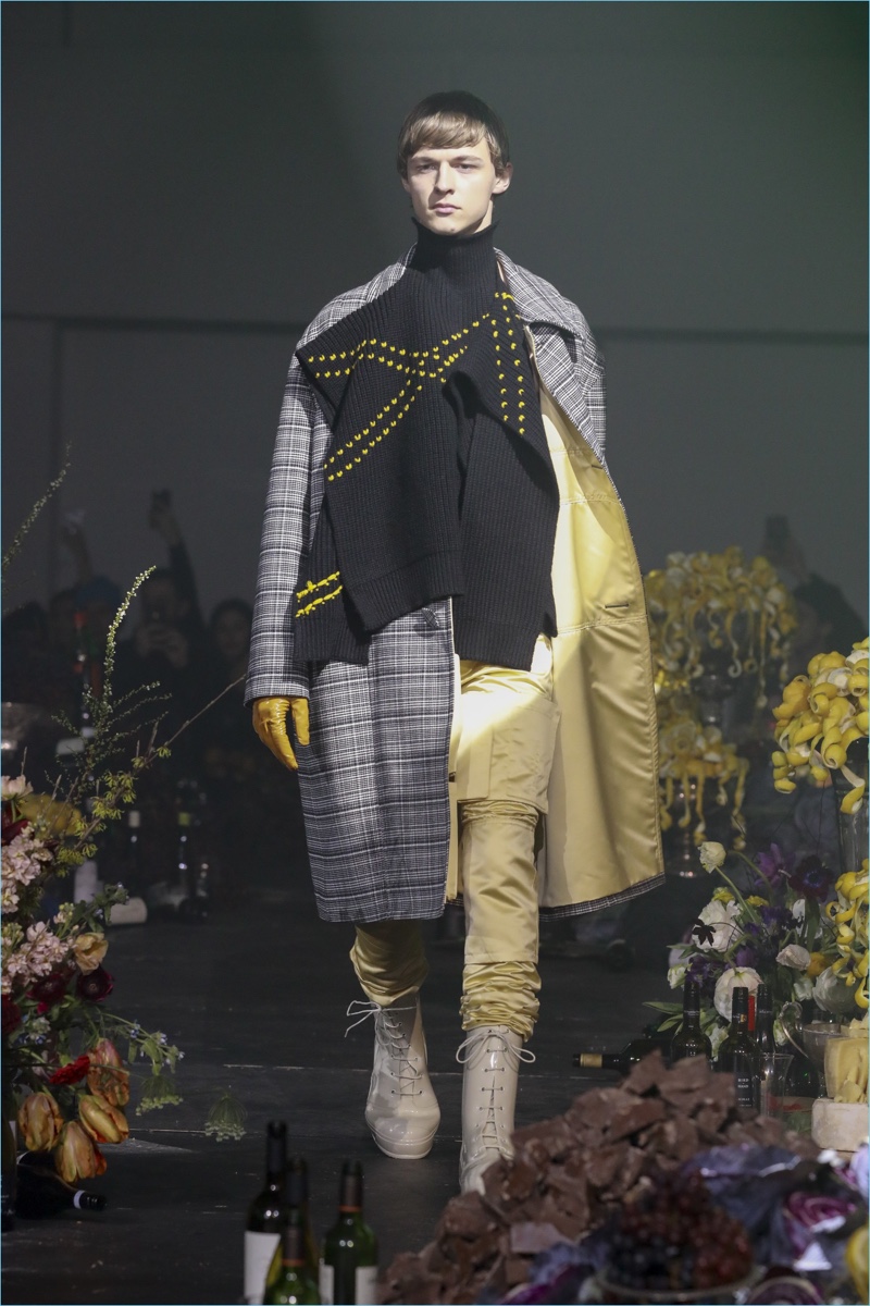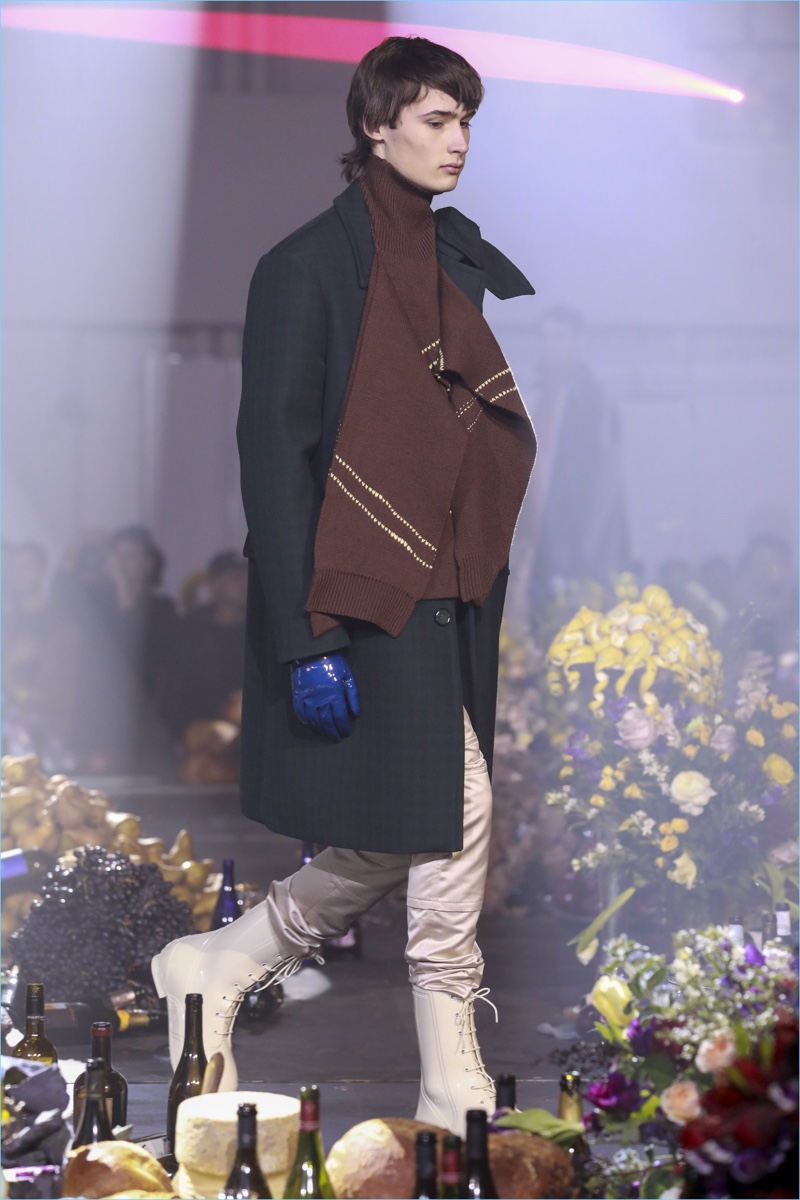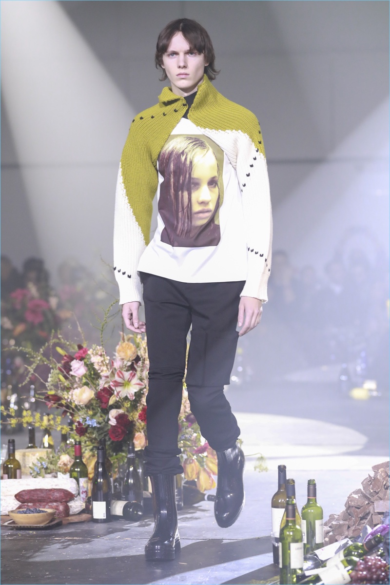 The ageless issue of addiction served as the backdrop for Raf Simons’ fall-winter 2018 collection. The Belgian designer turned to the 1981 film Christiane F. as a starting reference. The biographical drama follows the life of Christiane F. growing up in Berlin’s drug scene of the 1970s. Revisiting a tale of caution, Simons paints a skewed picture for fall. Here, oversized coats come in a multitude of colors. Sharing the limelight, Simons’ outerwear is joined by statement dickeys. The faux sweater fronts provide a visual offset to cigarette-thin cargo pants and a myriad of hidden drug-induced messages.