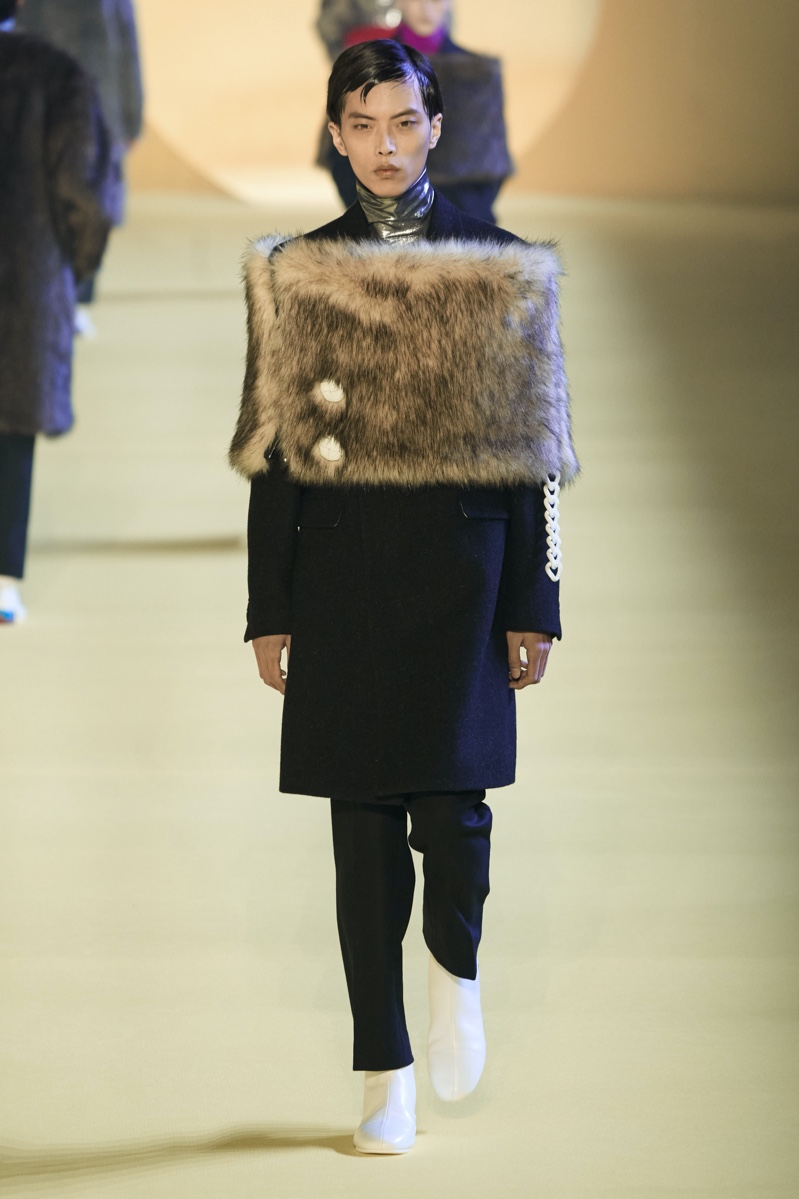 Raf Simons redirects his energy to the “Solar Youth” for a futuristic approach to his fall-winter 2020 collection. Confinement is a running theme for the outing. A sense of transit is front and center as Simons’ man dons sleek coats and jackets with skewed proportions and tape-like embellishments. The dark outerwear receives the layered treatment with metallic turtlenecks and tubular details. Furthermore, fitted, shrunken sweaters maintain a restrictive quality with narrow neck openings that mirror the collection’s slim pleated trousers. Faux fur also makes quite the statement, dressing everything from muffs and coats to scarves.