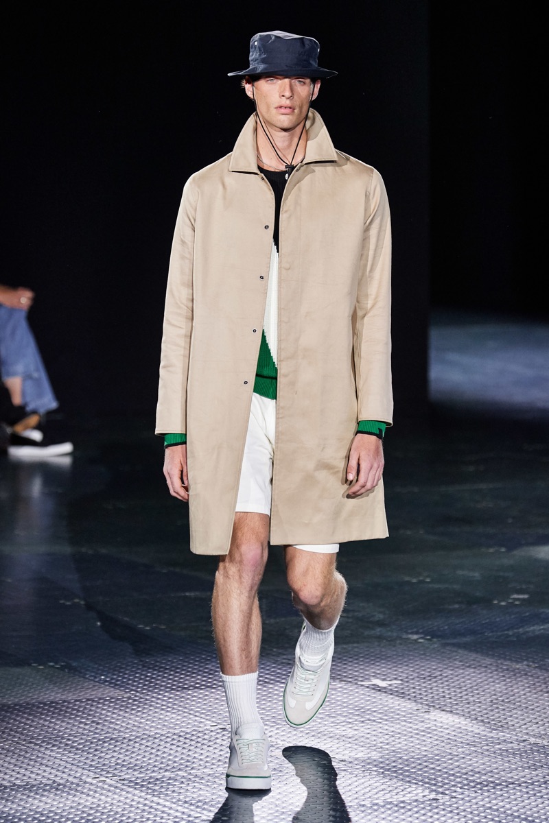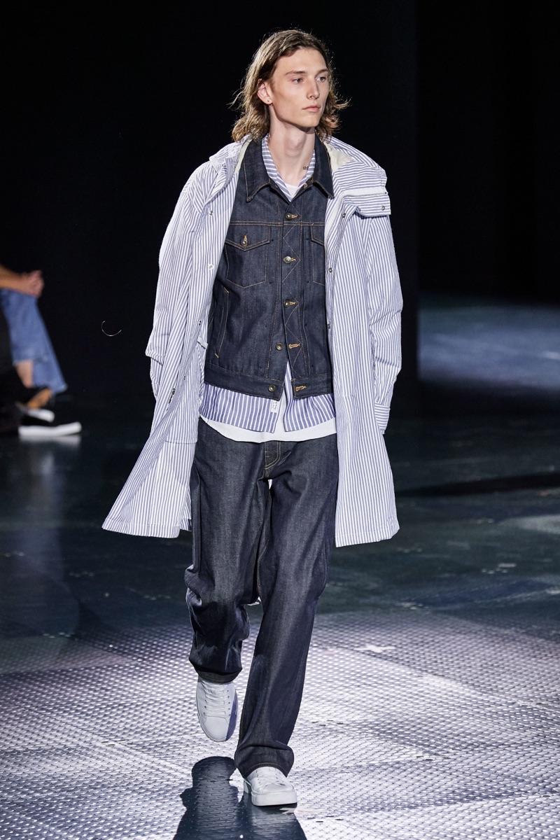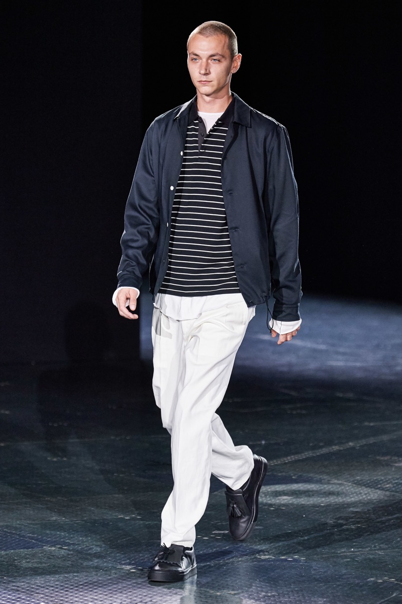 Rag & Bone returns to the runway to present its spring-summer 2020 men’s collection. Shown alongside women’s looks, designer Marcus Wainright unveils a mix of practical clothing. Urban-inspired style seamlessly blends with tailoring for the season. Models such as James Turlington showcase stylish layers, which bring together key clothing items like the coach jacket, parka, and trench coat. Sporadic pops of color join a calming sea of navy and grey. Hero pieces range from graphic knitwear and classic dark wash denim to regular-cut cargo pants.