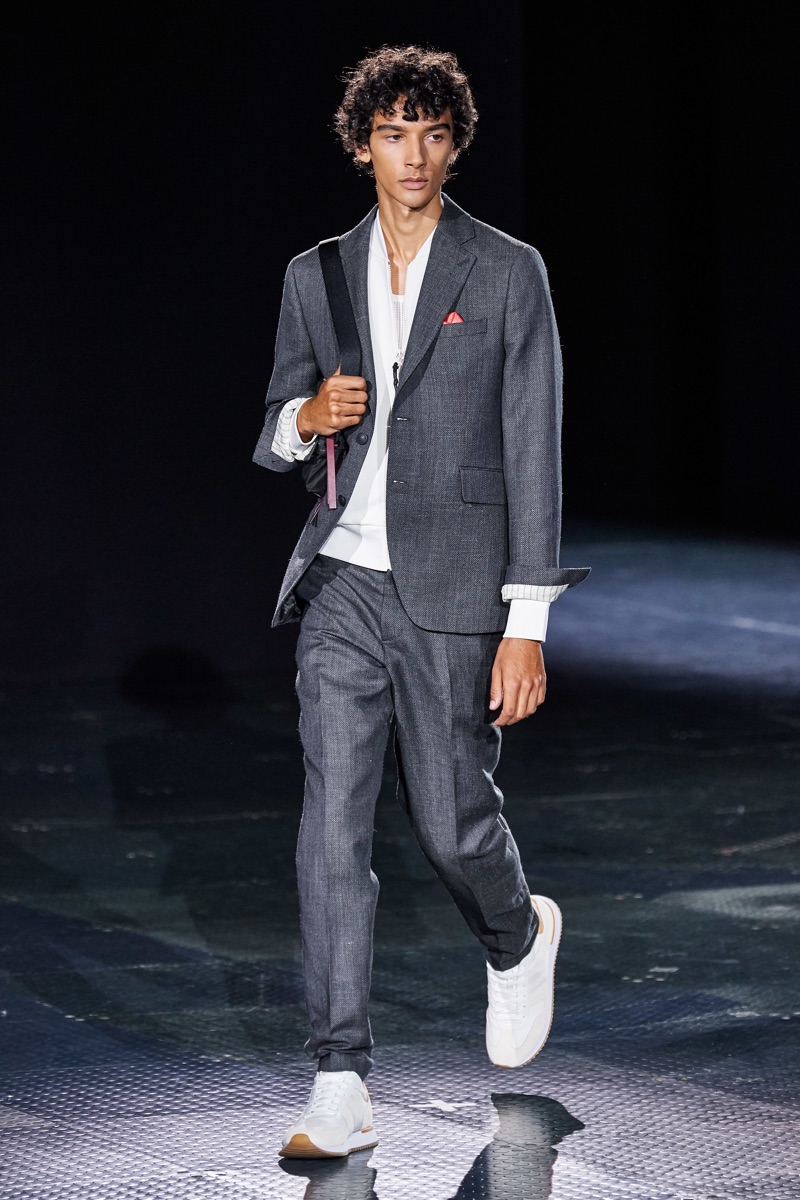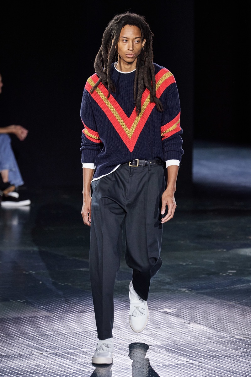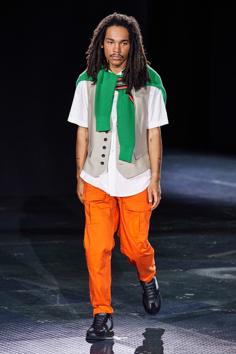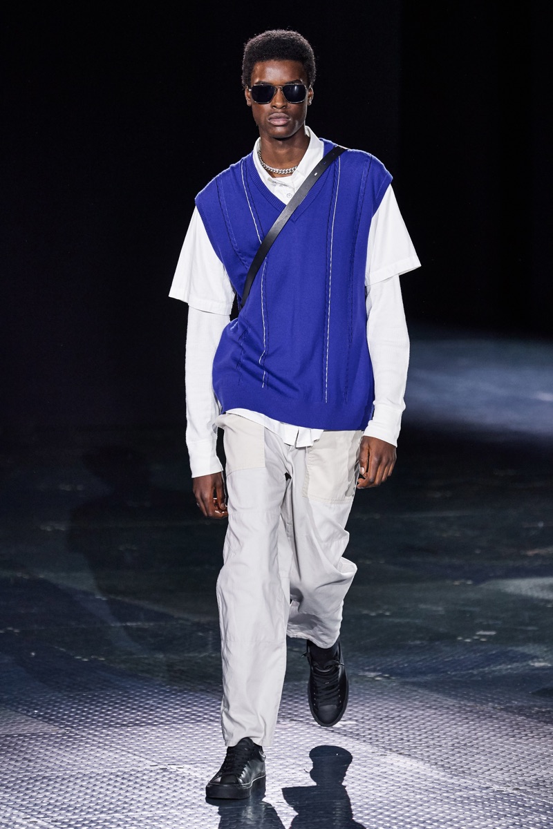 Rag & Bone returns to the runway to present its spring-summer 2020 men’s collection. Shown alongside women’s looks, designer Marcus Wainright unveils a mix of practical clothing. Urban-inspired style seamlessly blends with tailoring for the season. Models such as James Turlington showcase stylish layers, which bring together key clothing items like the coach jacket, parka, and trench coat. Sporadic pops of color join a calming sea of navy and grey. Hero pieces range from graphic knitwear and classic dark wash denim to regular-cut cargo pants.