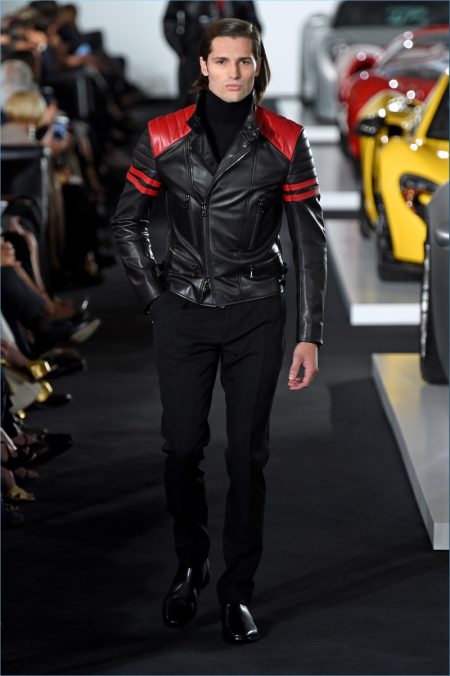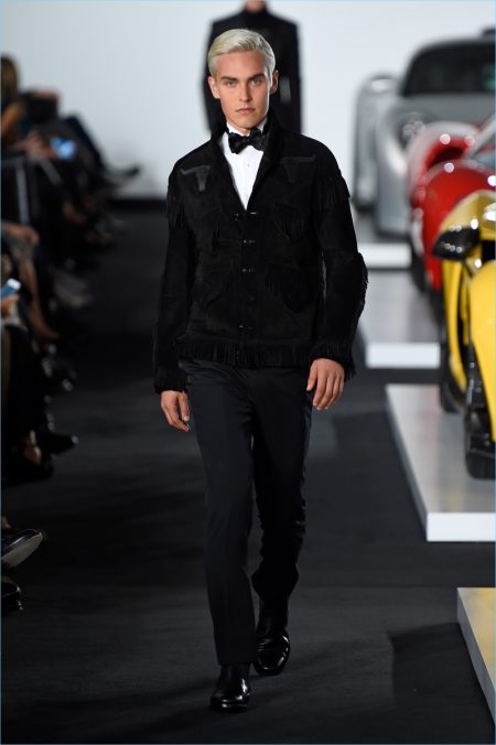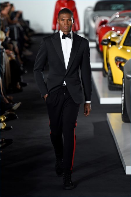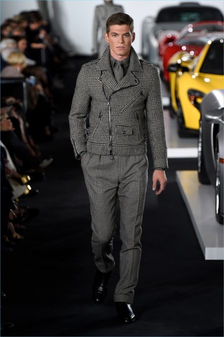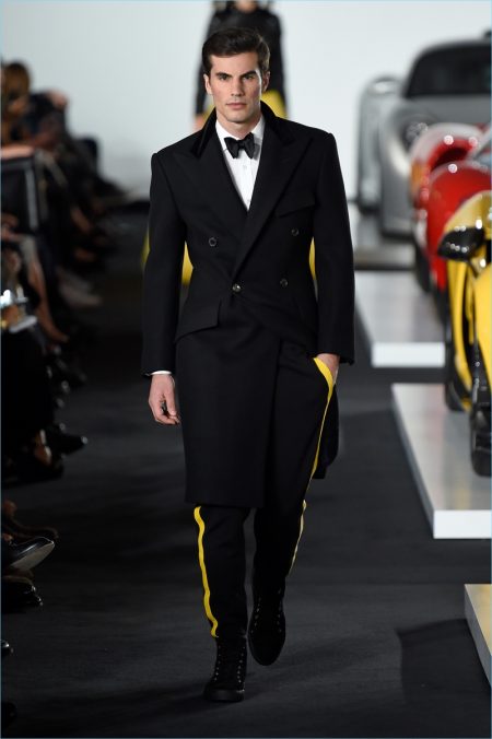Ralph Lauren brought its menswear to New York Fashion Week and put on quite the show. The American brand took to a Bedford garage where Ferraris and Jaguars set the stage. Bringing to mind the car races of the Monaco Grand Prix, Lauren delivered leather racer jackets and even a boiler suit. However, the collection still featured a gorgeous array of evening jackets and tuxedo pants. The racing theme was interweaved into eveningwear with key elements like yellow striping. In addition to elegant formal attire, highlights for the gentlemen included houndstooth coats and smart suiting separates.