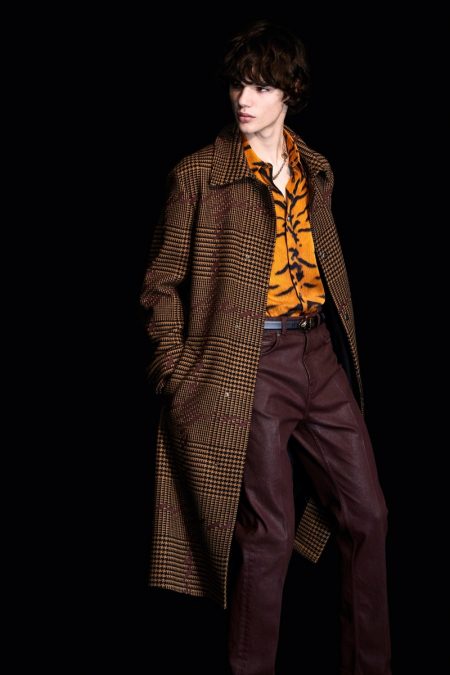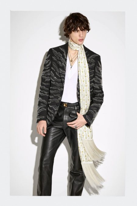 Roberto Cavalli returns to the spotlight with its fall-winter 2020 men’s collection. After a more subdued chapter under Paul Surridge, the fashion house doubles down on its animal prints with an impactful reintroduction. Model Fernando Lindez is the face of the season as he takes to the studio in bold numbers. He wears what’s akin to a second skin with a wardrobe of leopard prints and leather. Here, a dark color scheme and glamorous hand paint a classic rock ‘n’ roll image. From a fringed scarf to a patterned suit jacket, Roberto Cavalli remains true to its timeless DNA.