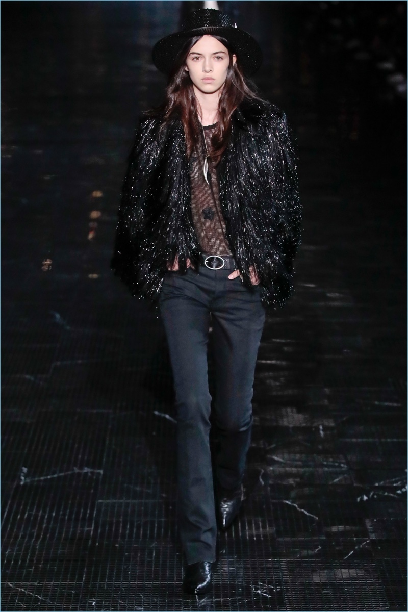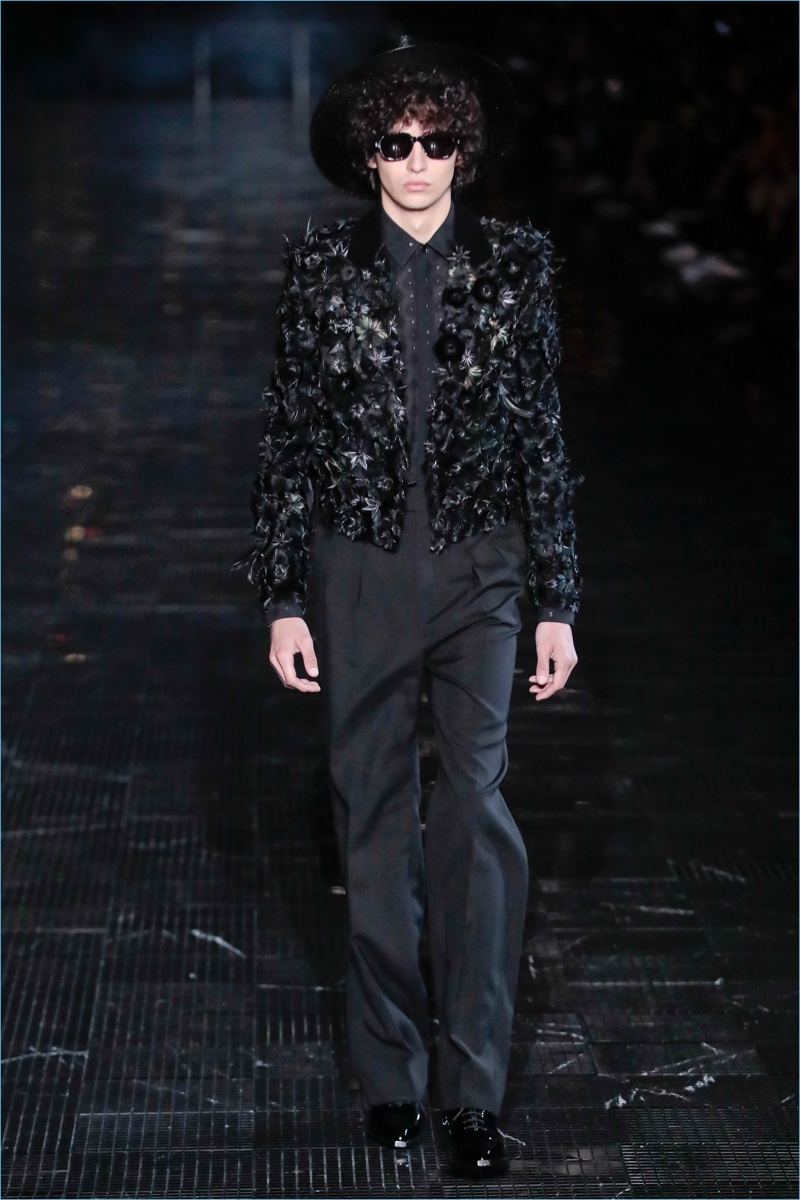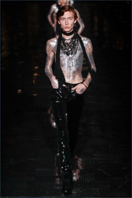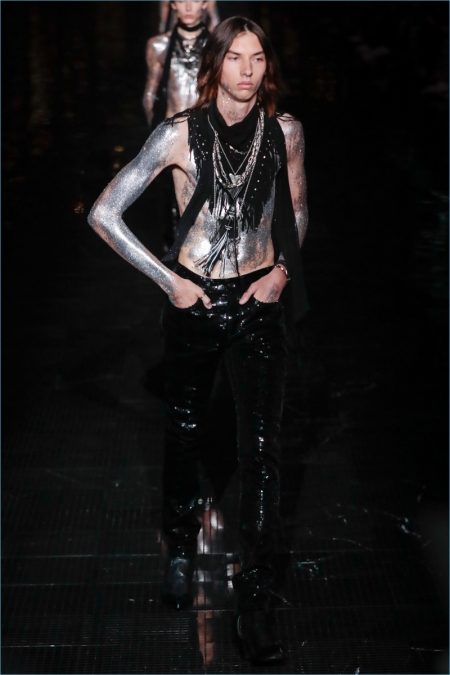 Anthony Vaccarello takes inspiration from 1970s New York for Saint Laurent’s spring-summer 2019 collection. In fact, the season brought the French fashion house close to the iconic city with a show at New Jersey’s Liberty Park. Saint Laurent’s rocker-chic aesthetic was once again front and center for the occasion. Black skinny jeans and cigarette trousers accented leather detailed blazer, suede jackets, and more. Sequins and glittered embellishments added an androgynous attitude to the collection. Meanwhile, sheer tops, frail scarves, and tailored jackets brought home a Parisian spirit. Finally, the show closed with shirtless male models that were clad in sequined pants and covered in glitter body paint. Models such as Lennon Gallagher and Jonas Glöer cemented Saint Laurent’ cool allure.
