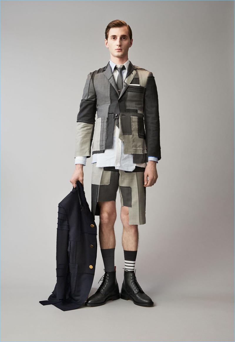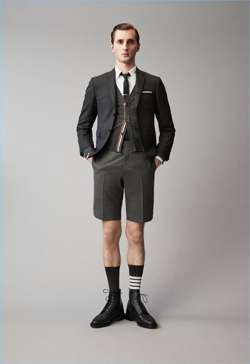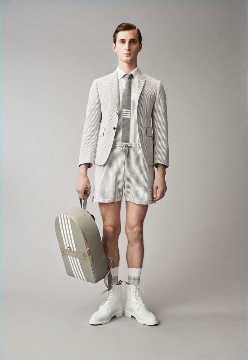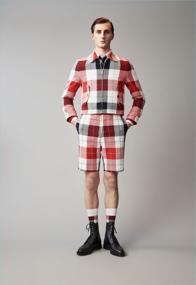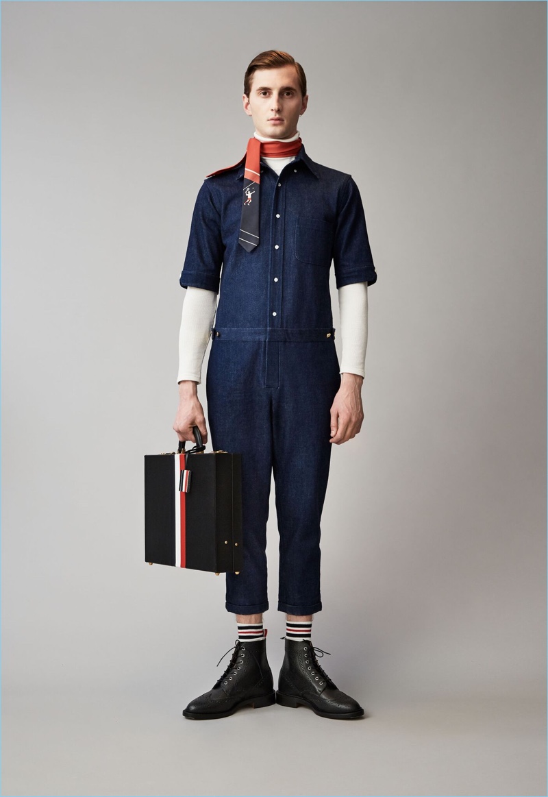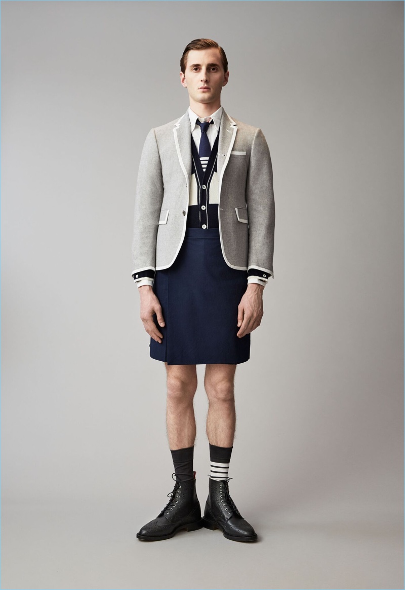 When it comes to Thom Browne’s spring-summer 2018 collection, the designer makes a statement with a skirted proposal. However, the traditional Browne staples shine in the spotlight for resort season. Shades of grey come together with short suits, pleated cropped trousers, and sharp coats. The lineup also features knitwear with a playful tennis motif. In addition to a statement boiler suit and bold pinstripes, Browne colors the season with a variety of Madras prints.
