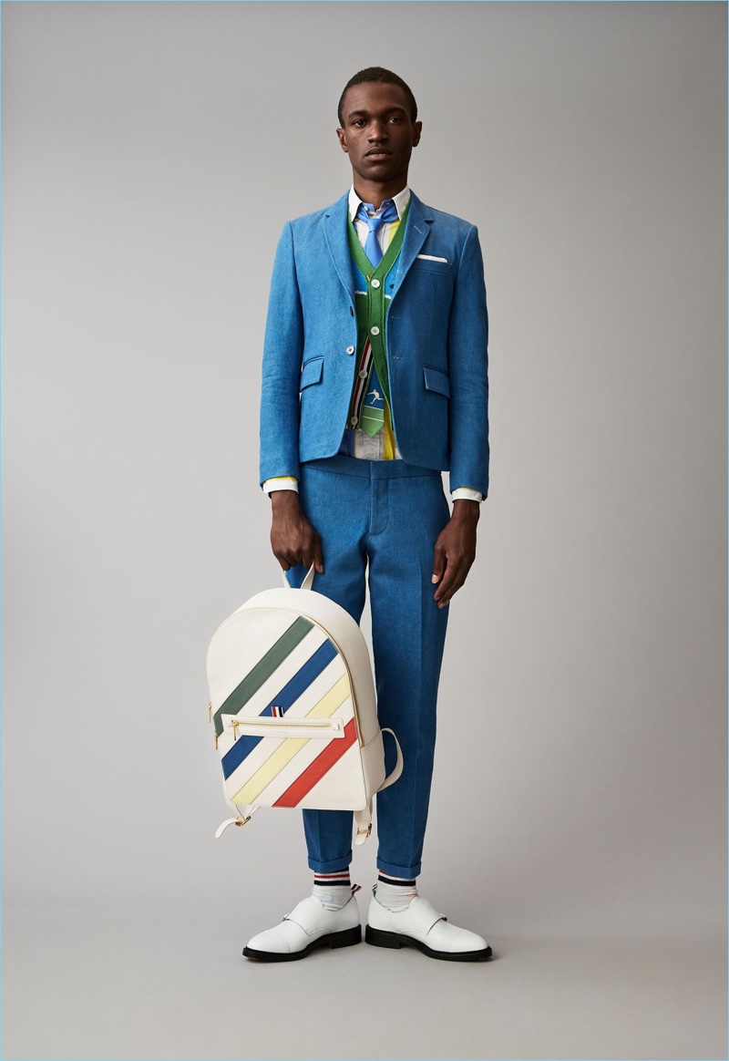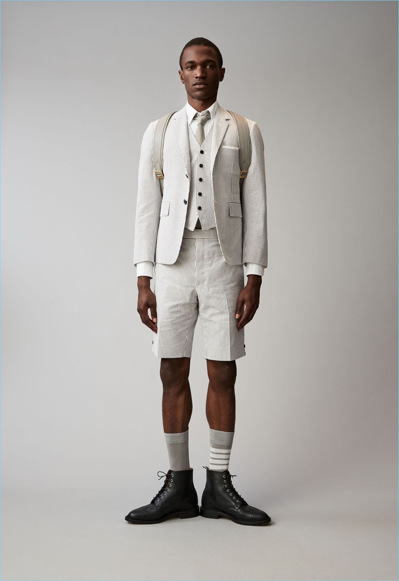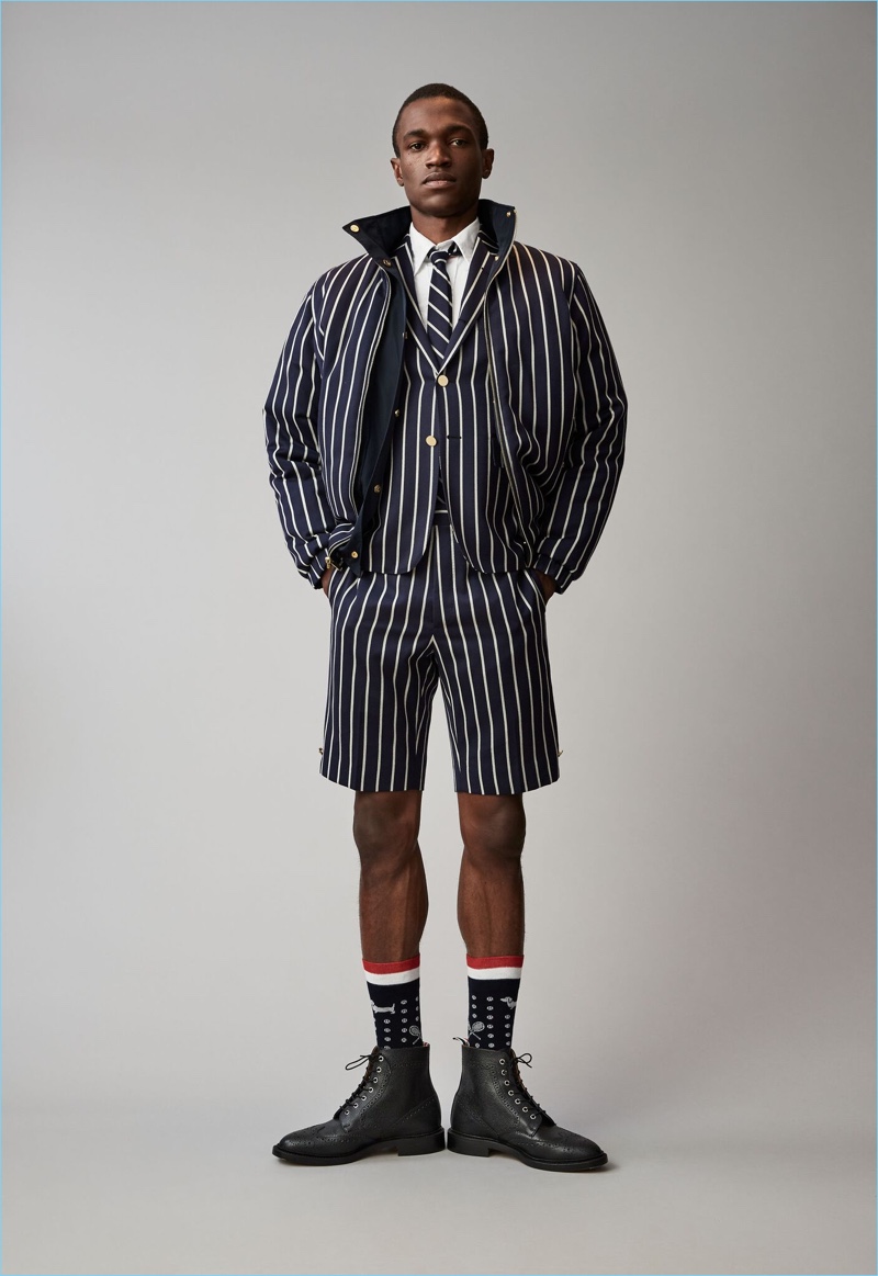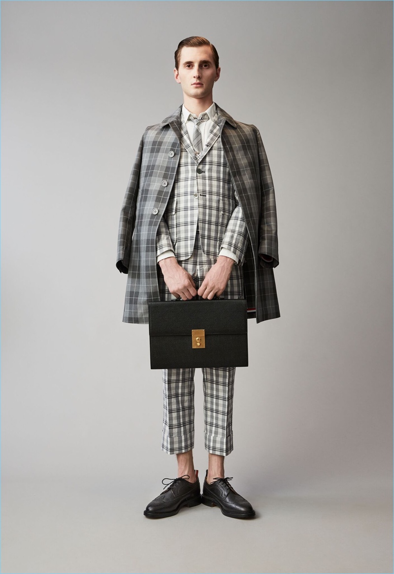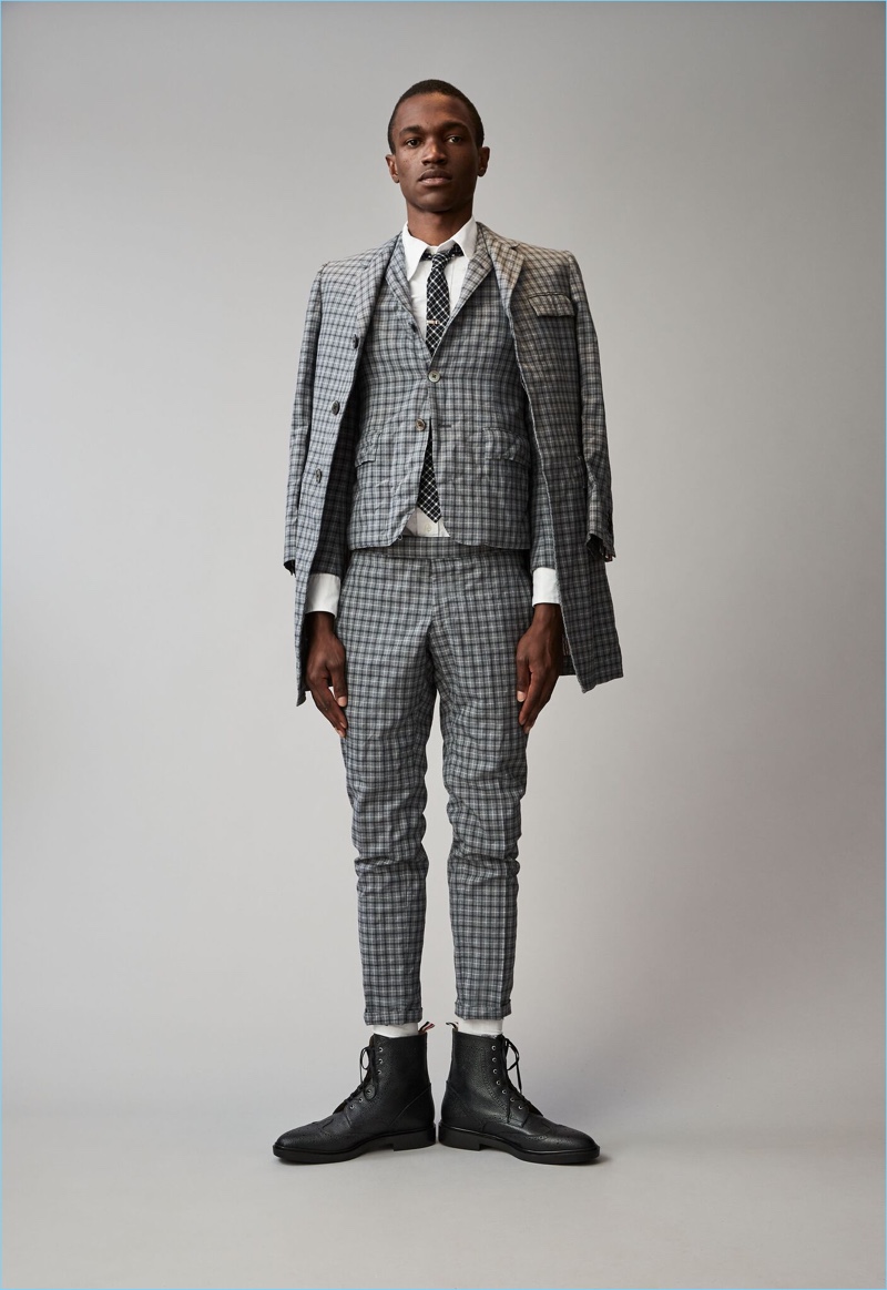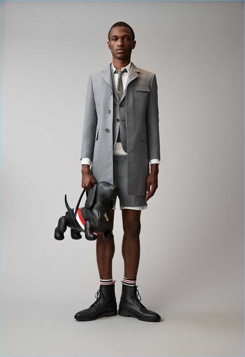 When it comes to Thom Browne’s spring-summer 2018 collection, the designer makes a statement with a skirted proposal. However, the traditional Browne staples shine in the spotlight for resort season. Shades of grey come together with short suits, pleated cropped trousers, and sharp coats. The lineup also features knitwear with a playful tennis motif. In addition to a statement boiler suit and bold pinstripes, Browne colors the season with a variety of Madras prints.