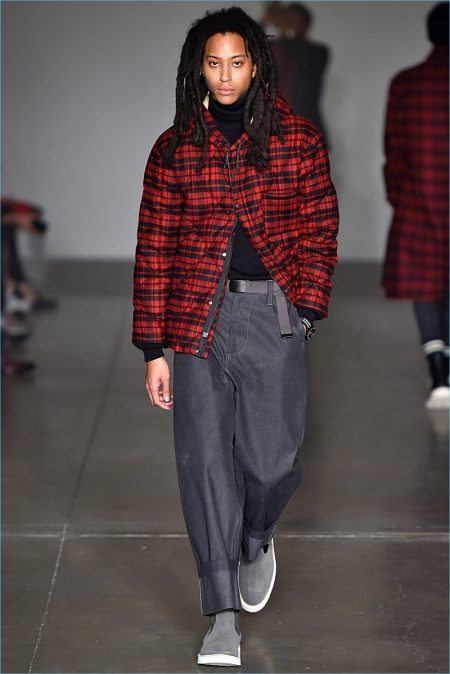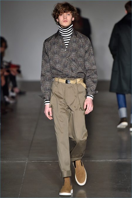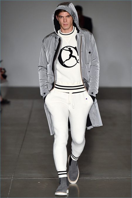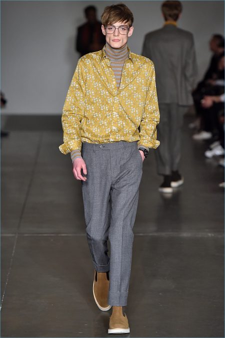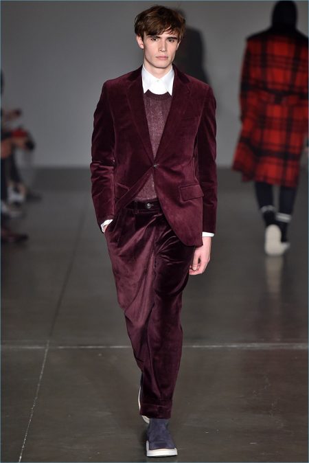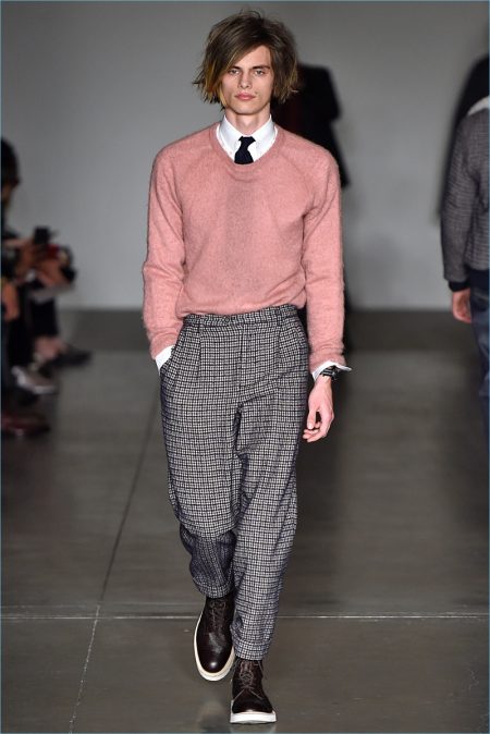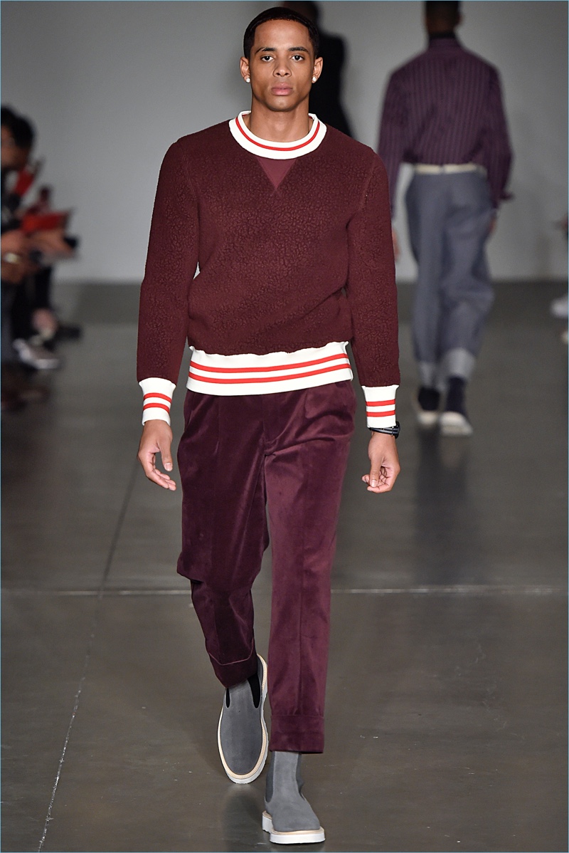 Todd Snyder presents his take on “old (new) school” style for fall-winter 2018. Snyder revisited the book Jocks and Nerds: Men’s Style in the Twentieth Century as well as tailor Tommy Nutter for inspiration. The designer describes the season as a smart slacker vibe that’s part aesthete, part athlete, part Savile Row rebel. It’s here that Snyder’s penchant for East Coast prep style meets silhouettes from Swinging London. Embracing oversized proportions, sack suits come together with hoodies, sweaters, acid washed denim and sweaters. Additional standouts include sport coats, cardigans, and tailored tracksuits. Making a case for modern trends, Snyder’s collection also features statements that range from a sherpa fleece coat to one in mohair. The American designer used his latest show as an opportunity to showcase his new Timex collaboration as well.