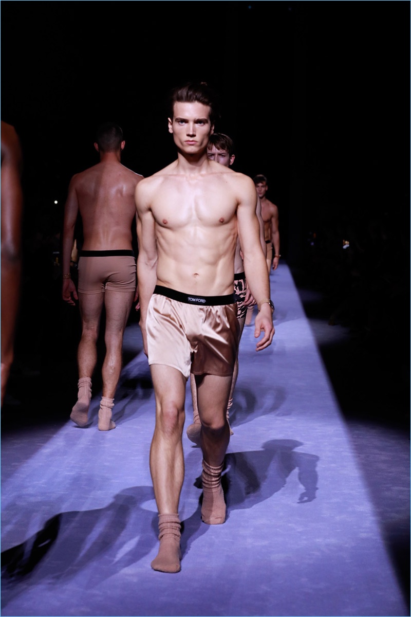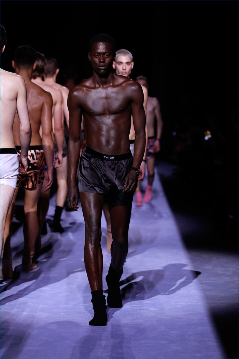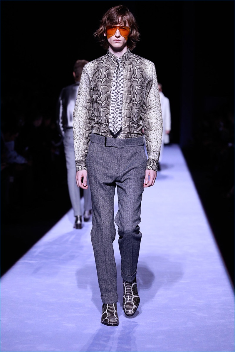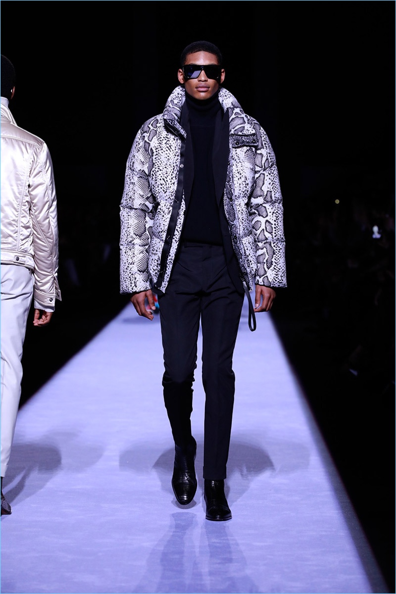 Tom Ford staged his first menswear show during New York Fashion Week Men’s. The American designer not only presented his fall-winter 2018 collection but launched ranges for timepieces and underwear. Bringing to mind his time at Gucci, Ford opted for an opulent approach to the season. Luxurious fabrics and bold prints come together for the Tom Ford man. The lineup makes a case for everyday glamour with a sharp approach to the modern wardrobe. Highlights range from printed suit jackets and puffer coats to chic turtleneck sweaters. Animal prints and flesh tones worked their way from the collection’s garments to Ford’s new underwear line. The perfect finishing touch to the outing, Ford’s Swiss-made timepieces come in 18-karat yellow gold and matte black. The rectangular styles feature interchangeable straps of hand-woven braided leather, stitched leather, pebbled grain leather, and alligator.