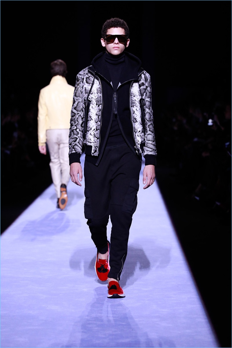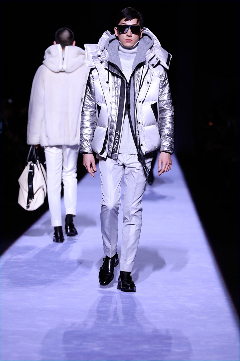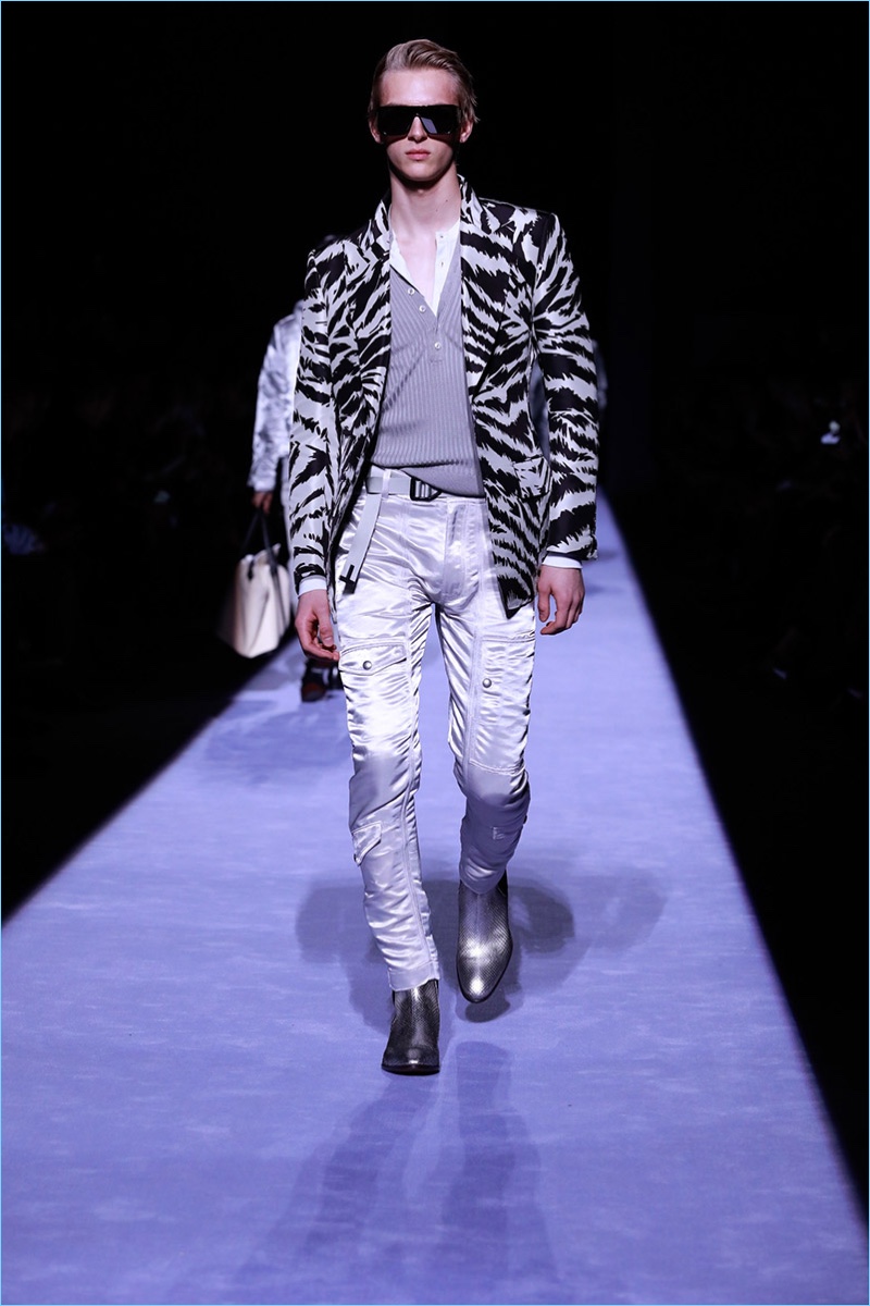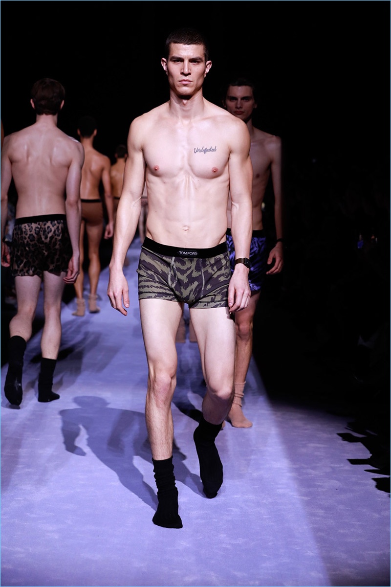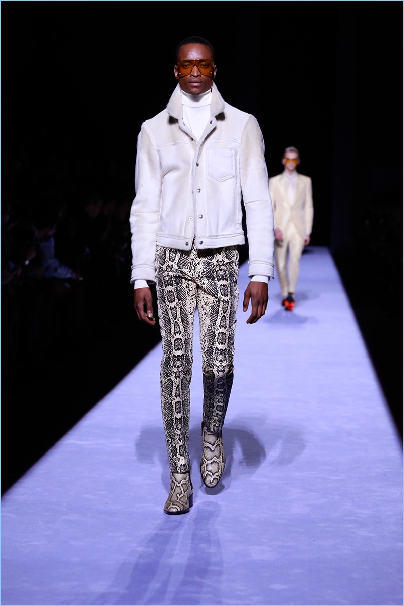 Tom Ford staged his first menswear show during New York Fashion Week Men’s. The American designer not only presented his fall-winter 2018 collection but launched ranges for timepieces and underwear. Bringing to mind his time at Gucci, Ford opted for an opulent approach to the season. Luxurious fabrics and bold prints come together for the Tom Ford man. The lineup makes a case for everyday glamour with a sharp approach to the modern wardrobe. Highlights range from printed suit jackets and puffer coats to chic turtleneck sweaters. Animal prints and flesh tones worked their way from the collection’s garments to Ford’s new underwear line. The perfect finishing touch to the outing, Ford’s Swiss-made timepieces come in 18-karat yellow gold and matte black. The rectangular styles feature interchangeable straps of hand-woven braided leather, stitched leather, pebbled grain leather, and alligator.