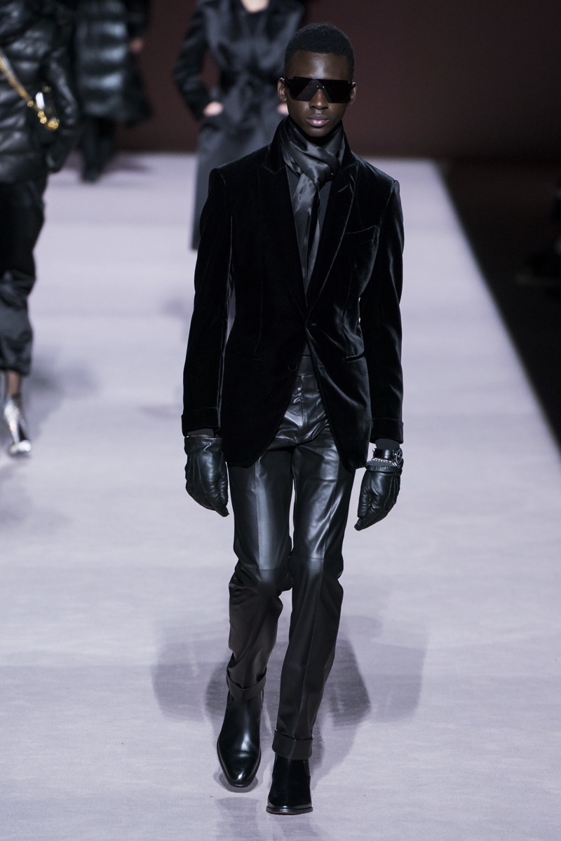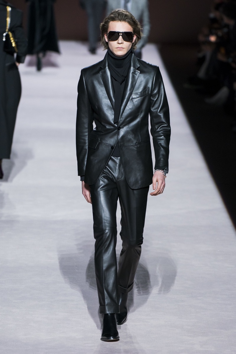 A somber color palette defines the season with monochromatic numbers. Ford’s offering this time around is minimal with a focus on sharply tailored suiting. Understated but glamorous, the selection includes pinstriped suiting, leather suits, and dashing evening jackets. On a more casual note, Ford showcases full-zip jackets, single-breasted coats, and puffer jackets.