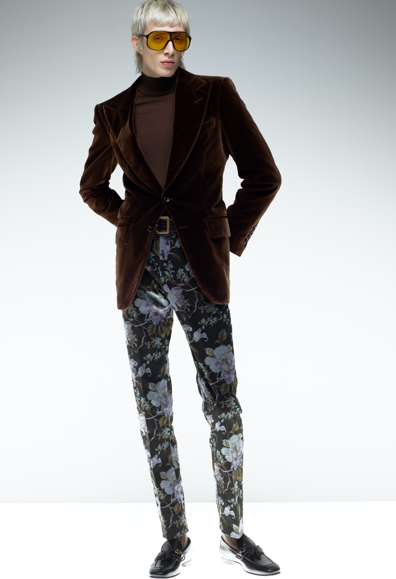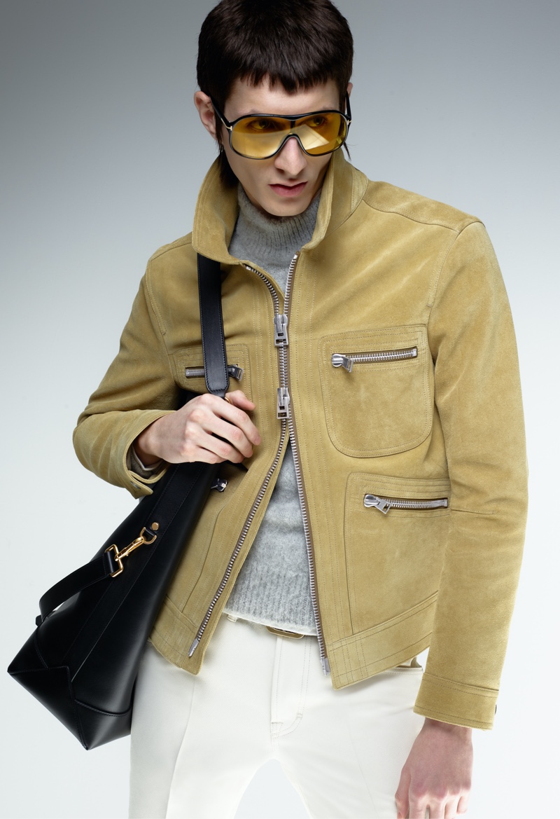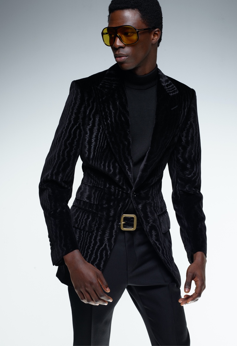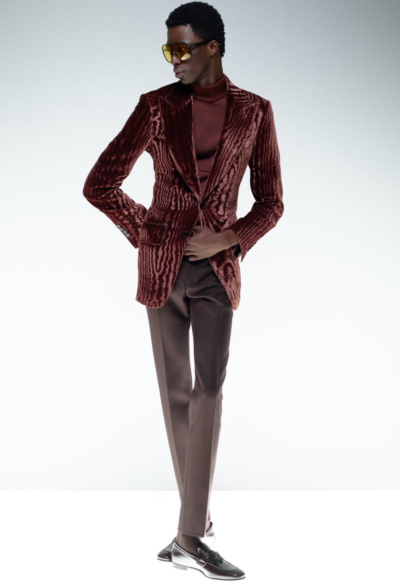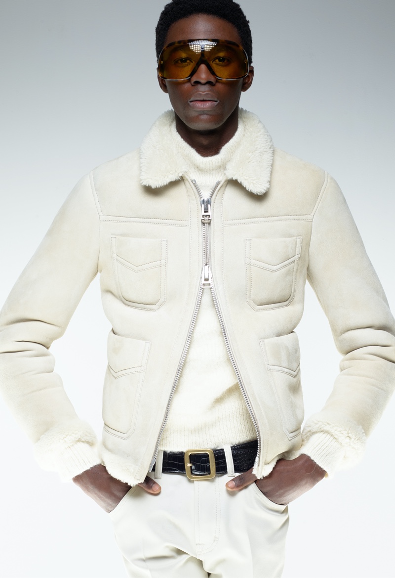 For fall-winter 2021, Tom Ford is right on trend with the hope that life post-COVID will return to normal. Photographer Julien Martinez Leclerc captures Ford’s latest designs on models Henry Kitcher, Cherif Douamba, and Maikls Mihelsons. Here, Ford’s man eases into glamorous dressing once more “but in a slightly more casual yet luxurious way.” References to the 1960s and ’80s emerge with a wardrobe that balances everyday style’s practical needs with men’s desire to dress in a sophisticated fashion. Caramel, turquoise, dusty pink, jade, and acid yellow tones peek out from a sea of neutrals, giving life to must-haves like a double-breasted jacket or military coat. Meanwhile, Ford elevates jeans with the use of mohair twill. A shorter cut brings attention to Ford’s stylish boots and 1960’s loafers. Fun standouts for the season range from a floral print jacket and oversized down outerwear to bleached denim jeans. Paying a nod to the increased time spent at home, colorful robes and pajamas in vibrant prints round out the collection.
