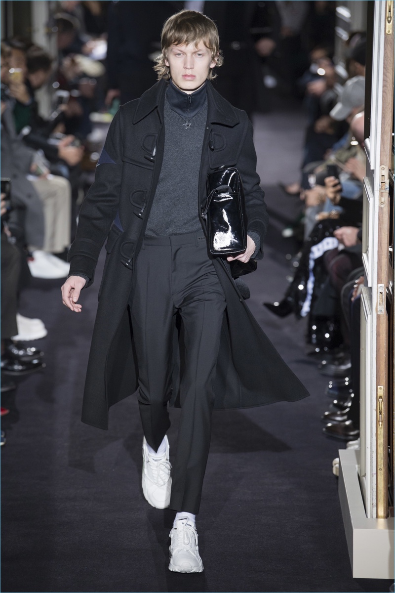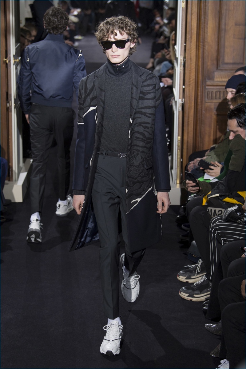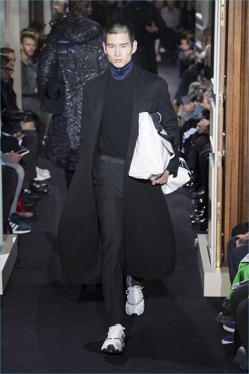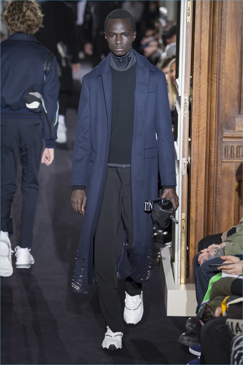 Valentino creative director Pierpaolo Piccioli took on new romantic style for his fall-winter 2018 collection. The theme resulted in Piccioli scaling back on prints and colors, in favor of a minimal mood. Proposing a quiet rebellion, details came in subtle doses. Inspired by The Cure, Piccioli added embellishments like studs to shoulders. The collection also included tonal graphic prints. However, the range celebrated a fluidity in silhouettes at its core. Dressed in navy and black, a cohesive lineup turned out practical pieces with relaxed tailoring. Embodying a modern sophistication, the Valentino man took to the catwalk in open coats, trim track pants, short bomber jackets, crewneck sweaters, and refined parkas. White sneakers completed the accessible looks.