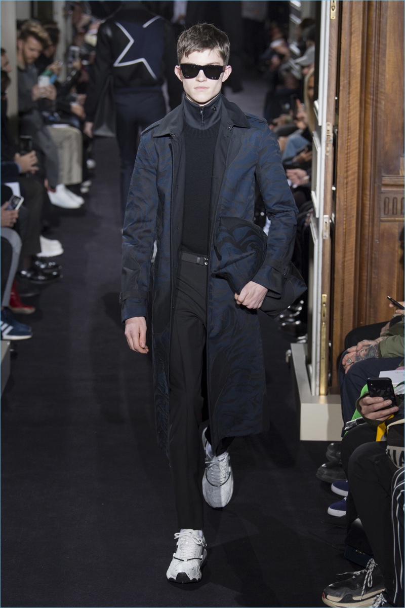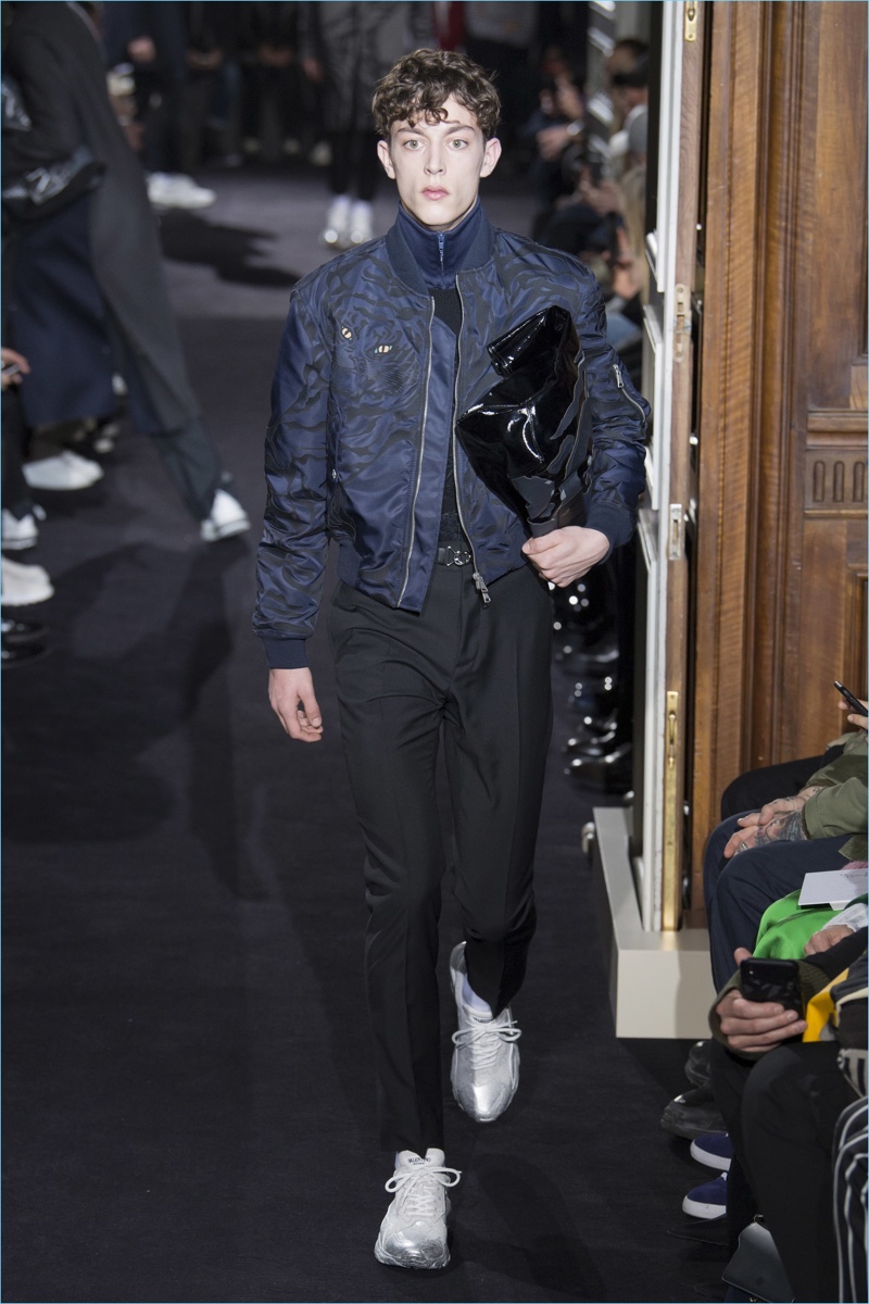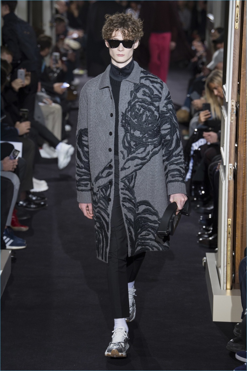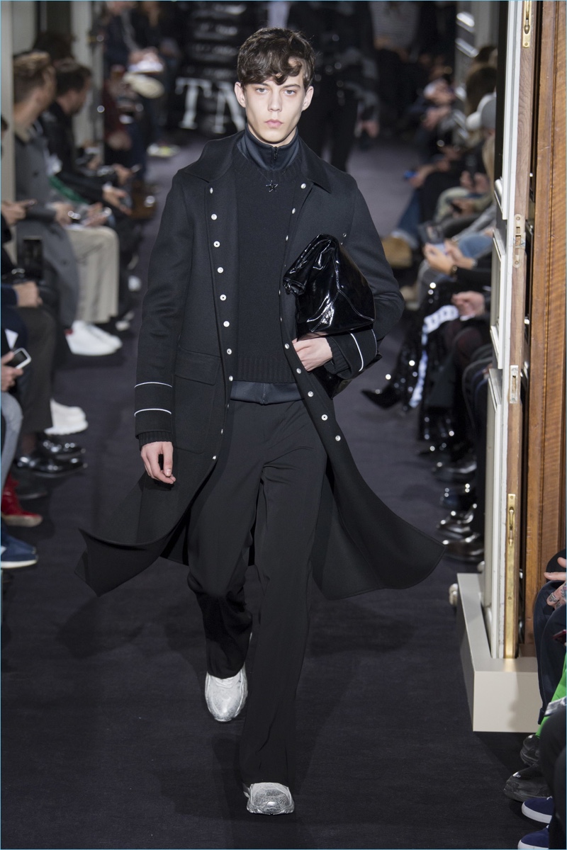 Valentino creative director Pierpaolo Piccioli took on new romantic style for his fall-winter 2018 collection. The theme resulted in Piccioli scaling back on prints and colors, in favor of a minimal mood. Proposing a quiet rebellion, details came in subtle doses. Inspired by The Cure, Piccioli added embellishments like studs to shoulders. The collection also included tonal graphic prints. However, the range celebrated a fluidity in silhouettes at its core. Dressed in navy and black, a cohesive lineup turned out practical pieces with relaxed tailoring. Embodying a modern sophistication, the Valentino man took to the catwalk in open coats, trim track pants, short bomber jackets, crewneck sweaters, and refined parkas. White sneakers completed the accessible looks.