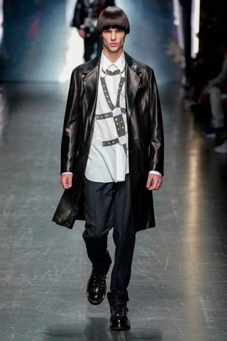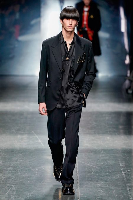 Recently acquired by Michael Kors Holdings Limited, Versace did not miss a step with its fall-winter 2019 men’s collection. As usual, the fashion house took to the Milanese catwalk with bold prints and vibrant colors. The collection playfully tackles a bondage theme with harness graphics and leg straps. Versace’s signature prints bring a nineties nostalgia to the outing with bright hues and plenty of statement pieces. Embracing relaxed silhouettes, the lineup features slouchy trousers, oversized coats, boxy short-sleeved shirts. Fueling a sporty aesthetic, boxing shorts join tracksuit jackets, sneakers, patterned knits, and quilted jackets.