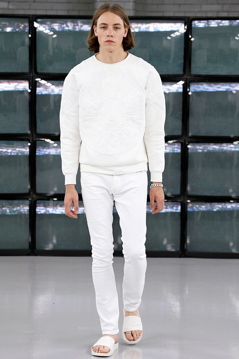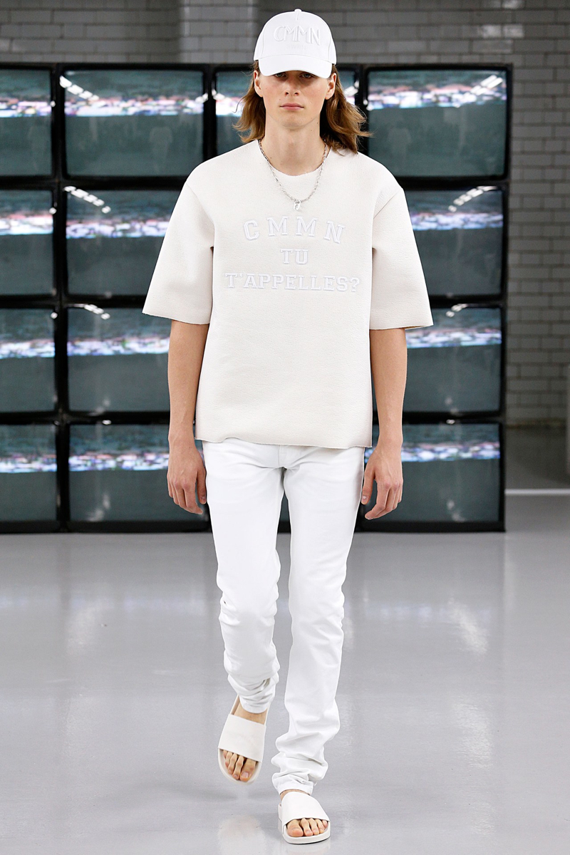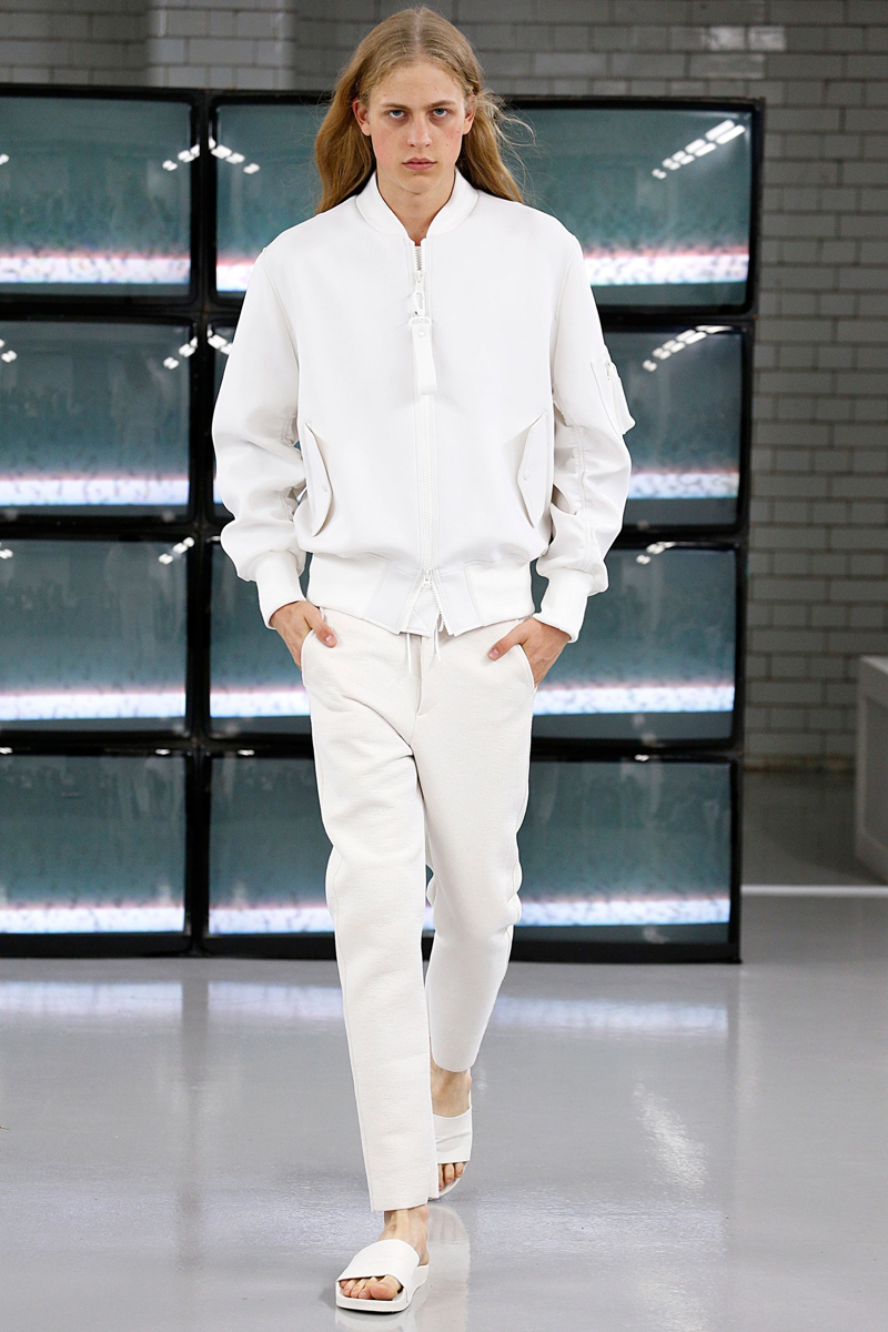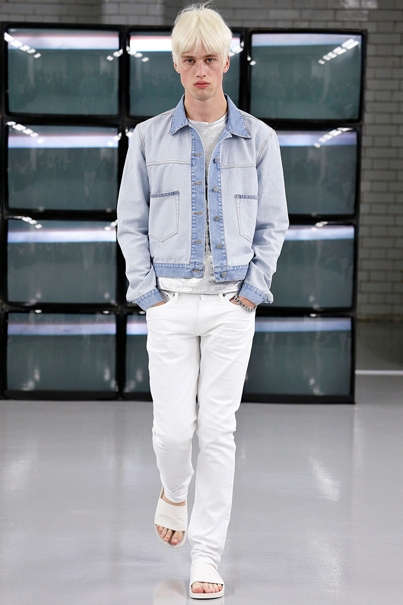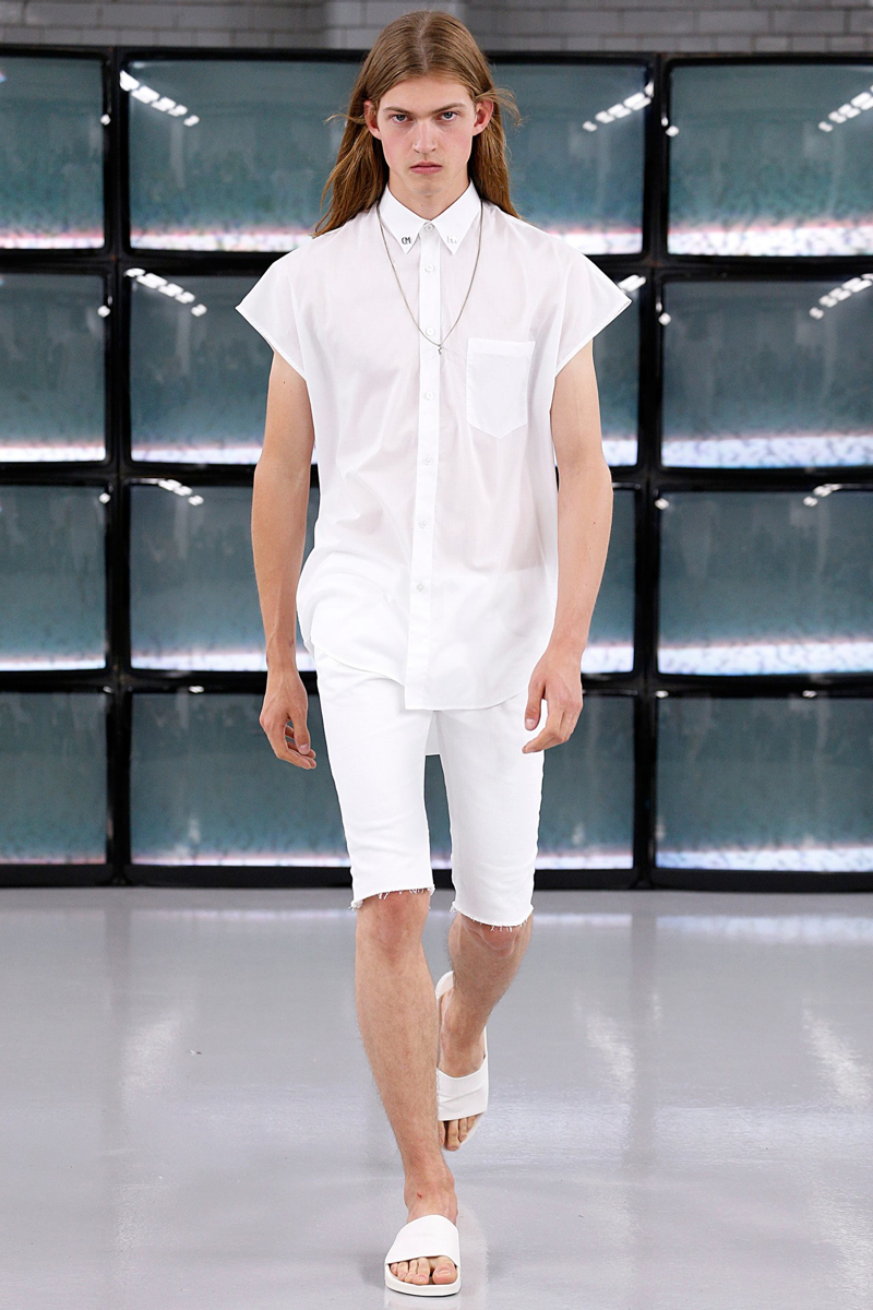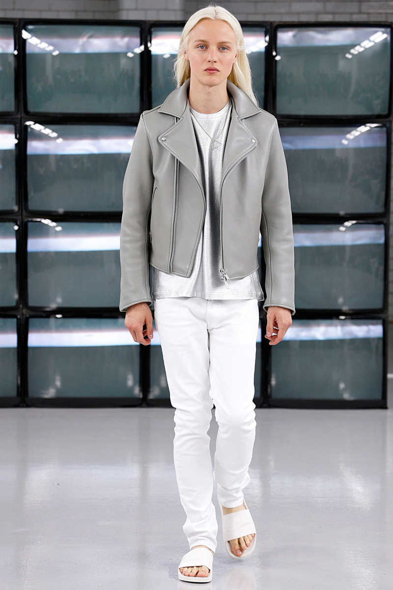 COMMON Spring/Summer 2015–Swedish label COMMON brings a fresh clean attitude to London Collections: Men, presenting its spring/summer 2015 collection. The laid-back outing included a crisp white color palette, accented with touches of metallic silver and light washed denim. Simple and to the point, skinny jeans, sweatshirts, leather motorcycle jackets, and short-sleeve shirts contributed to an easily accessible outing that still boasted a certain attraction.