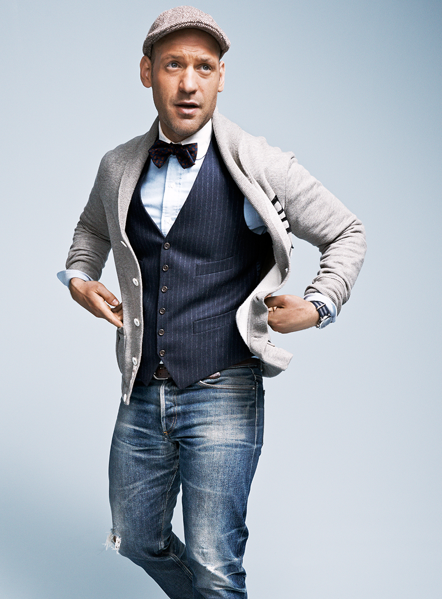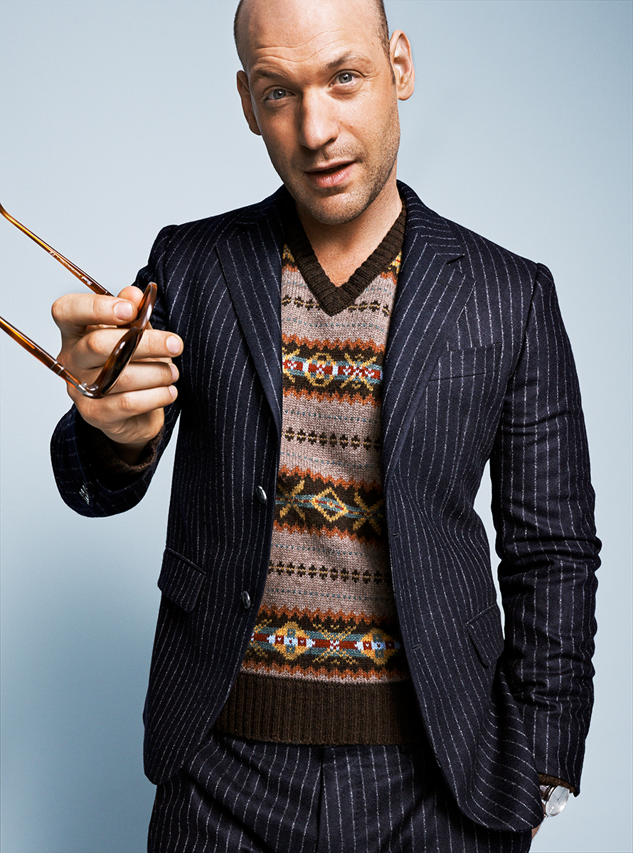 Corey Stoll Gets a Pinstriped Makeover-‘Non-Stop’ actor Corey Stoll graces the pages of GQ’s August 2014 issue with a fashion story shot by photographer Tom Schirmacher. Hitting the photo studio, Stoll is model for the day, charming in remixed pinstripe fashions. Going from casual to formal is captured in joggers, suit jackets, knitwear and jeans, Stoll is a dynamic force of style.