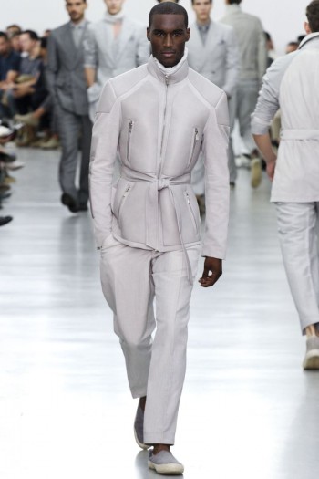 Modern Equipment–Approaching the timeless question of how to update a wardrobe, particularly sportswear in this case, Corneliani decided that the answer was in the details. Constructed in a neutral color palette, reminiscent of oatmeal and clay, the collection got underway with a sense of modern urgency. Built upon interchangeable pieces for the man on the go, knitwear, jackets, trousers and outerwear were plentiful with a variety of cuts and options. First, the show opened with a safari jacket, dressed in leather, quickly followed by a biker’s jacket, finished in tweed. With opposites attracting, it became a game of why not. Take oversized buttons, add a touch of leather, perforated holes and you had the updated sports jacket and shirt. Paired with soft linen trousers, complete with an airy silhouette and open-weave knits, Corneliani had a strong collection from both an editorial and commercial standpoint.