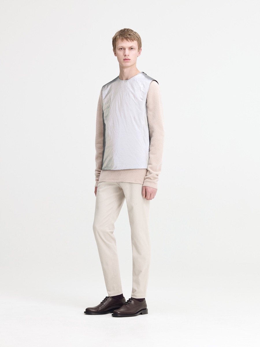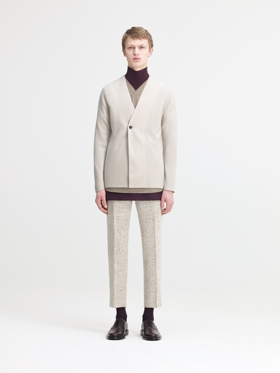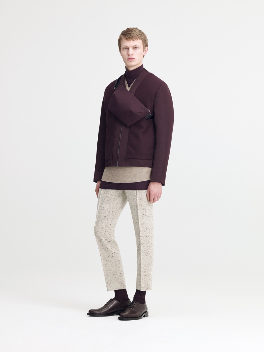 COS explores modular styles with performance gear serving as muse for fashions finished with straps, zips and eyelets. Slim tailoring includes cropped pleated trousers and jackets that embrace a cocoon wrap silhouette. Made from textured wool, the collection’s jackets and coats are paired with fitted turtlenecks and simple pullovers. The range is completed with padded fingerless gloves and for footwear–brown oxford shoes and raw-edge leather sneakers.