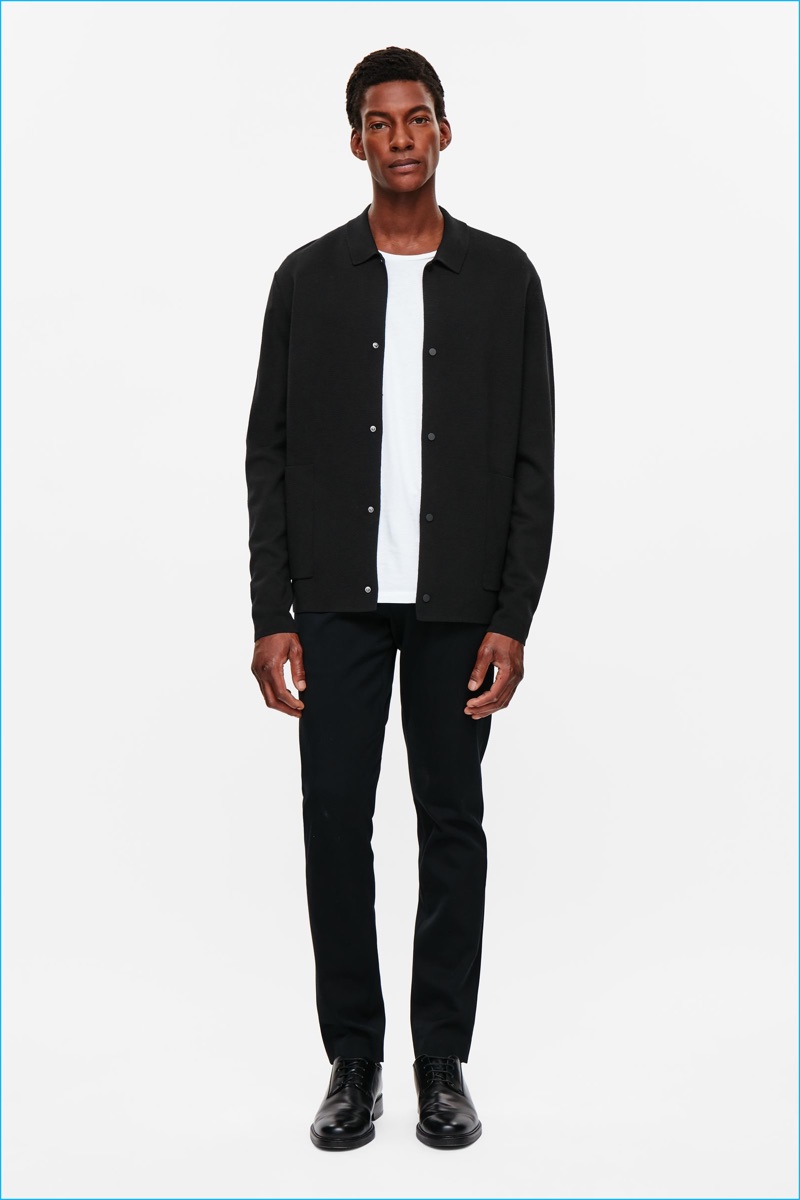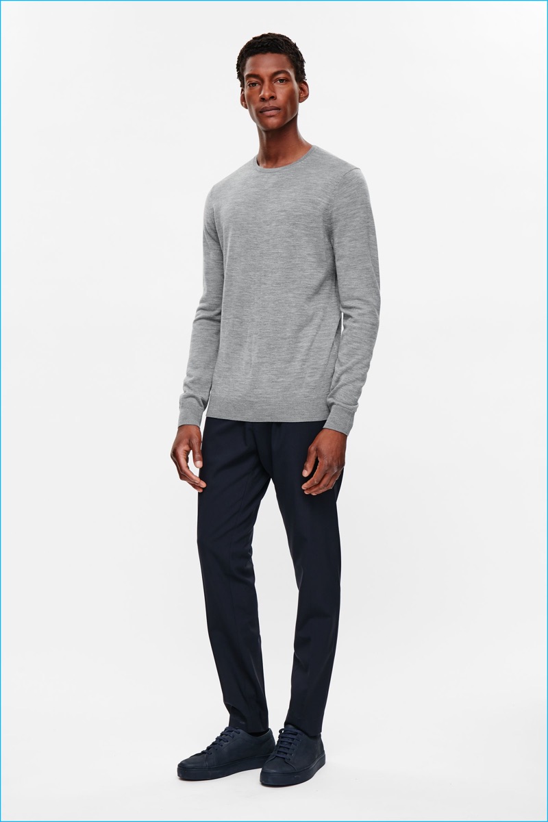 Ty Ogunkoya models a wool and yak sweater with a smart shirt and slim-fit pants from COS' fall-winter 2016 men's essentials collection.Pin