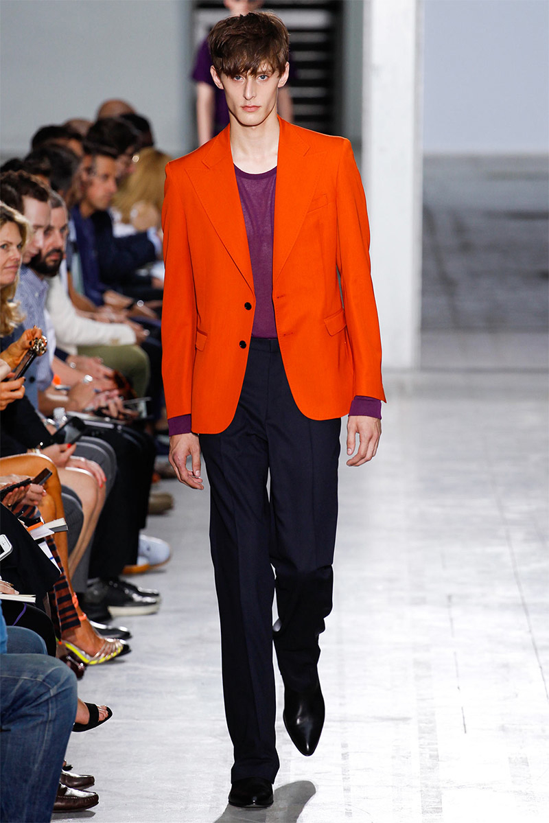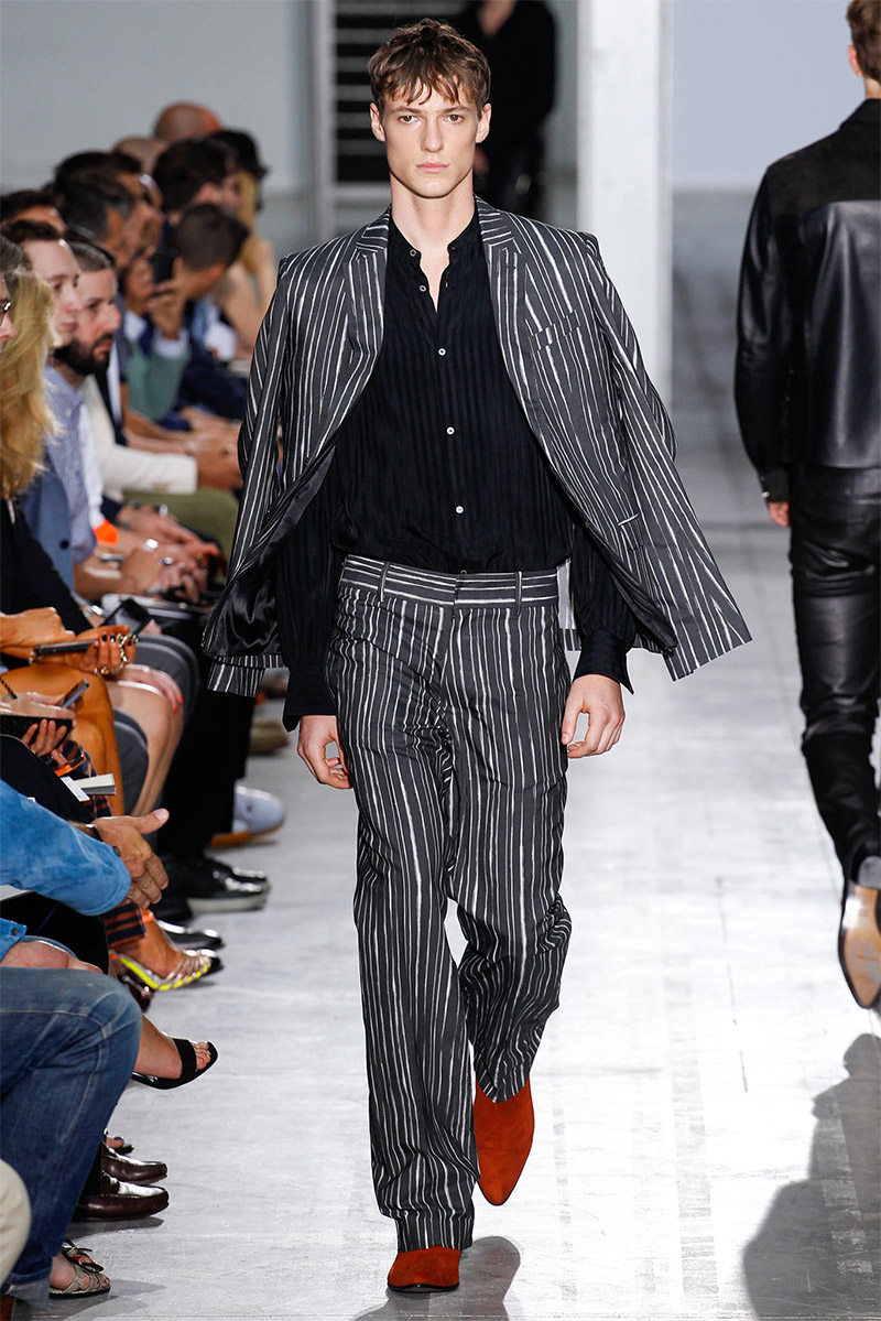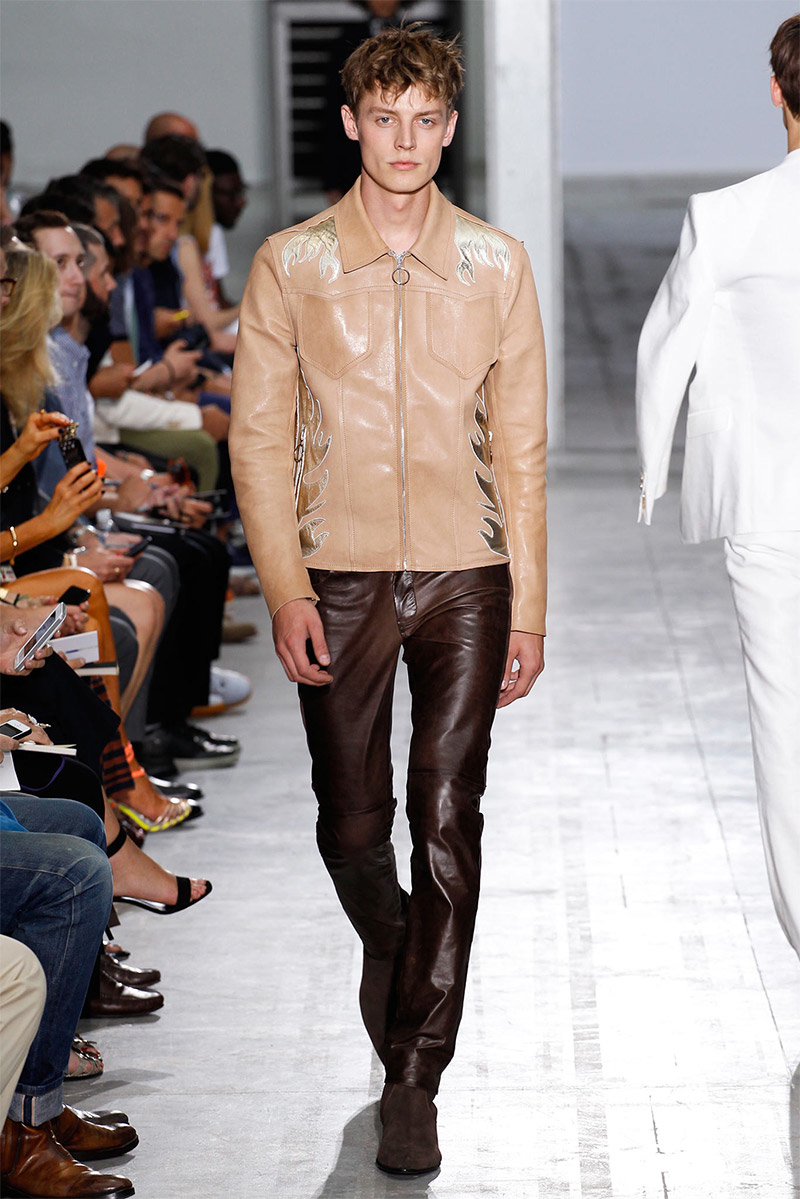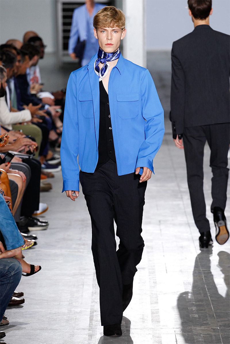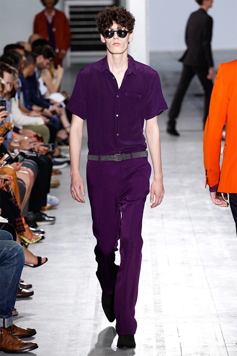 Costume National Homme Spring/Summer 2015Costume National creative director Ennio Capasa delivered another rock ’n’ roll fueled outing for spring/summer 2015. Citing personal music icons that have inspired his own style, Capasa looked to Mick Jagger, David Bowie, Lou Reed, Bob Dylan, John Lennon, Jimi Hendrix and Keith Richards for inspiration. Capasa explained, “They all express a sense of liberated elegance. It is time to look at the future with fresh eyes, abandon cliche, surprise with a free spirit.” Culminating in a collection with references to the 1970s, shirts of gauze were cut slim, while pants came in flared and skinny fits. Meanwhile, biker jackets were repurposed for a colorful champion of the season that seamlessly transitioned from relaxed suiting with large lapels to fitted viscose knitwear, stylish ankle boots and chic neckties.