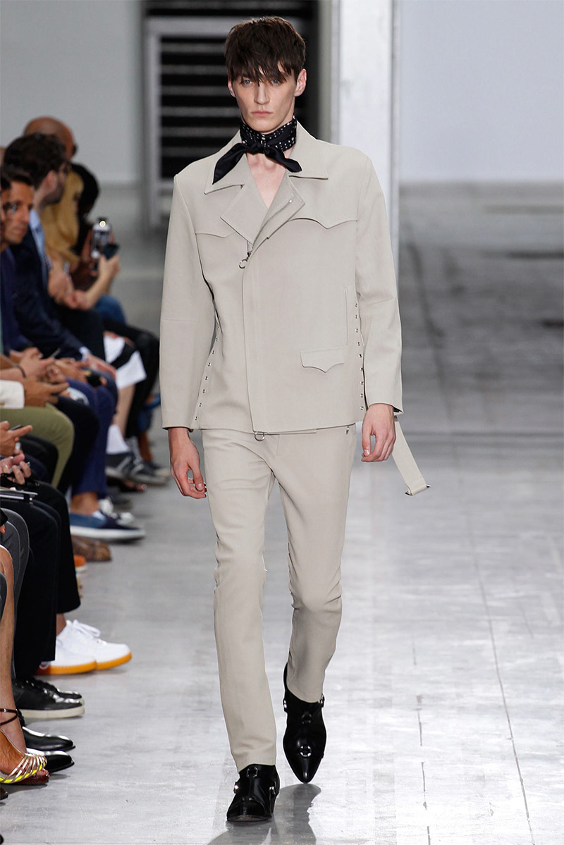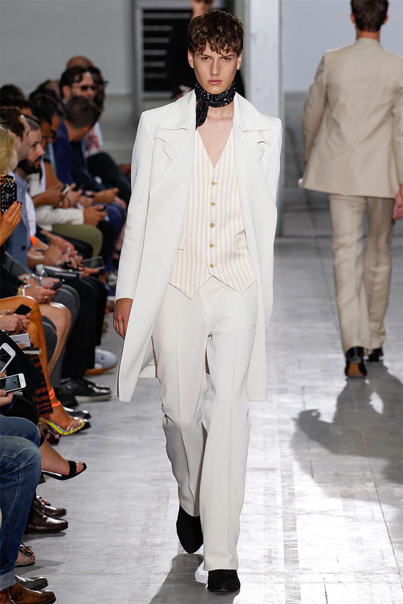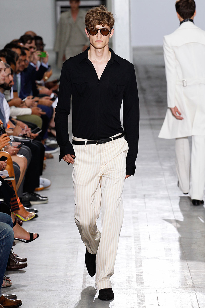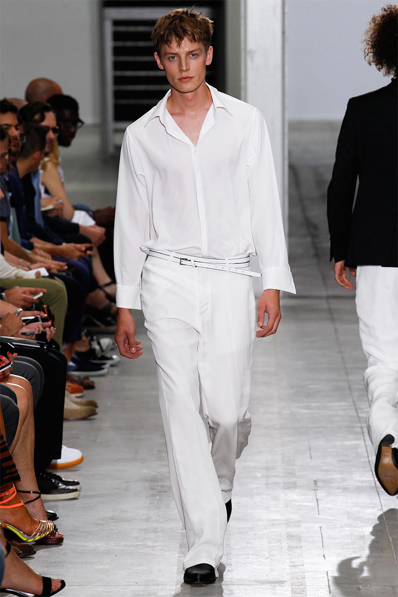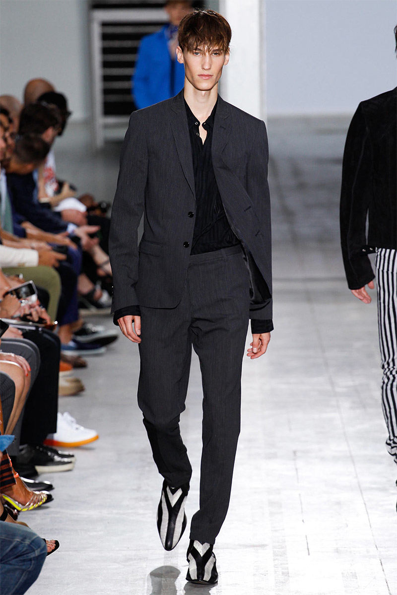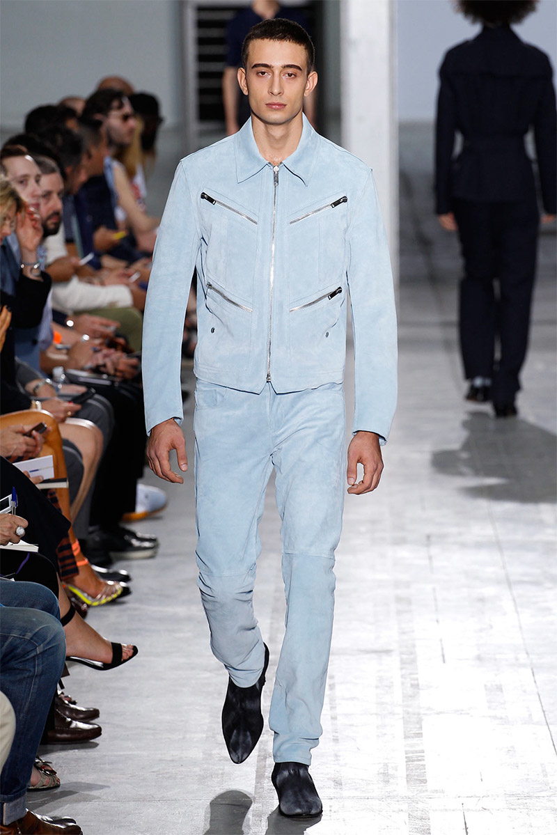 Costume National Homme Spring/Summer 2015Costume National creative director Ennio Capasa delivered another rock ’n’ roll fueled outing for spring/summer 2015. Citing personal music icons that have inspired his own style, Capasa looked to Mick Jagger, David Bowie, Lou Reed, Bob Dylan, John Lennon, Jimi Hendrix and Keith Richards for inspiration. Capasa explained, “They all express a sense of liberated elegance. It is time to look at the future with fresh eyes, abandon cliche, surprise with a free spirit.” Culminating in a collection with references to the 1970s, shirts of gauze were cut slim, while pants came in flared and skinny fits. Meanwhile, biker jackets were repurposed for a colorful champion of the season that seamlessly transitioned from relaxed suiting with large lapels to fitted viscose knitwear, stylish ankle boots and chic neckties.