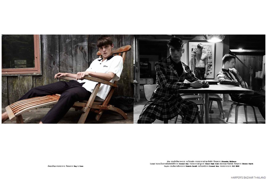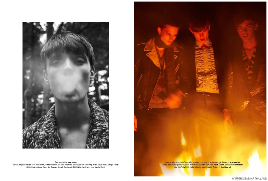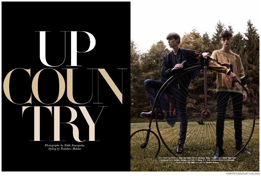 Up Country-Embracing the harvest feel of fall, Fusion models Mike Winchester and Gustaaf Wassink join Brayden Pritchard for the most recent issue of Harper Bazaar Thailand. Photographed by Natth Jaturapahu and styled by Yoshihiro Hidaka, the trio head outdoors for a picturesque country shoot. Standout fashions for the eclectic style outing include the likes of Saint Laurent and Paul Smith. / Photo assistance by Anthony Asaro. Makeup by Kento Utsubo. Hair by Shingo Shibata.