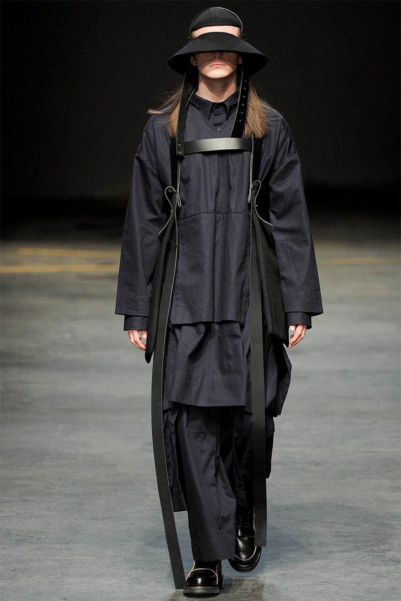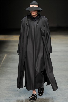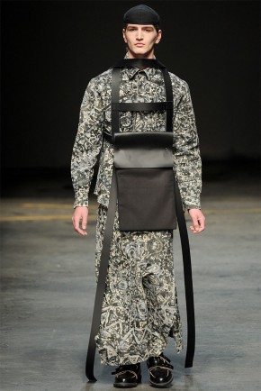 Craig Green Fall/Winter 2014–Designer Craig Green created a dark lineup of uniform-inspired ensembles for his fall/winter 2014 collection. Coordinating an obsessive range of long monochromatic looks, dressed either in black or in ornate prints, the designer exerted a romantic hand, transforming the uniform into an aspirational mode. Floor length coats, layered tops and billowing trousers contributed to Green’s modern uniform.