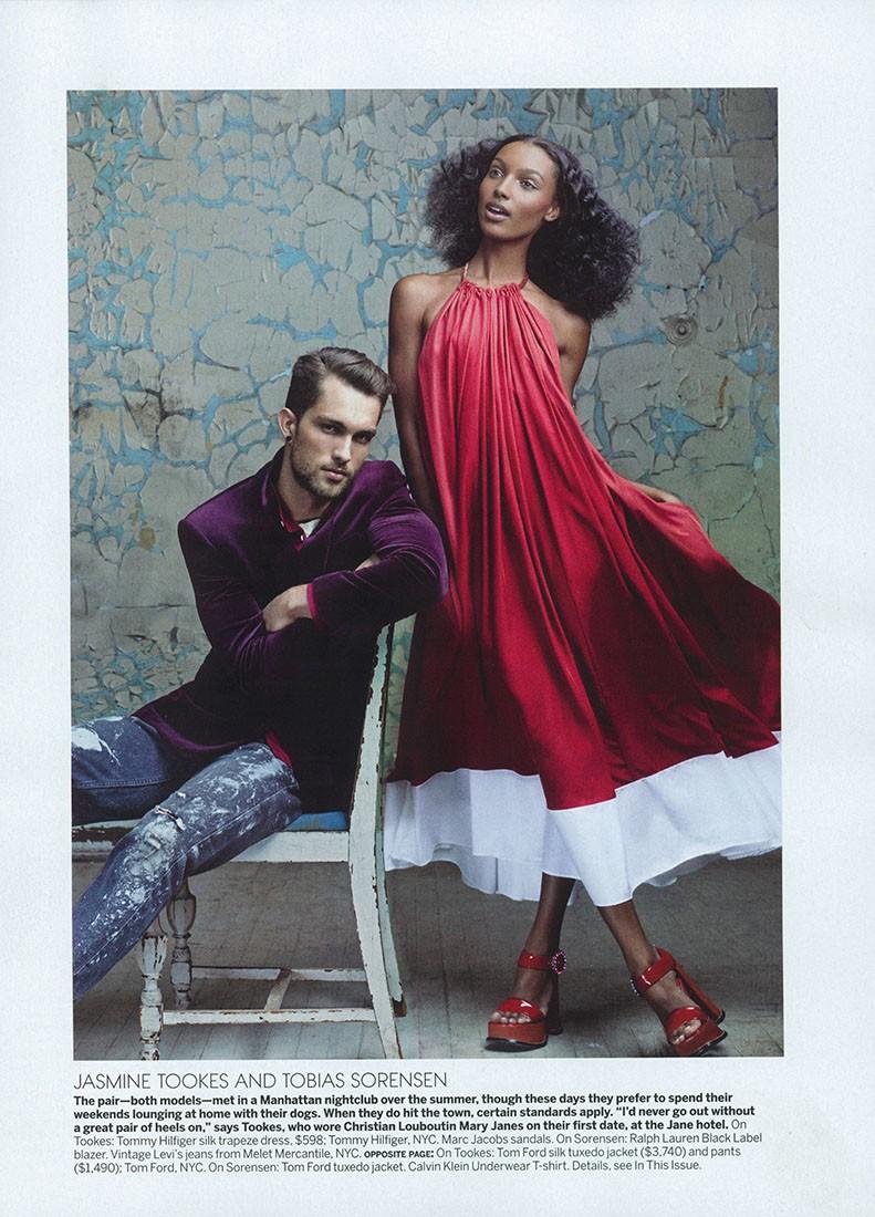 A Little Romance–For the February 2013 issue of American Vogue, model Tobias Sørensen enters the studio to appear alongside his girlfriend, model Jasmine Tookes, in front of Craig McDean’s lens in a story focused on the unconventional side of New York’s nights. Styled by Camilla Nickerson in vintage jeans, velvet blazers and glamorous tuxedo jackets, Tobias is definitely a vision of contemporary refinement. / Hair by James Pecis. Makeup by Aaron de Mey.