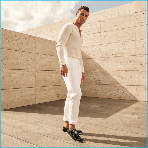 In addition to starring in a shoot for Dazed, Cristiano Ronaldo continues as the face of his brand CR7 Footwear. Fronting the spring-summer 2016 campaign, Ronaldo embraces sleek styles to complement his latest range of shoes. Loafers, oxfords and chukka boots are front and center for the occasion with Ronaldo donning summer tailoring and sportswear.
