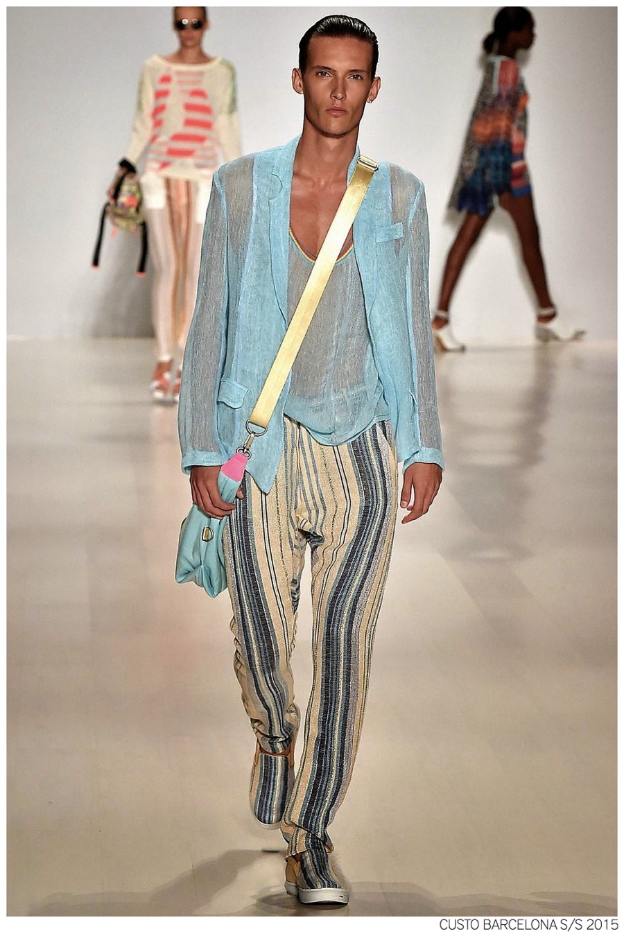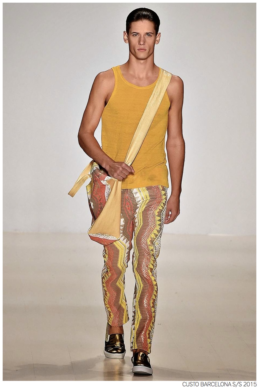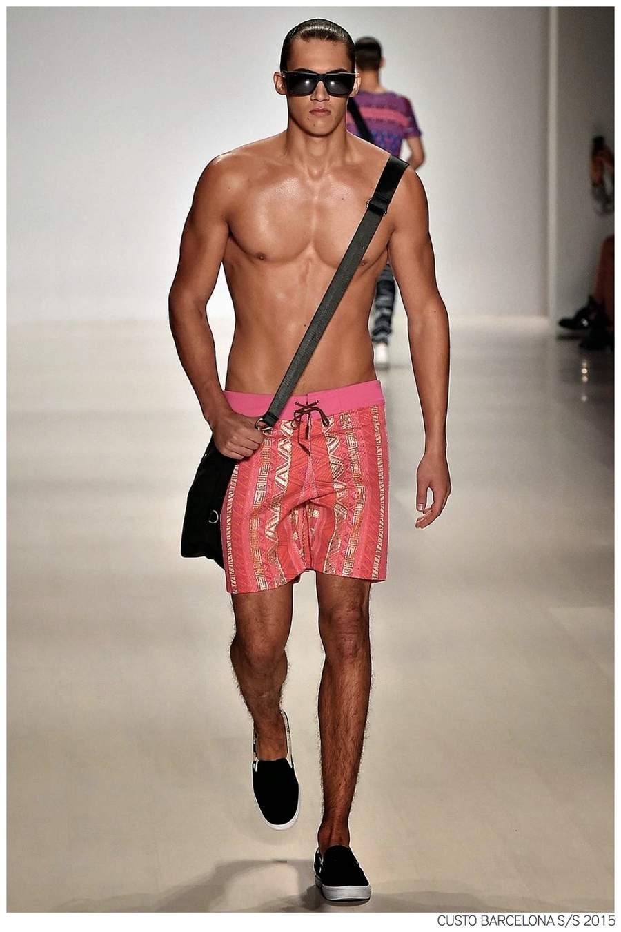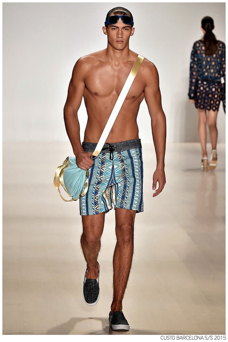 Known for embracing a soft, more demure side to menswear, but nevertheless lively, Custo Barcelona hit the catwalk with a new spring collection during New York Fashion Week. Svelte and groomed to a t, models walked the runway with semi-lean lines and a wardrobe exploding with color. Printed, graphic t-shirts were matched with board shorts. Meanwhile, sheer materials held a certain allure, draped and layered. On the other hand, jackets carried the lightness and ease of button-downs and were the perfect companion to tanks and slouchy shorts.