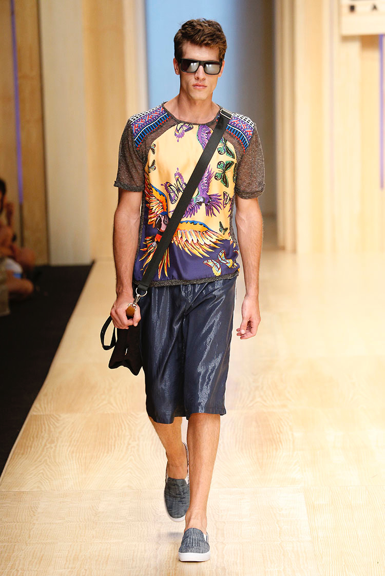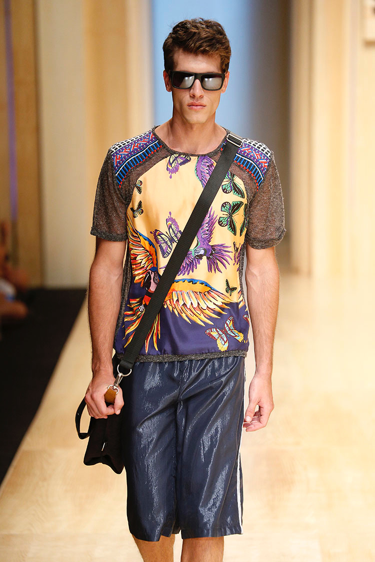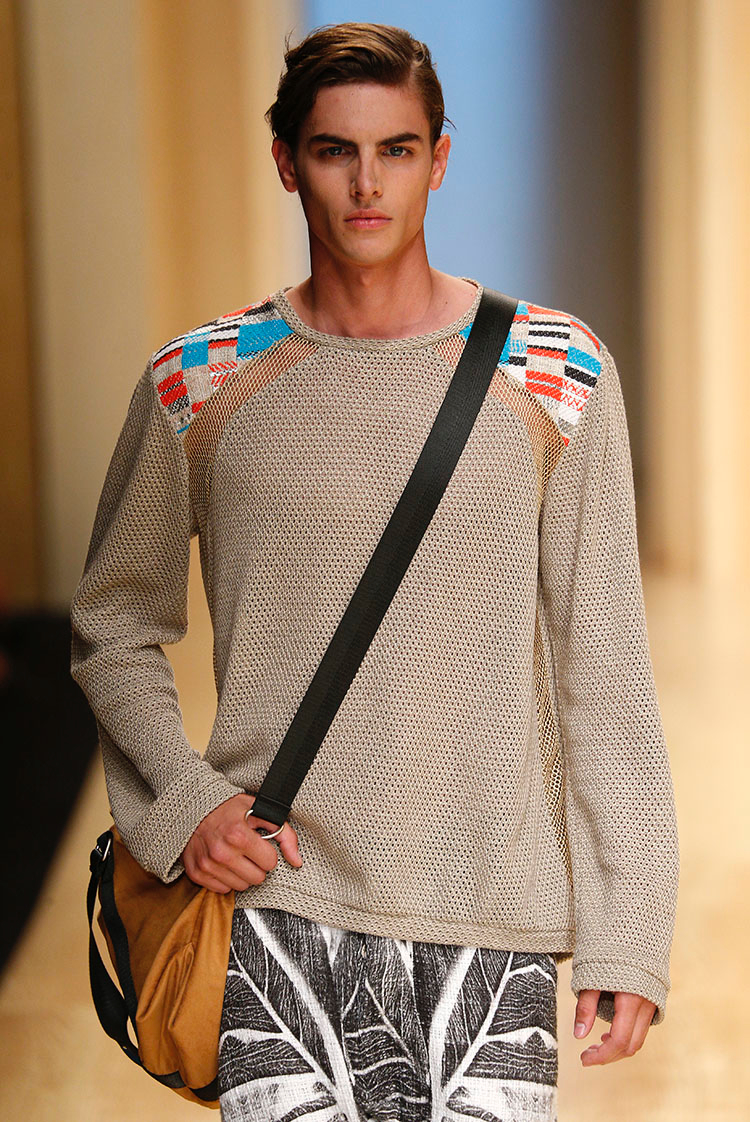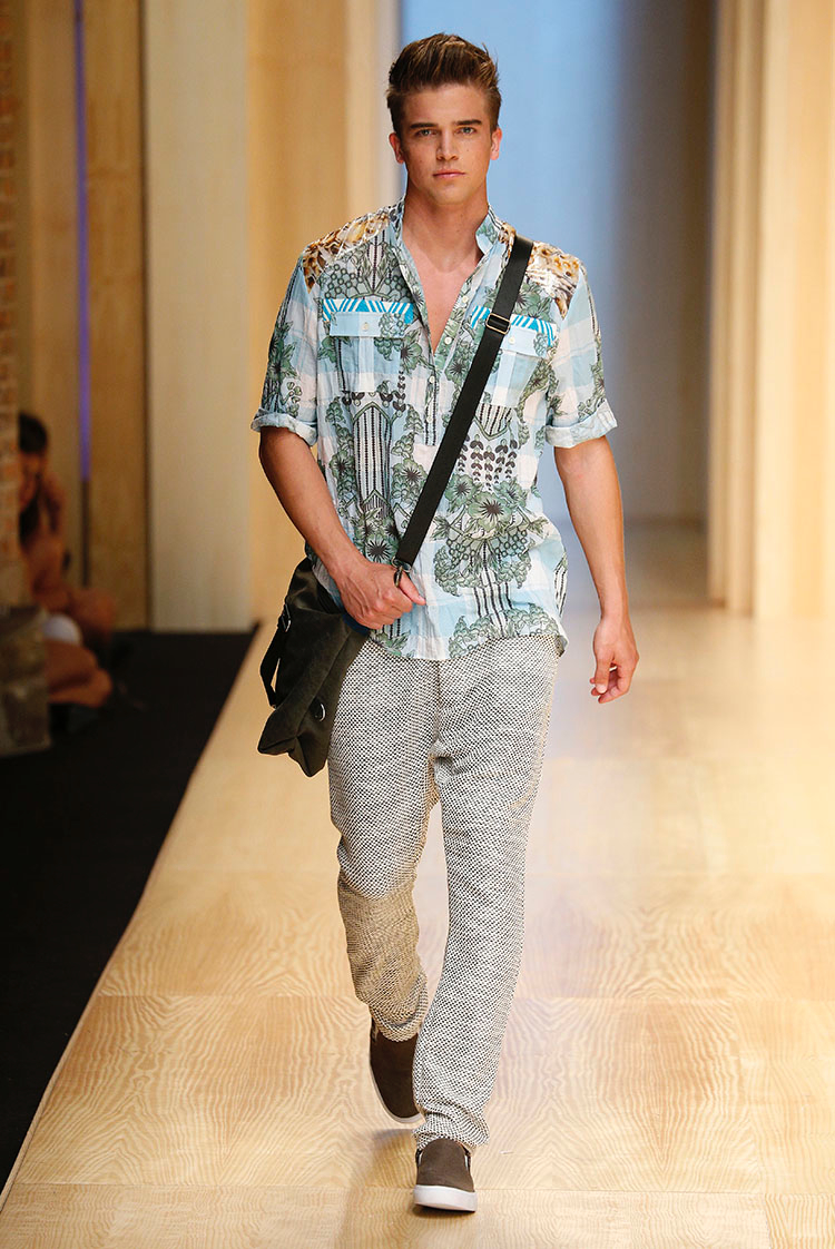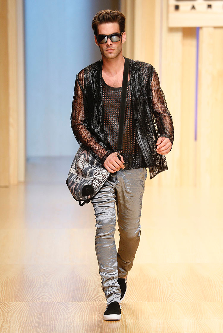 Custo Barcelona Spring/Summer 2015–080 Barcelona Fashion continued with Custo Barcelona showing a bright lively outing for spring/summer 2015. Tackling casual ensembles with a bold personality, relaxed silhouettes dominated the graphic show. Mesh and iridescent fabrics came together with intricate patterns for a standout wardrobe that included lightweight knitwear, breathable tops, slim-cut pants and accessories for the man of leisure on the go.