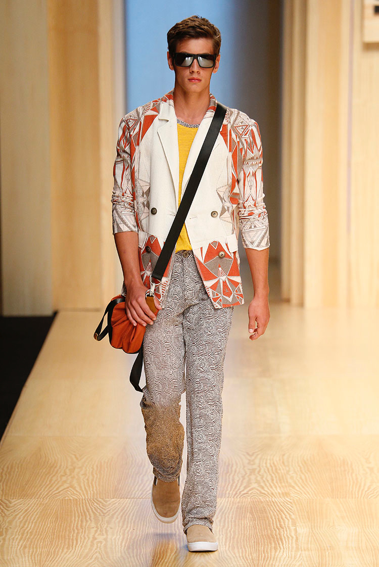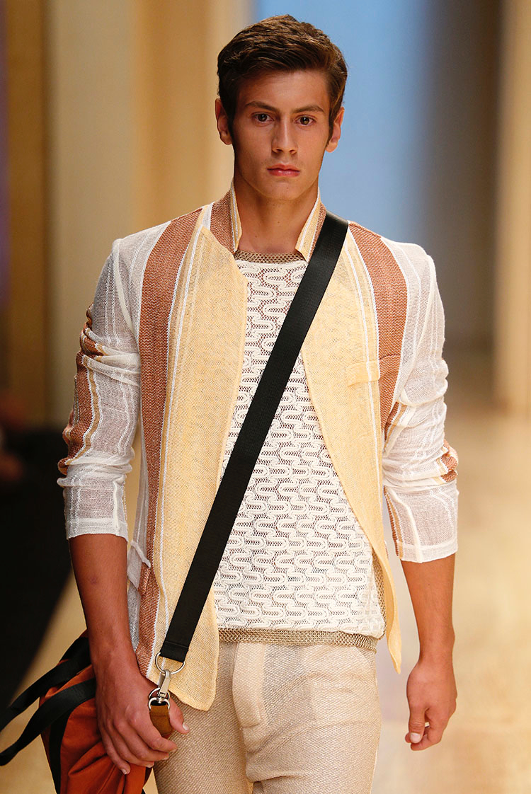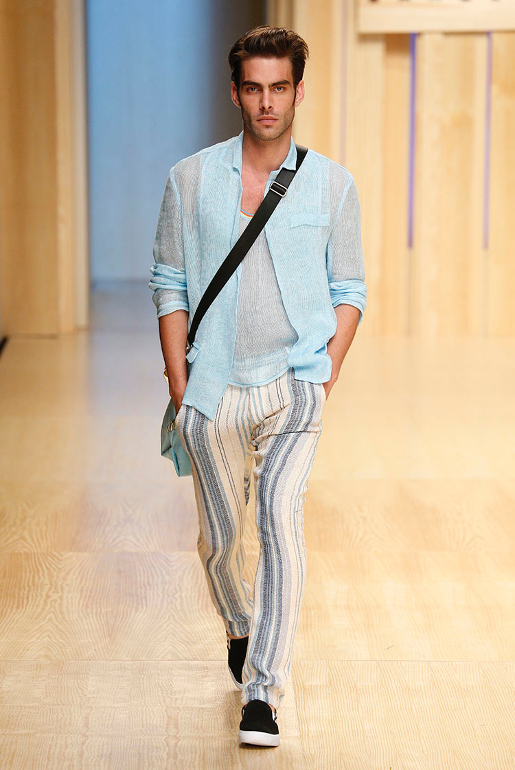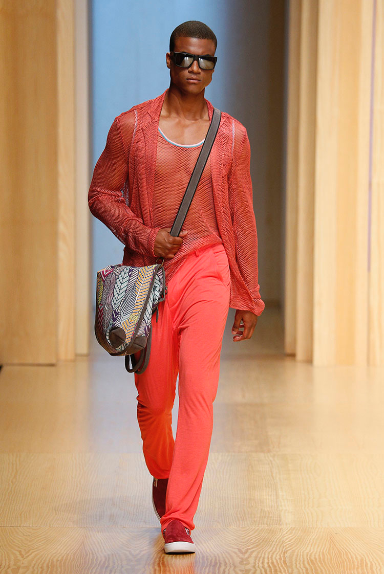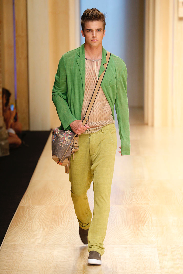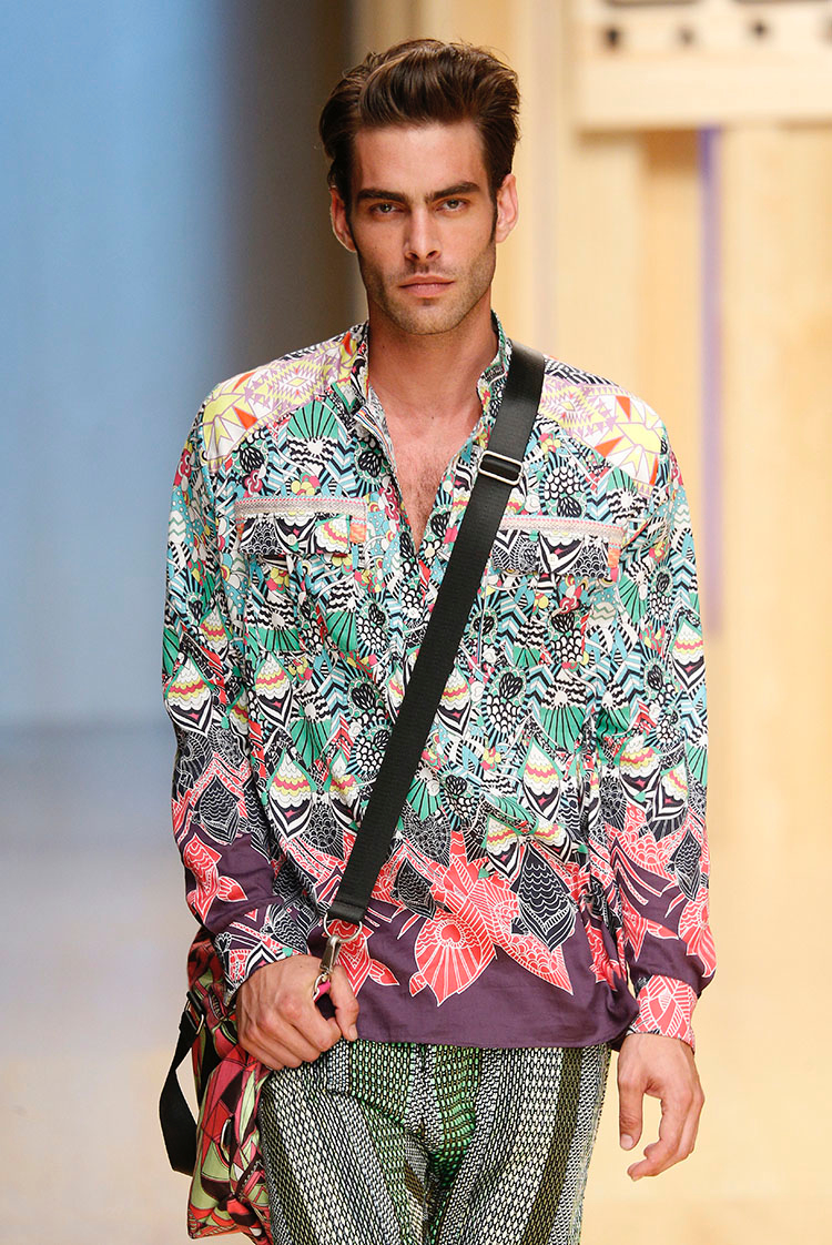 Custo Barcelona Spring/Summer 2015–080 Barcelona Fashion continued with Custo Barcelona showing a bright lively outing for spring/summer 2015. Tackling casual ensembles with a bold personality, relaxed silhouettes dominated the graphic show. Mesh and iridescent fabrics came together with intricate patterns for a standout wardrobe that included lightweight knitwear, breathable tops, slim-cut pants and accessories for the man of leisure on the go.