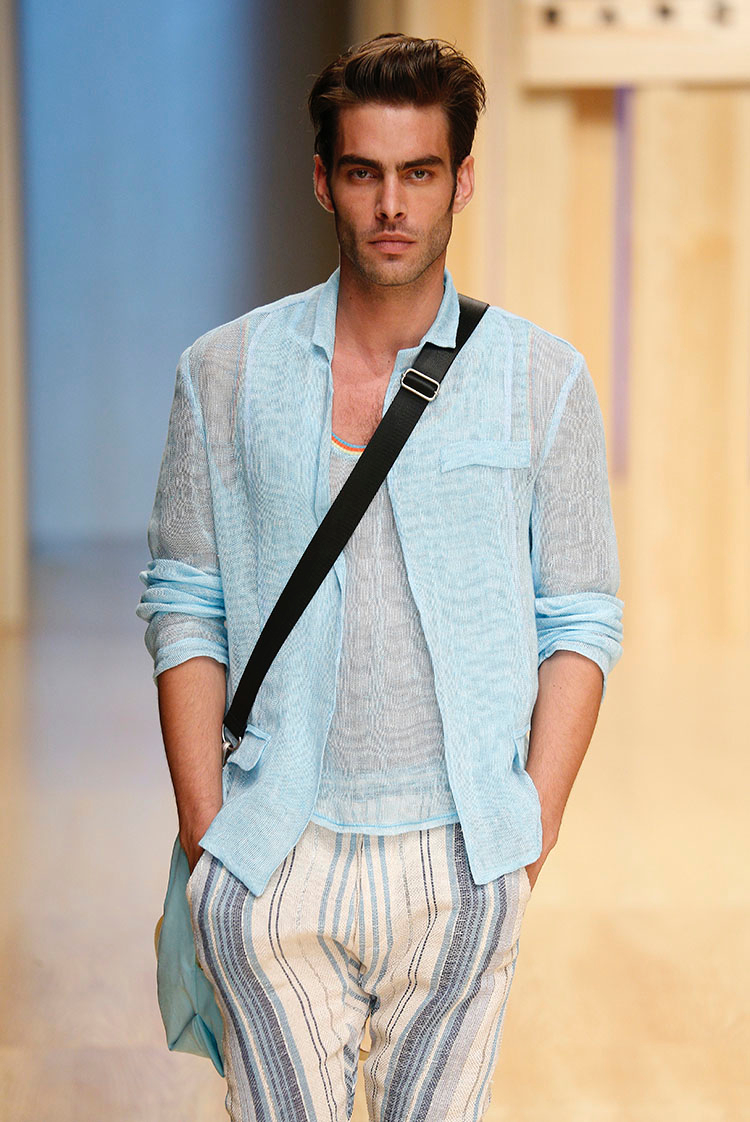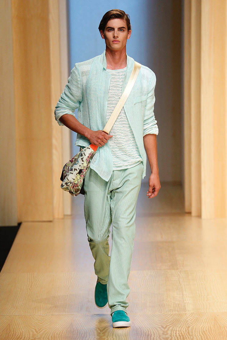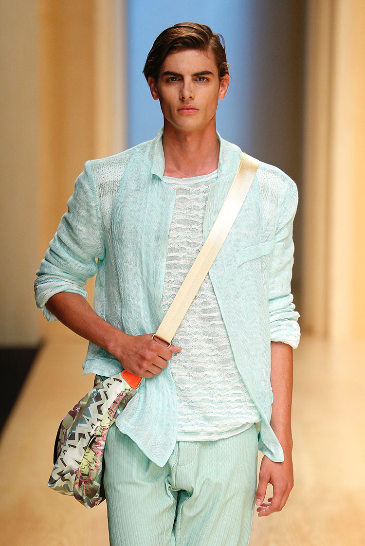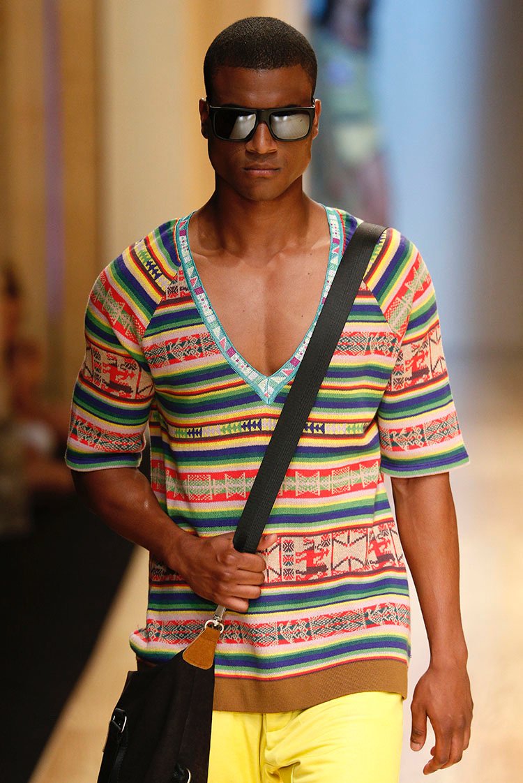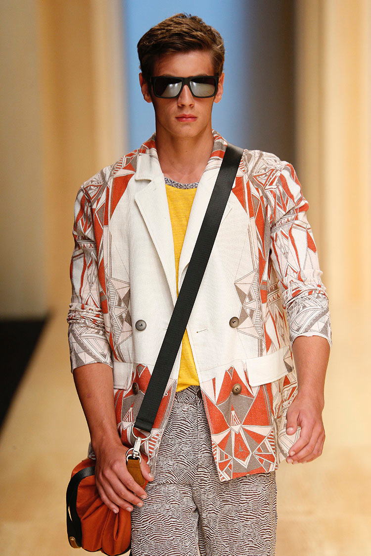 Custo Barcelona Spring/Summer 2015–080 Barcelona Fashion continued with Custo Barcelona showing a bright lively outing for spring/summer 2015. Tackling casual ensembles with a bold personality, relaxed silhouettes dominated the graphic show. Mesh and iridescent fabrics came together with intricate patterns for a standout wardrobe that included lightweight knitwear, breathable tops, slim-cut pants and accessories for the man of leisure on the go.