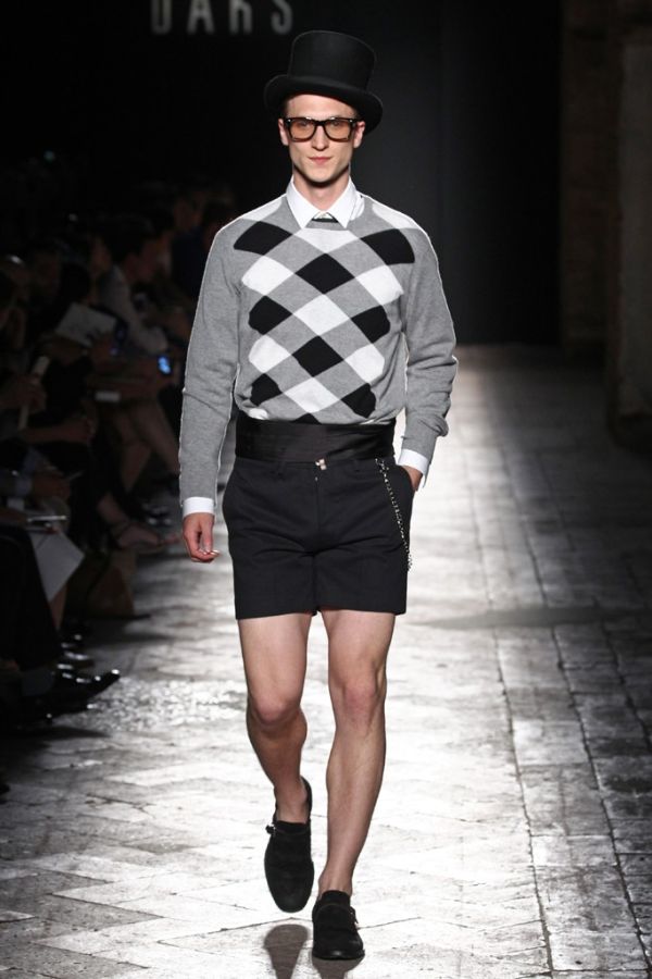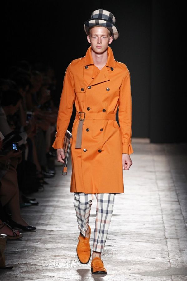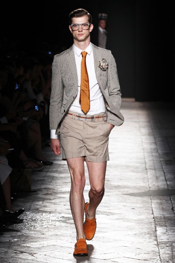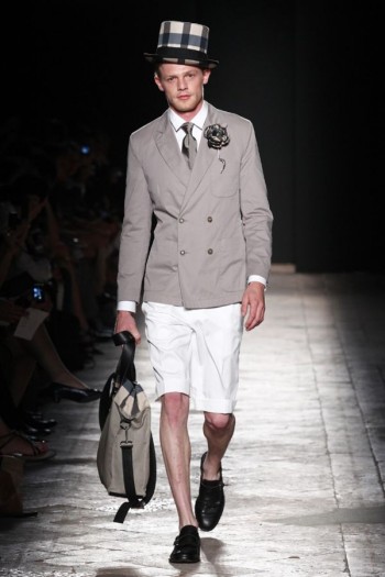 Dapper Elegance–For their spring/summer 2013 collection, Daks translates smart, iconic formal wear into a modern context. Featuring top hats, cummerbunds, and bow ties, Daks pulls references from a sharp man’s wardrobe of a previous century. However, with an iconic trench coat in vibrant orange, sleek shorts paired with crisp suiting, and the streamlined double-breasted jacket, Daks, while reminiscent of the past, doesn’t wander too far down memory lane. Rather, the staples felt updated, and the mood was playful, reflected in the lively pops of orange and the bold patterns of plaid and diamonds woven throughout the collection. The motif continues with the top hats, and even the thick-rimmed glasses, that embrace a nostalgic whimsy while dancing along the contemporary silhouette. Taking a nod towards the past while considering the modern man, Daks fuses classics with a lighthearted sophistication fit for any gentleman.